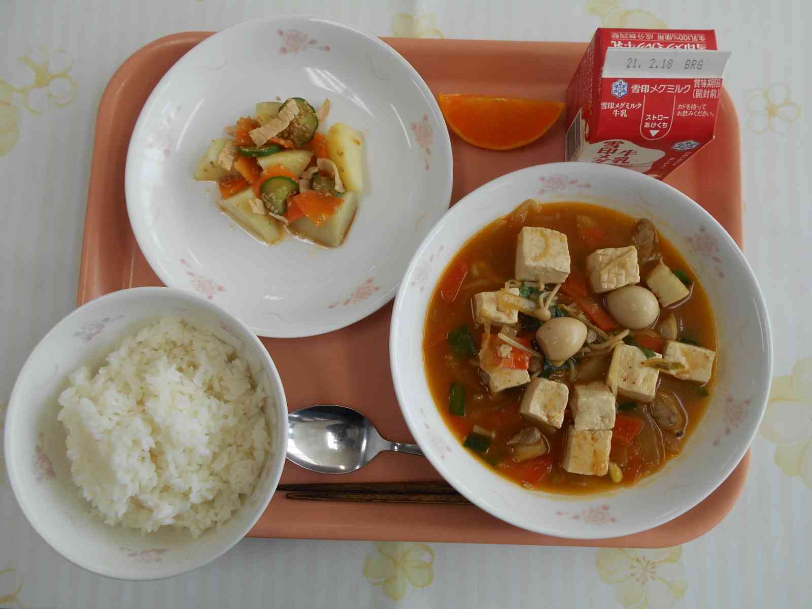 ○牛乳 ○ご飯 ○豆腐チゲ ○じゃが芋中華サラダ ○せとか ☆一口メモ☆ チゲは、韓国語でなべ料理のこと。「チゲなべ」という料理名を聞いたことがありますか。実はチゲという言葉自体が「なべ」を意味しているので、チゲなべは「なべなべ」と二重に言っていることになってしまいます。今日の豆腐チゲは、あさりとイカの海鮮のうまみと、豚肉のお肉のうまみ、両方が味わえる温かい料理です。