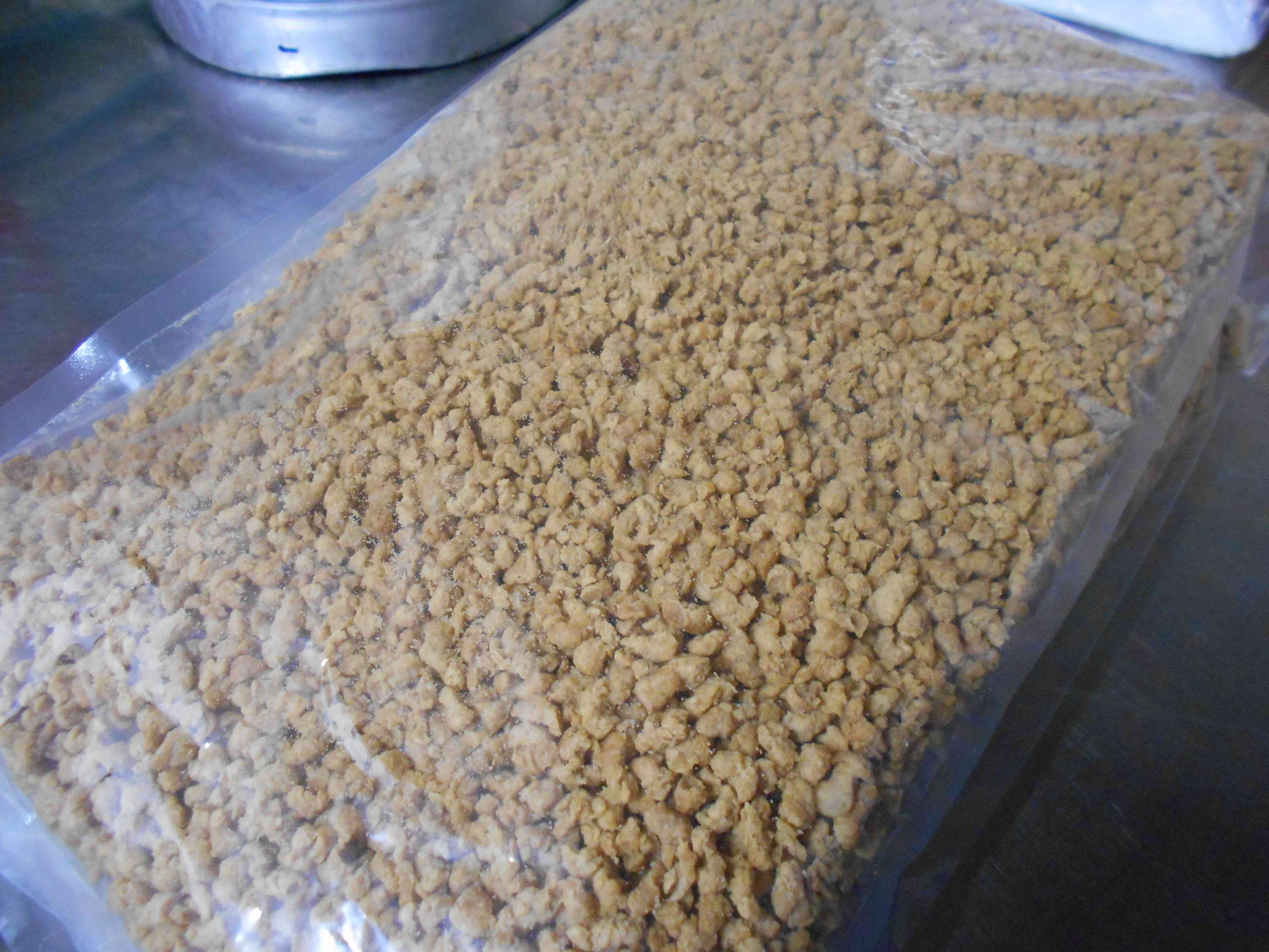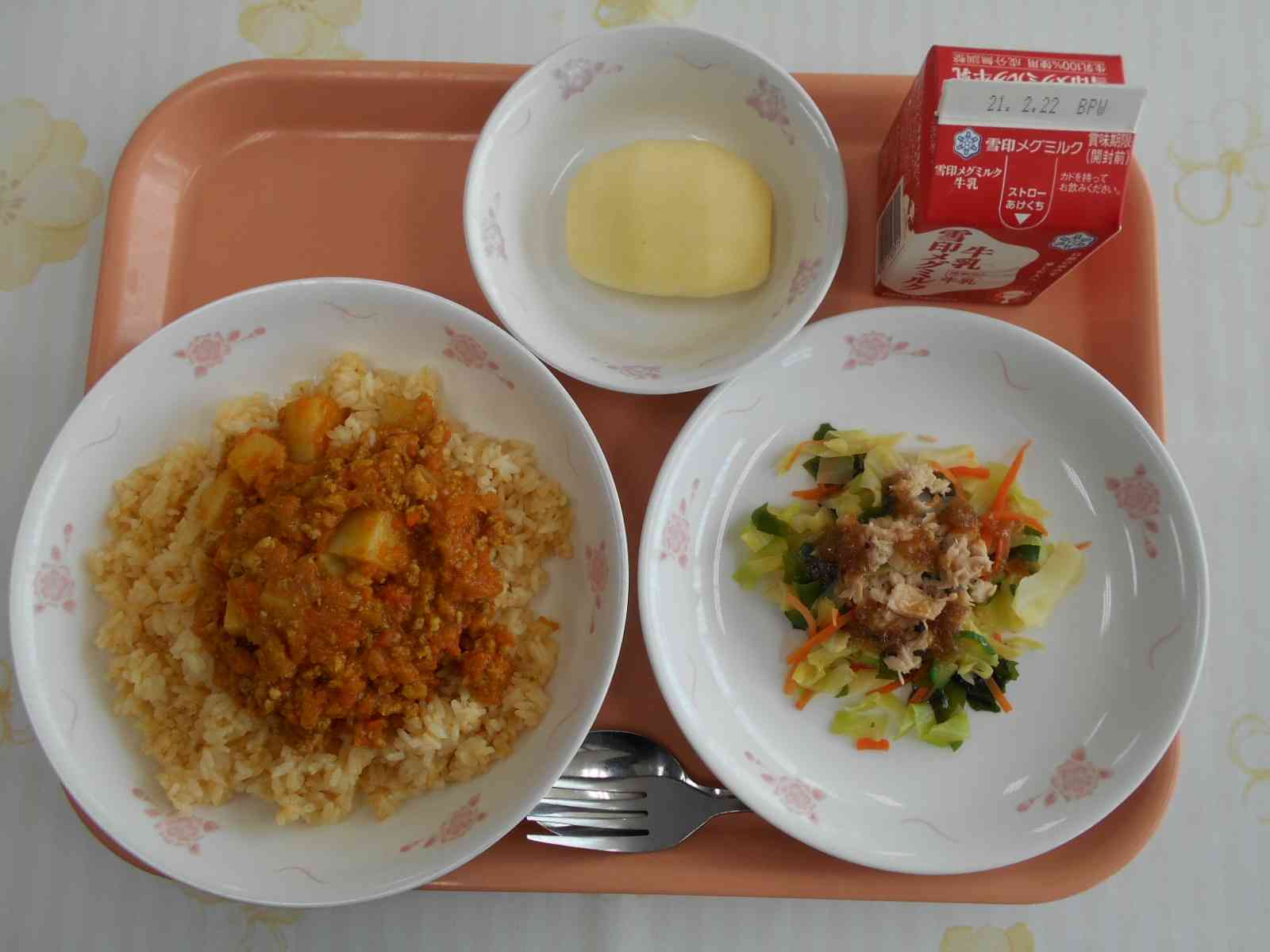 ○牛乳 ○ドライカレー(大豆ミート入り) ○ツナとわかめのサラダ ○りんご ☆一口メモ☆ ドライカレーのひき肉の半量を大豆からできた大豆ミートを使いました。大豆ミートの材料は、大豆100パーセント。お肉を使っていませんが、まるでお肉のような食感をしています。世界には、宗教や信条、環境への考え方から、動物のお肉ではなく、植物性の大豆ミートを選んで食べている人がいます。特に、スウェーデンなどの北欧には地球温暖化防止のことを考えて、大豆ミートを選んで食べている人の割合が、他の国と比べて多いそうです。世界には、自分の思想や考えに基づいて、さまざまな食の選択をする人がいることを知ってもらうために、大豆ミートを給食に取り入れてみました。 写真2枚目 大豆からできたお肉は、ベジミート・ソイミートや粒状大豆たんぱくとも呼ばれています。植物由来なので、コレステロールがゼロ、お肉より脂肪が少ないという栄養面のメリットがあると思います。 乾燥した状態で売っているので、お湯に10分以上つけて、戻してから使いました。見た目は、ちょっと大きめのひき肉のようで、牛肉のミンチに近い弾力のある食感になります。写真は、お湯で戻す前の大豆ミートです。 写真3枚目 ドライカレーは、野菜もとれるように、たまねぎとにんじんもたっぷり使っています。時間をかけてよく炒めて、野菜のうまみをひきだして作りました。【添付ファイル】