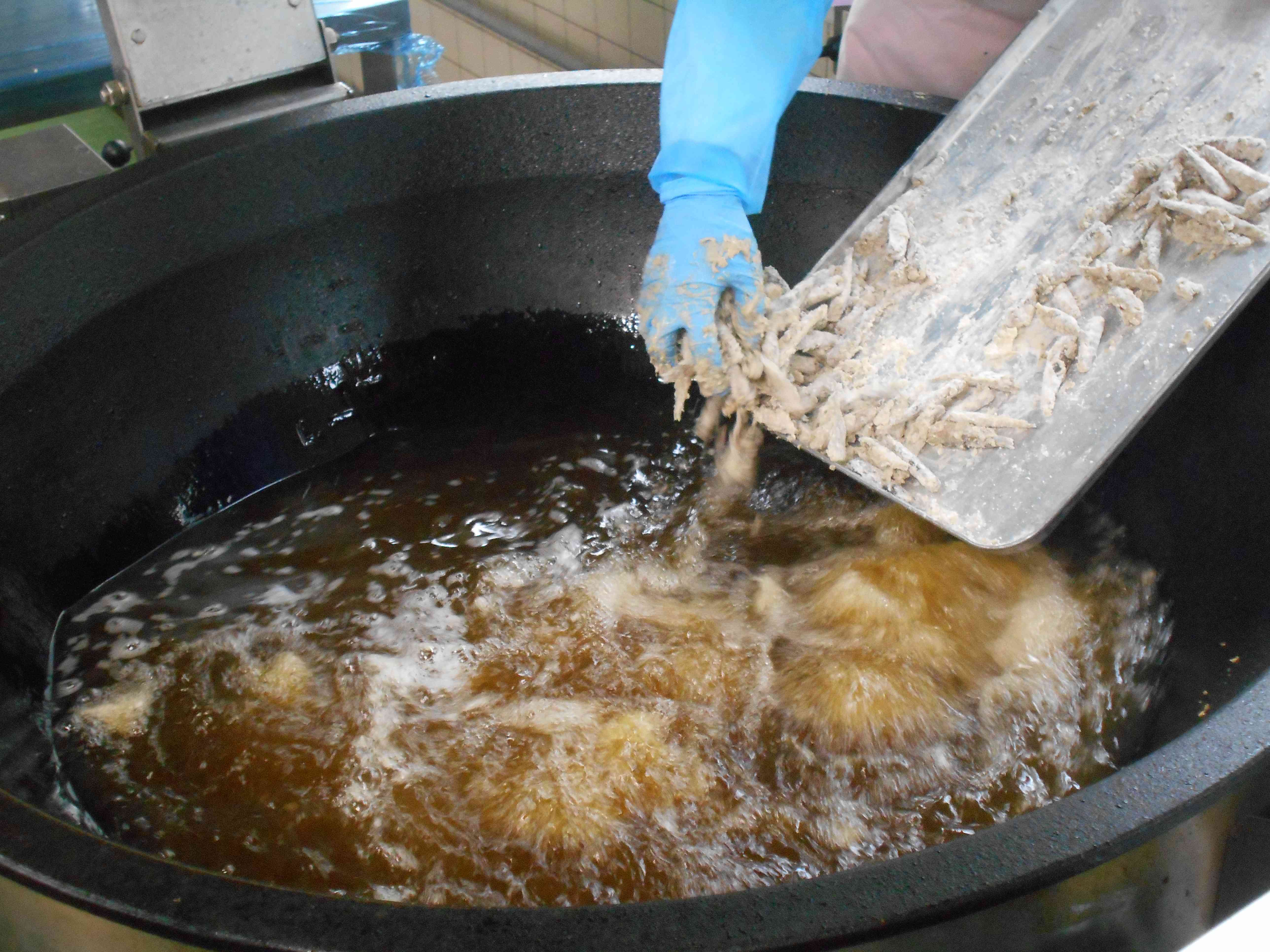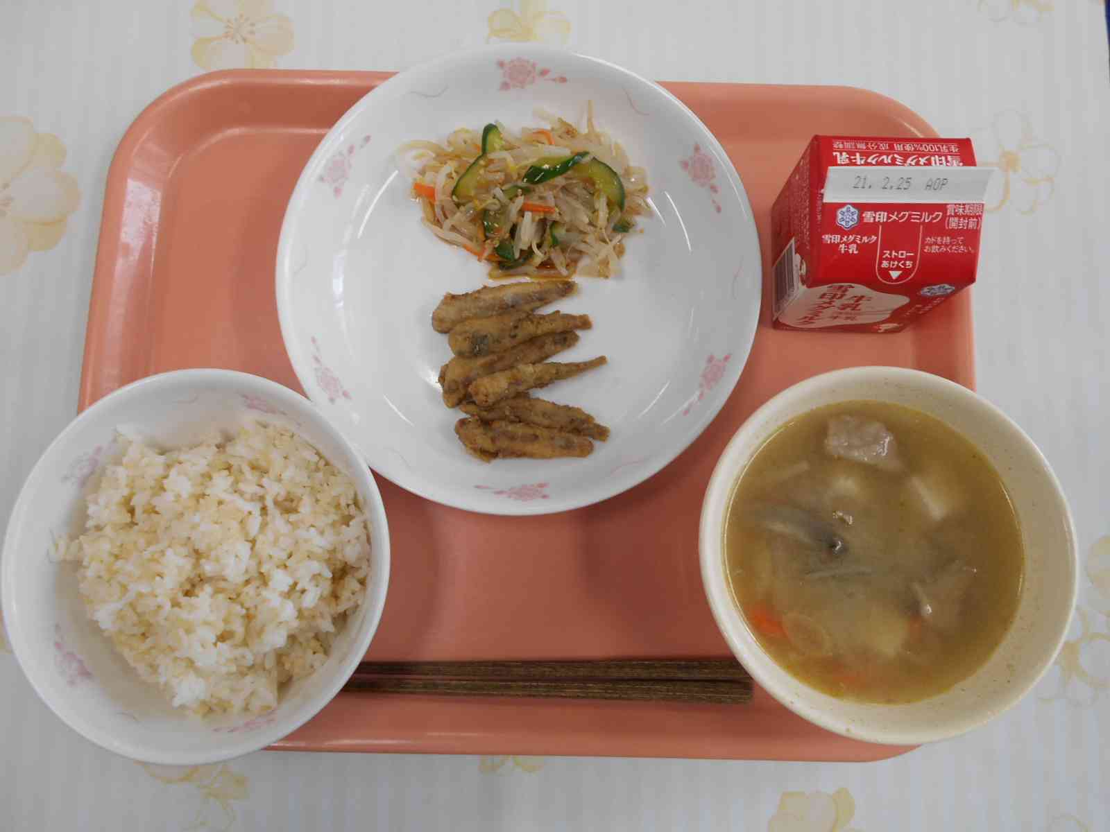 ○牛乳 ○玄米(げんまい)入りご飯 ○小鰯(こいわし)のから揚げ ○もやしサラダ ○豚汁 ☆一口メモ☆ かみかみ献立です。精白されていない玄米、骨ごと食べられる小いわし、どちらもよくかんで食べましょう。食べ物をよくかんで食べることは、良い効果があることが知られています。よくかむとだ液がたくさん出て、食べ物が飲み込みやすく、消化されやすくなり、胃腸の負担が減ります。また、脳の血流がよくなることから、脳が活発に働き、集中力もアップします。さらに、脳内でセロトニンという物質が出て、気持ちを落ち着かせてくれます。よくかむことのは、このように脳にも良いことがあります。2月の下旬には、テストが控えています。毎日の食事のときは、よくかむことを意識してみませんか。 写真2、3枚目 広島県産の小いわしを使いました。カタクチイワシのことですが、広島県でとれたものは、小いわしと呼ばれています。魚屋さんが、いわしの頭を取り除いたものを納品してくれたので、苦味が少ない小いわしでした。給食室で、下味、粉をつけて揚げました。 写真4枚目 ごはんには、玄米を3割混ぜて炊きました。ロウカット玄米を使っています。玄米の表面の一番外側のロウと呼ばれる部分だけ取り除いた玄米です。一般的な玄米よりも、ふっくらと炊くことができるので、玄米を食べ慣れていない人にも食べやすくなっています。【添付ファイル】
