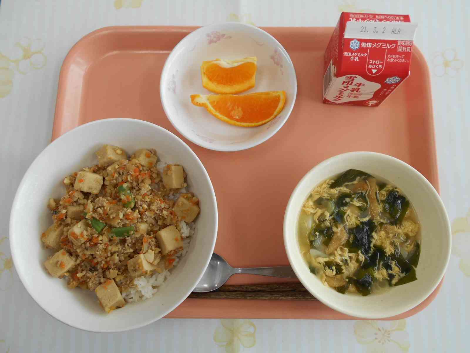 ○牛乳 ○高野豆腐(こうやどうふ)のそぼろ丼 ○じゃが芋と卵の味噌汁 ○いよかん ○デコポン ☆一口メモ☆ 国産のかんきつ類が旬を迎えています。2種類のかんきつ類を食べ比べてみましょう。 今の時期は、いよかん、デコポン、はるか、せとかなどのさまざまなかんきつ類が、店頭に並んでいます。今日は、「いよかん」と「デコポン」2つを提供しました。どんな違いがあるでしょうか。果物にはそれぞれ個性があり、個性を見つけて自分の好きな果物を見つけてみましょう。【添付ファイル】