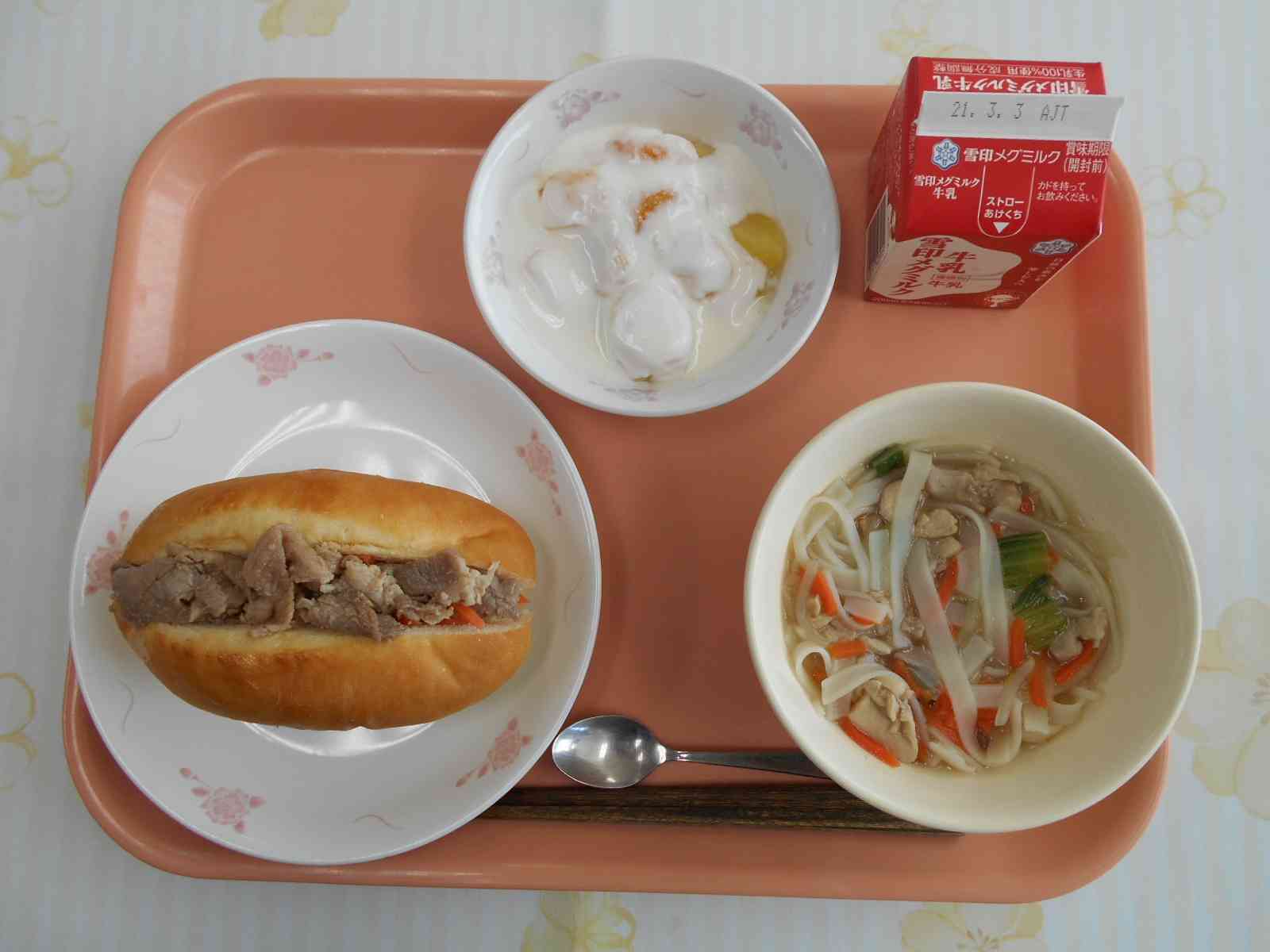 <ベトナムの味めぐり> ○牛乳 ○バインミー(ベトナム風サンドパン) ○フォーのスープ(米粉の平麺スープ) ○フルーツのヨーグルト添え ☆一口メモ☆ ベトナムの味めぐりです。バインミーとフォーのスープがベトナムの料理です。バインミーはベトナム語で、小麦粉のもち=「パン」を意味しています。やわらかいフランスパンにレバーペースト、紅白なますなどの野菜、肉をはさんだサンドイッチです。ベトナムは、かつてフランスの植民地でした。ベトナムの主食は、お米が基本ですが、フランスからもたらされたパン文化が、ベトナム全土に広がっていきました。バインミーも植民地時代に生まれた料理です。 フォーは、ベトナム料理に使われる平たい麺です。スパゲッティやうどんは、小麦粉から作る麺ですが、フォーは、お米の粉から作ることが特徴です。【添付ファイル】
