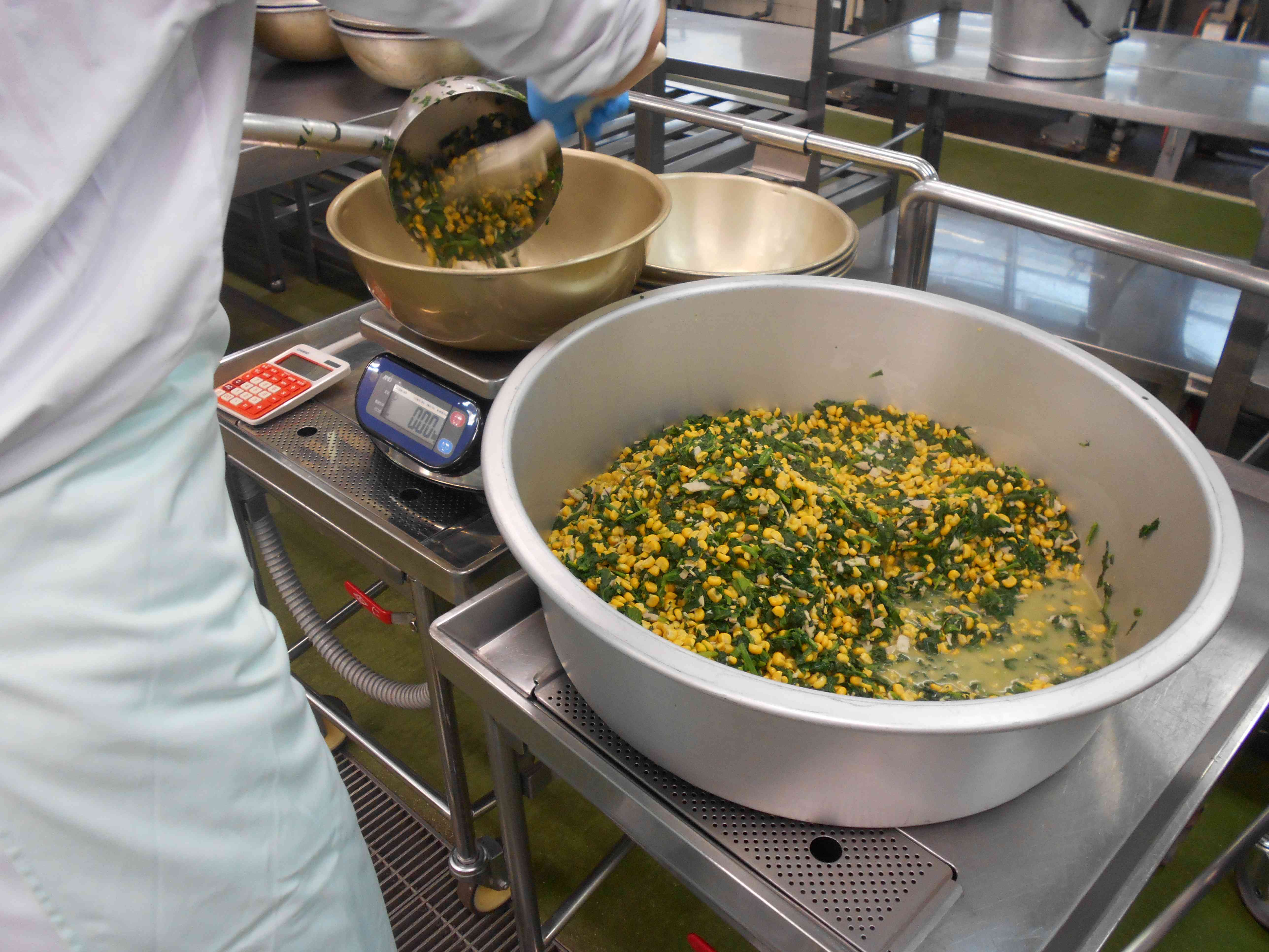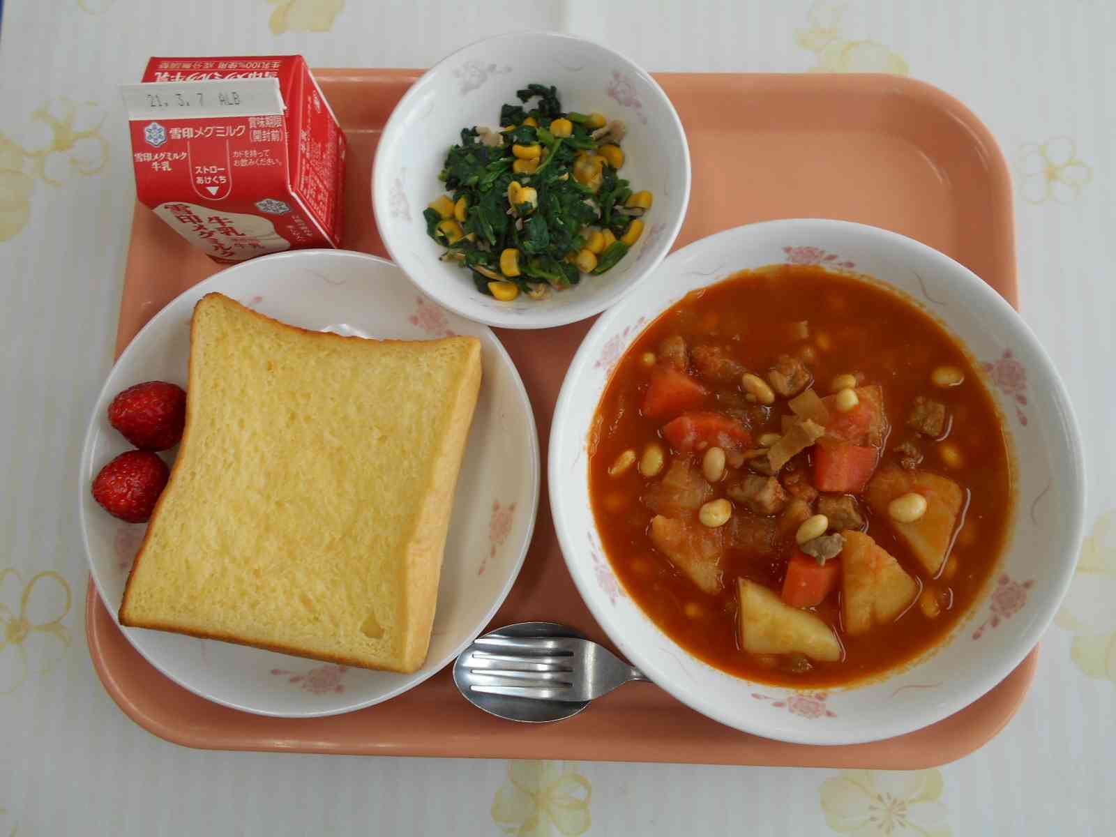 ○牛乳 ○フレンチトースト ○ポークビーンズ ○ほうれん草とコーンのソテー ○いちご ☆一口メモ☆ 今日のいちごは、温室のビニールハウスで育てたいちごです。実は、ビニールハウスを利用しないで育てる「露地(ろじ)栽培」 では、4月に花が咲いて、5、6月に収穫の時期を迎えます。 もともとのいちごの旬は、春から初夏にかけてです。冬に収穫できるようになったのは、12月のクリスマスの時期にいちごが必要とされたからです。 そのニーズに応えるため、農家の方たちはハウス栽培や品種改良を重ねました。 そして本来の旬の時期より収穫できる時期が早まったので、旬ではない時期に食べることができるようになりました。 写真2枚目 今日使ったほうれん草は、千葉県産のほうれん草です。 新鮮なほうれん草12キログラムを八百屋さんに持ってきてもらいました。お店で売っているほうれん草1袋は、だいたい200~250グラムなので、12キログラムだと48~60袋分に相当します。給食室にある大きなタライ2個が山盛りになるくらいの量のほうれん草を調理しました。 炒めた後のほうれん草はしんなりして、かさが減ってたくさん食べられますね。【添付ファイル】