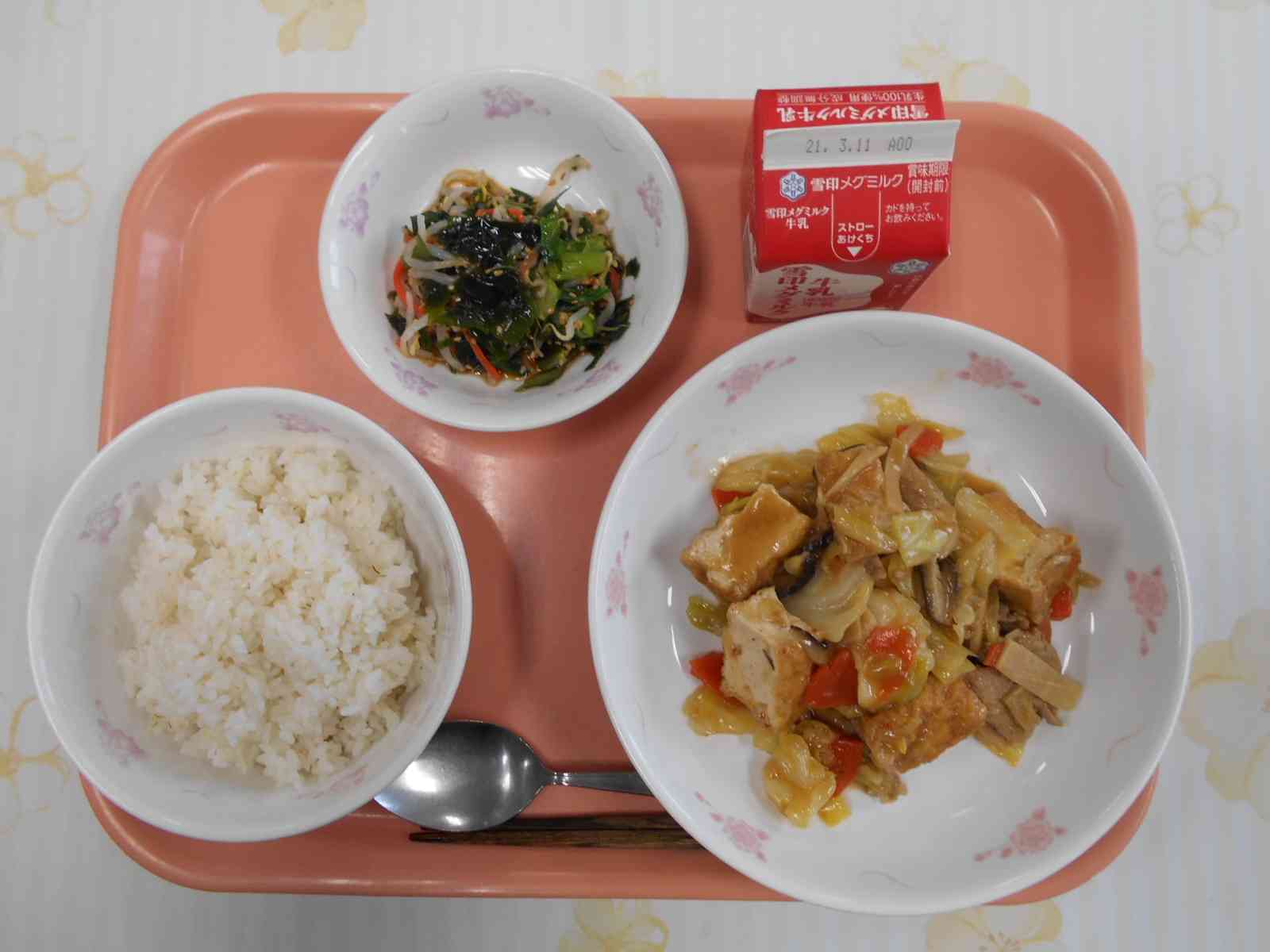 ○牛乳 ○麦ご飯 ○ジャージャン豆腐 ○もやしとわかめのごま醤油 ☆一口メモ☆ ジャージャン豆腐は「家常豆腐」と書きます。中国の四川(しせん)省の料理のひとつです。ジャージャンとは、「家庭風」や「家にありふれた」という意味があり、家でよく食べる豆腐料理ということから、この名前がついたと言われています。中華料理ですが、給食の家常豆腐は、辛くなく食べやすいと思います。