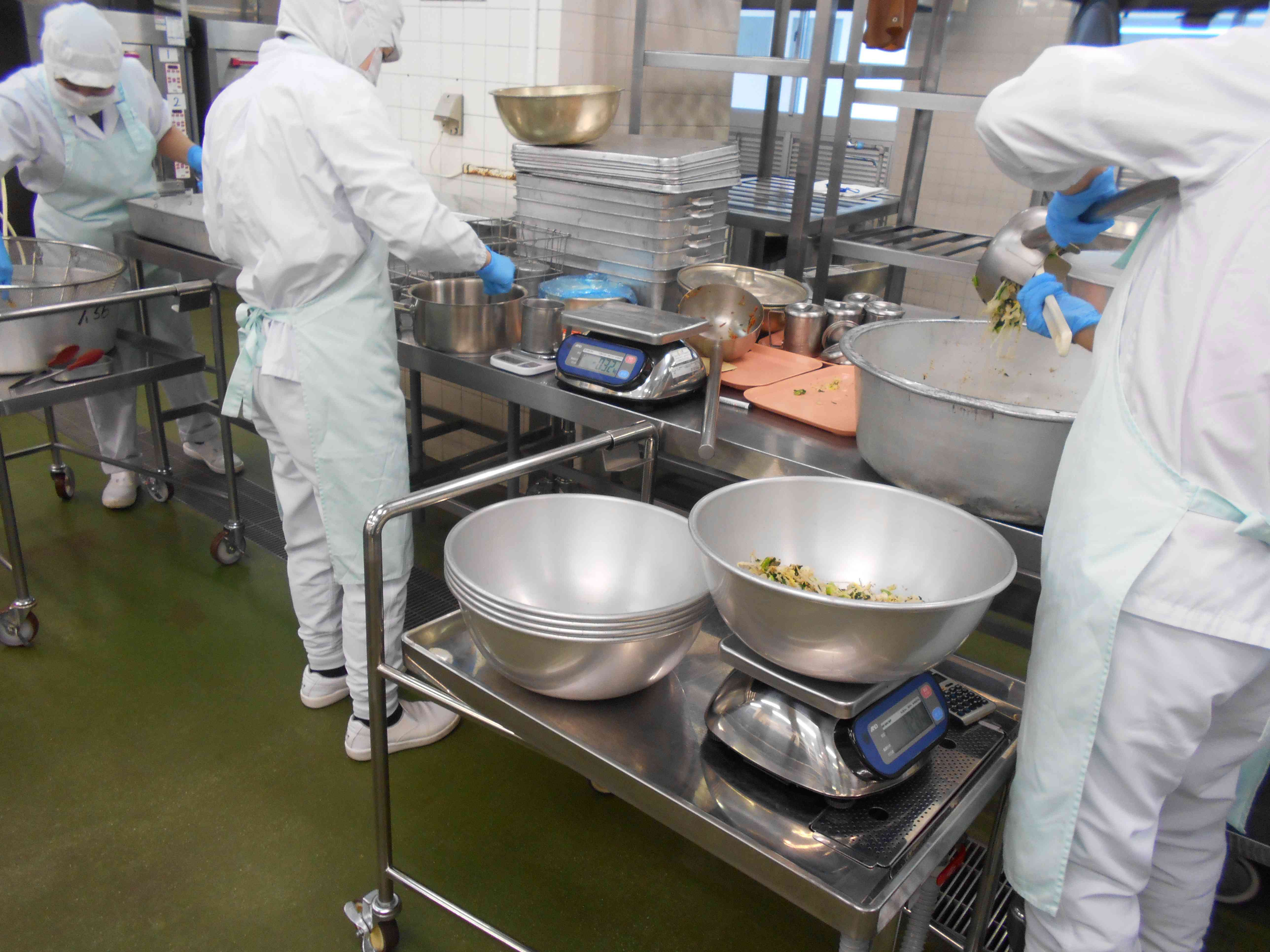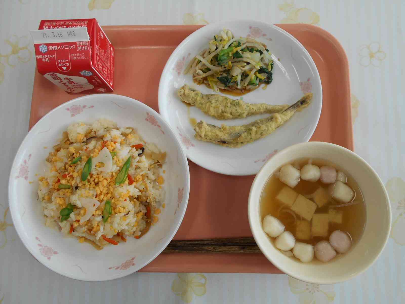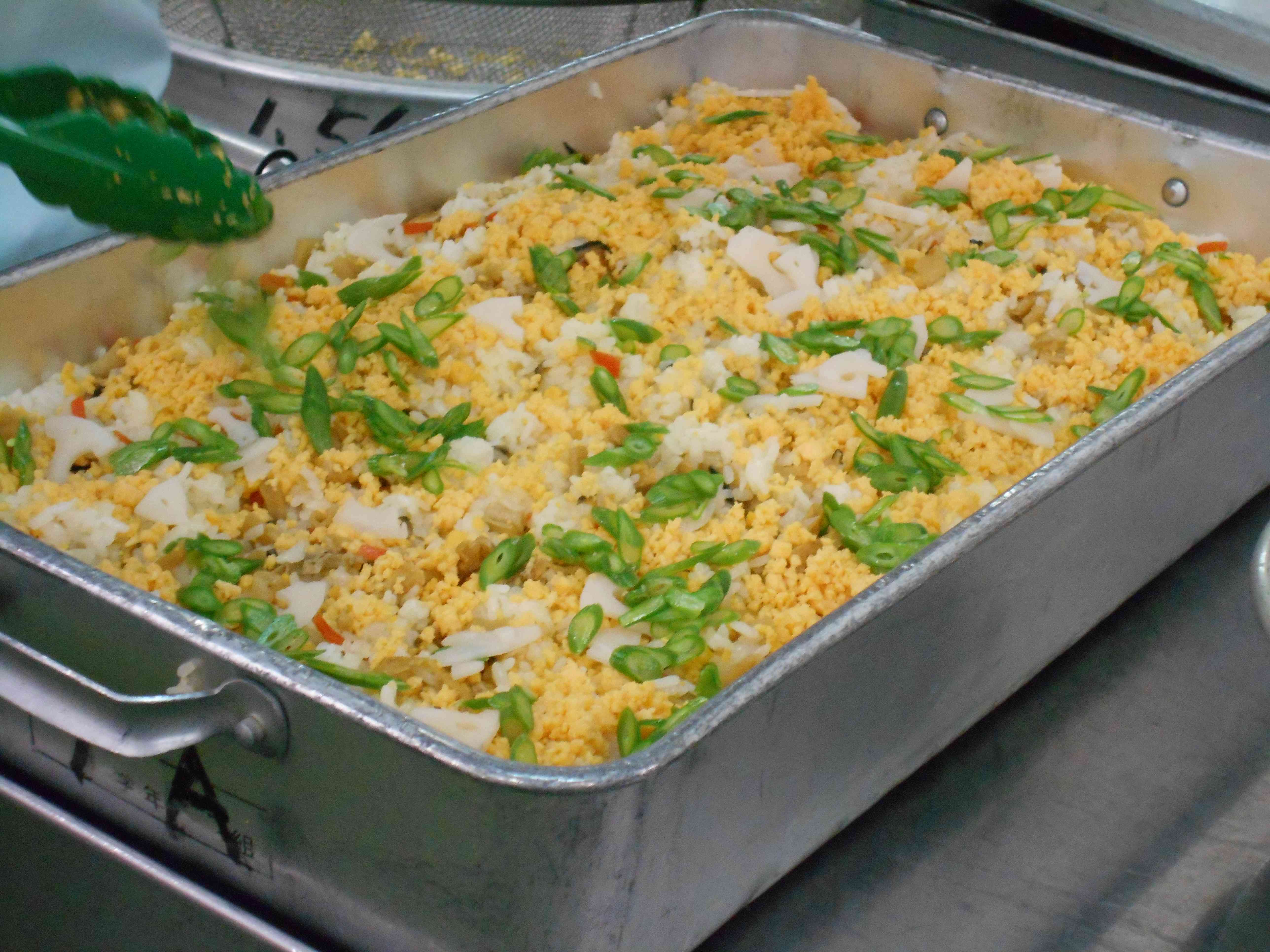 <桃の節句(ひな祭り)の行事食> ○牛乳 ○ちらしずし 〇ししゃもの磯辺揚げ(いそべあげ) 〇ごまかけお浸し(おひたし) 〇ひなあられはんぺんのすまし汁 ☆一口メモ☆ 3月3日は、ひな祭りです。女の子の健やかな成長を願う行事で、「桃の節句」や「上巳の節句」ともいいます。平安時代のころ、紙で作った人形に心身のけがれを移して、川や海に流し、厄(やく)を払う風習がありました。今でも、「流しびな」として、この風習が受け継がれている地域もあります。これに貴族の人形遊びが結びついて、現在のようなひなまつりになったといわれています。 写真2枚目 給食には生物(なまもの)を使うことができないので、ちらしずしにはサーモンやイクラなどの海鮮は入っていません。そのぶん、すし酢、混ぜ込むかんぴょうなどの具、酢ばす、卵など具材をすべて給食室で調理して、丁寧に作ったちらしずしにしています。 各クラスのバットに彩りよく盛りつけました。 写真3枚目 ひなまつりの行事食の献立は、調理、盛りつけをする食材が多くなってしまいます。それぞれ調理員さんが分担して作業を進めて、給食時間に間に合わせて、クラスに届けてくれました。【添付ファイル】