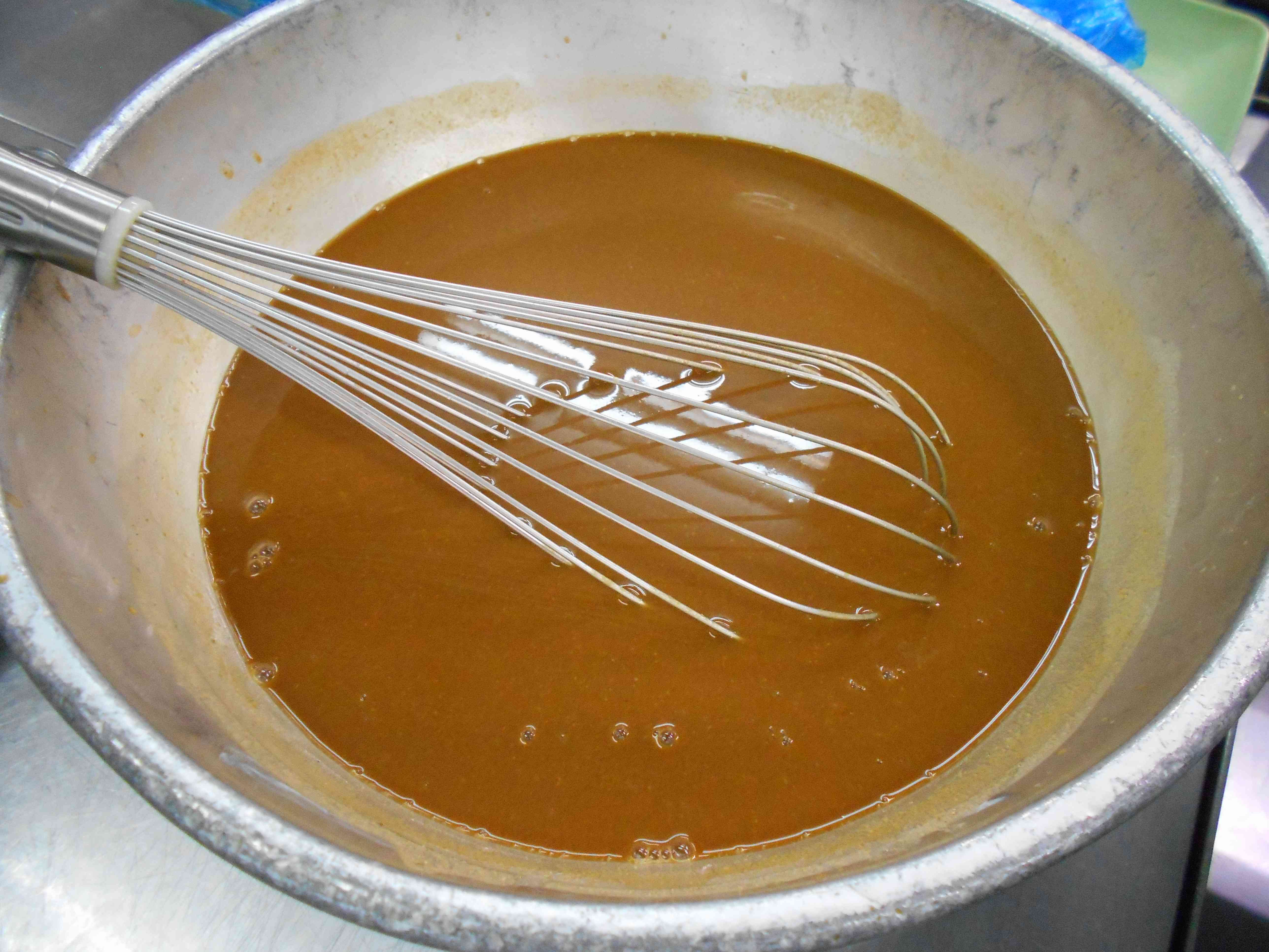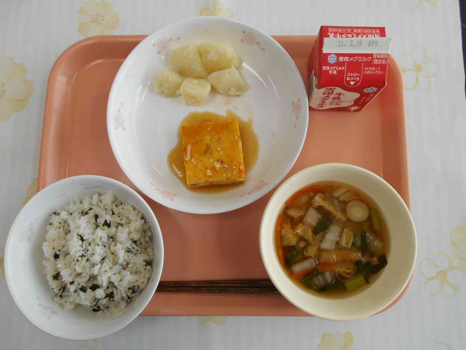 ○牛乳 ○わかめご飯 〇切り干し大根入り卵焼き 〇粉ふき芋 〇白菜と揚げの味噌汁(江戸甘味噌使用) ☆一口メモ☆ 今日の味噌汁には、江戸甘味噌を使っています。江戸甘味噌は、茶色の色が濃く、塩分が少なく、米こうじ由来のあまさが感じられる味噌です。江戸時代から作られてきた味噌です。過去には東京にも味噌蔵が多くあり、人気の味噌でした。しかし、第二次世界大戦のときに、米こうじをたっぷり使って作る味噌はぜいたく品として、禁止されてしまいました。それから、戦後の不況時に信州味噌が関東に運び込まれていたため、長野県のみで親しまれていた信州味噌が東京を中心とした関東地域でも親しまれるようになったと言われています。 写真2枚目 江戸甘味噌をだし汁で溶いてのばしたところです。 こげ茶色で色が濃いみそだと分かるでしょうか。 写真3枚目 卵焼きが焼き上がったところです。卵の黄色とにんじんのだいだい色がきれいに焼き上がりました。 給食の卵焼きは、大きなオーブンで焼いてから一人分に切り分ける作り方をします。今年度、何回か卵焼きを提供していますが、そのたびに、オーブンの焼き温度やスチーム量を変えて、どうやったらよりおいしく焼けるかを調整してきました。そのおかげで、手前みそにはなりますが、今日は今年度一番の仕上がりになったのではないかと思っております。これからも工夫を重ねて、よりよい給食を目指していきます。【添付ファイル】