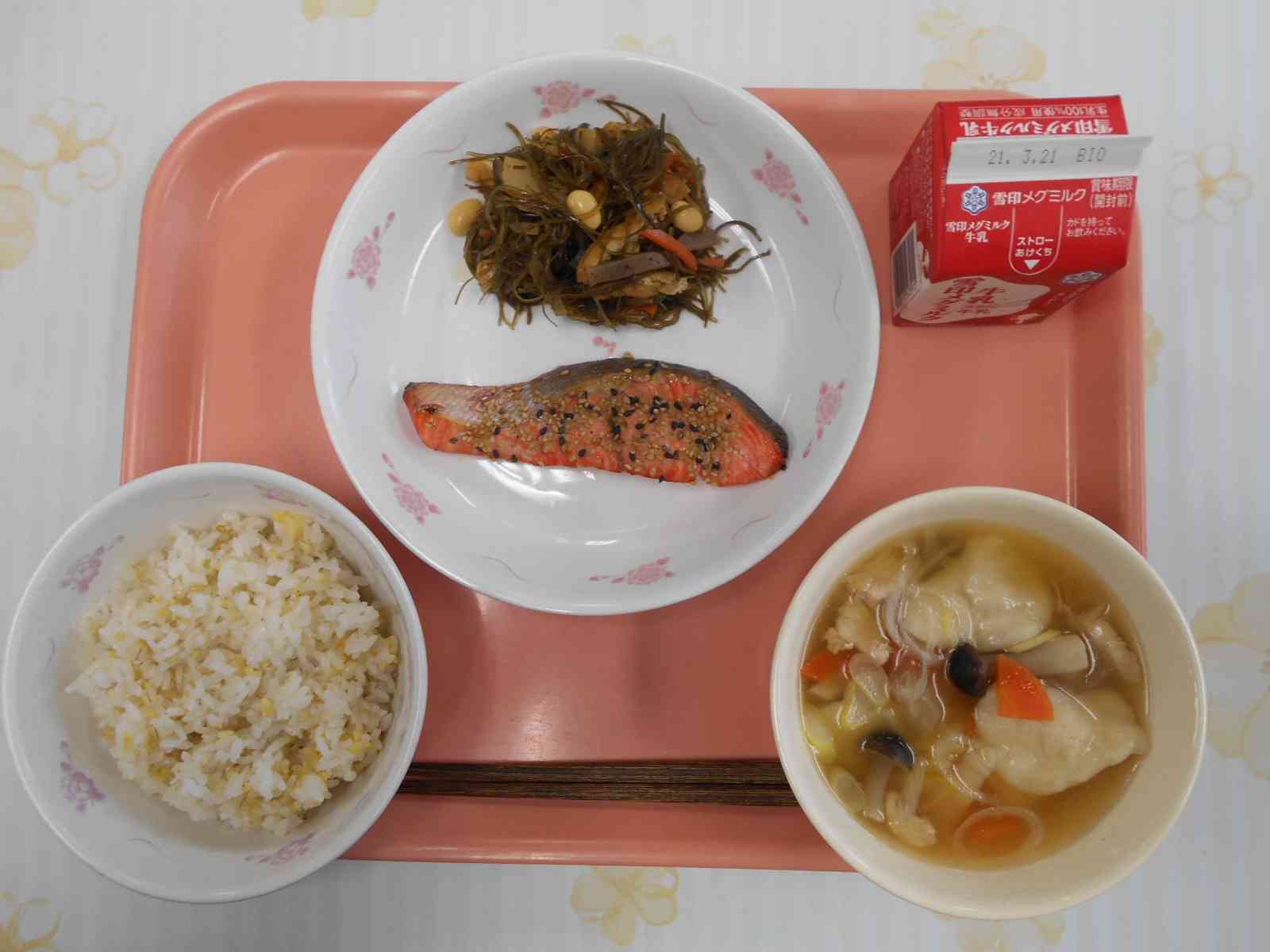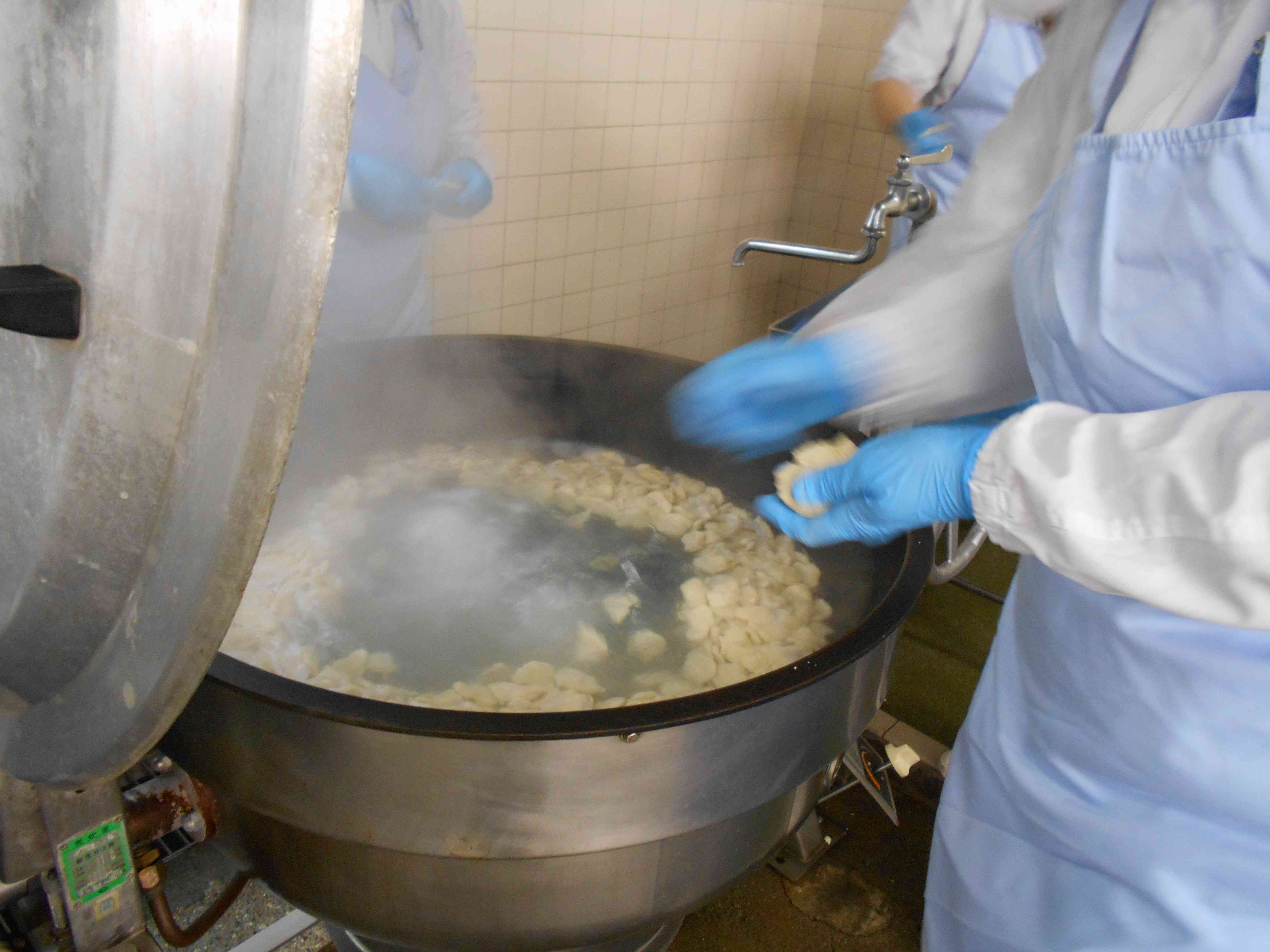 <岩手県の郷土料理> ○牛乳 ○雑穀(ざっこく)ご飯 〇鮭(さけ)の南部焼き 〇細切り昆布と大豆の煮物 〇ひっつみ(すいとん) ☆一口メモ☆ 「ひっつみ」は、岩手県に伝わるすいとんのような汁物です。小麦粉と水を耳たぶくらいのやわらかさにこねた生地をひっつまんで(ひきちぎっての方言)鍋に入れることから「ひっつみ」と名づけられました。 昔は凶作などで食べ物がひどく不足することがあったので、お米を節約するために小麦粉などの粉を使った料理をよく食べていました。岩手県のひっつみに限ったことではなく、全国各地に小麦粉を使った郷土料理があります。このことから、昔はお米が不足することがめずらしいことではなかったことが分かります。今の私たちは、お米のごはんを当たり前のように食べられますが、昔は決して当たり前のことではありませんでした。この状況が有り難い(ありがたい)ことであることを忘れずに、毎日の食事をいただきたいですね。 写真2枚目 ひっつみ用の小麦粉を練った生地をひと口大の大きさにして、ゆでました。料理名の通り、生地をひっつまんで(ひきちぎって)、お湯の中に入れていきます。 調理員さんが、ひと口ぶんずつちぎって、たくさん作ってくれました。【添付ファイル】