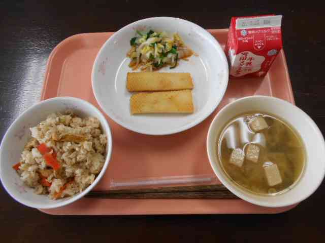 鶏ごぼうの炊き込みご飯 いかの照り焼き ニラ入りお浸し じゃが芋と高野豆腐の味噌汁 現代では、年中食べられるニラですが、旬の時期は春です。ニラは日本へは弥生時代に中国から伝わってきたといわれています。日本最古の歴史書である古事記には、「賀美良(かみら)」の名前で、 万葉集には「久久美良(くくみら)」という名前でしるされています。これらの「みら」が転じて「ニラ」と呼ばれるようになったと言われています。【添付ファイル】