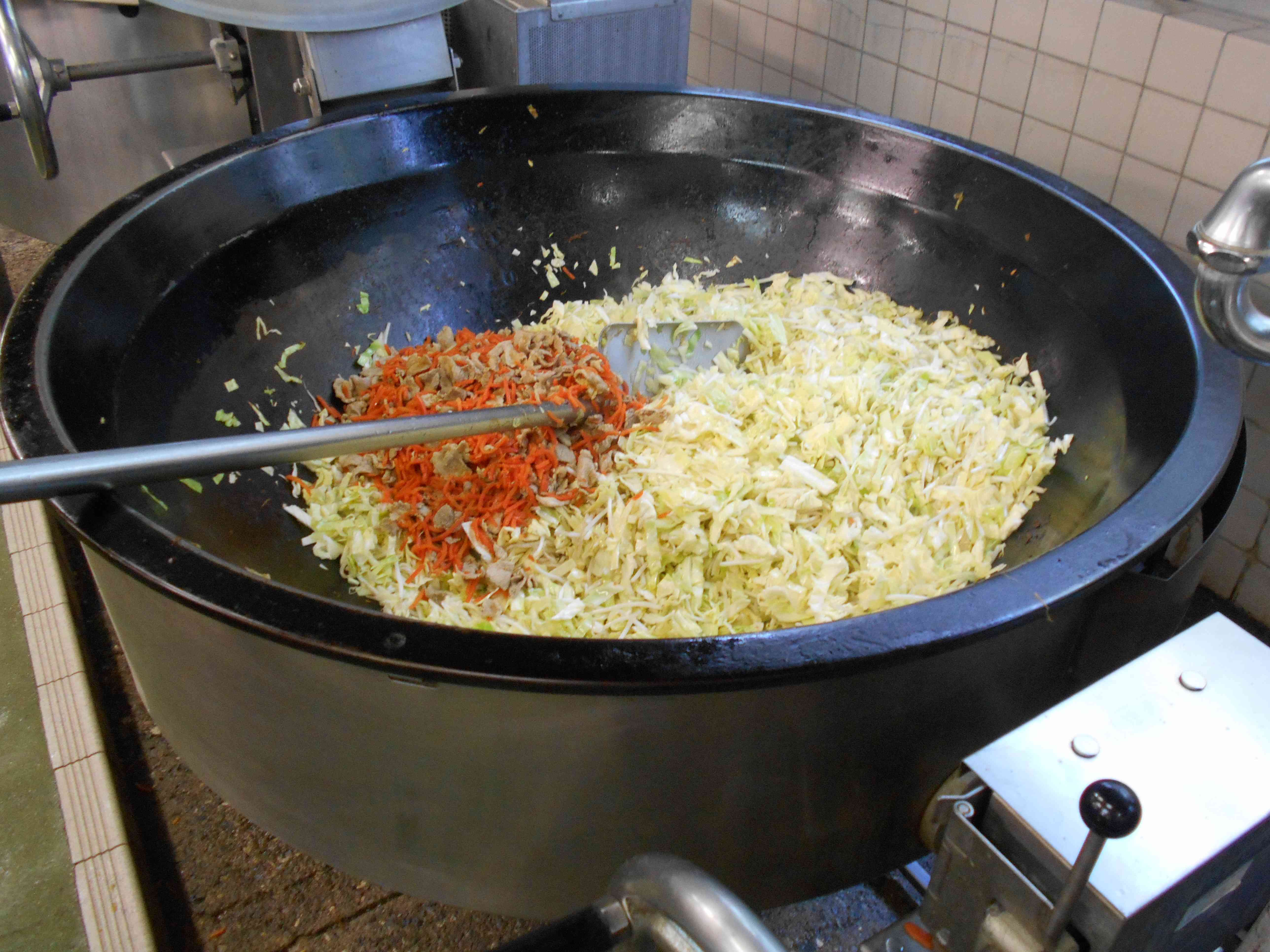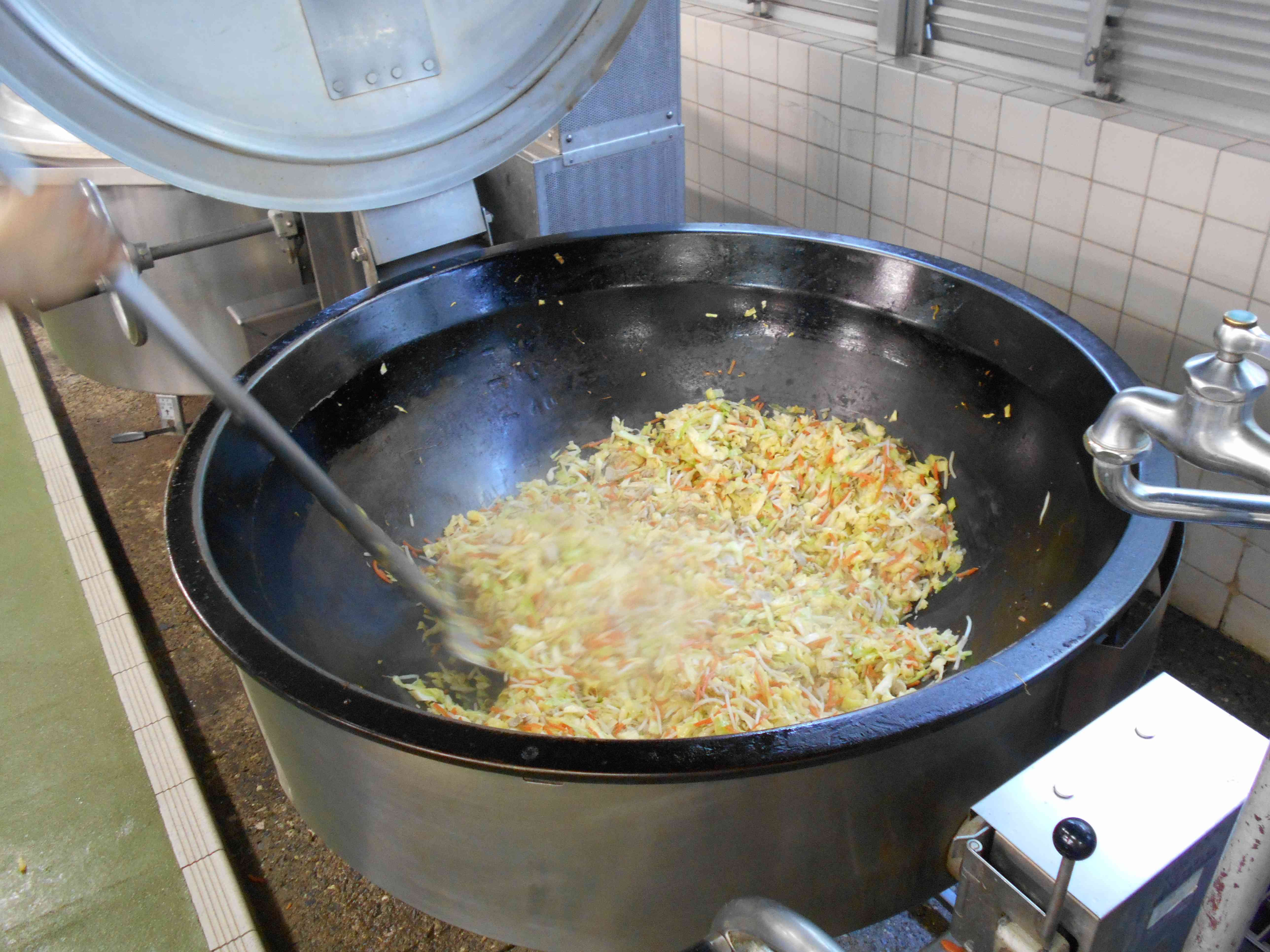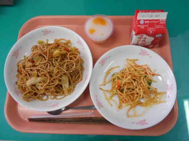 〇牛乳 〇焼きそば 〇じゃが芋のハニーサラダ 〇カルピスゼリー ★3年生リクエスト3位 ☆一口メモ☆ ハニーサラダのドレッシングには、料理名の通りハチミツが入っています。ここでクイズです。ミツバチ1匹が一生でつくるハチミツの量はどれくらいでしょうか。 (1)5グラム (2)50グラム (3)500グラム ・・・答えは(1)5グラムです。1匹の小さなミツバチが、一生で集められるハチミツはティースプーン1ぱいくらいの量です。ミツバチの一生は、1~2ヶ月。そのうちミツを集めるのは10日間ほど。花と巣を1日35往復してミツを集めた後に、羽で風をおこしてミツを乾かします。濃縮してできたハチミツは、はじめの半分くらいの量になってしまいます。 写真2枚目 焼きそばの野菜をいため始めたところの写真です。 焼きそばは、全員分を3回に分けて炒めています。写真の野菜もたっぷりですが、全校の3分の1の量、約80人分の野菜です。 写真3枚目 野菜を炒めて火が通ったところです。野菜は加熱すると、しんなりしてたくさんの量を食べやすくなります。 写真2枚目と比べて、野菜の「かさ」が減っていることが分かるでしょうか。 給食の焼きそばは、野菜たっぷりです。中華めんの量と同じ重さの野菜を使っています。 この後、めんとソースを入れて焼きそばを仕上げました。【添付ファイル】