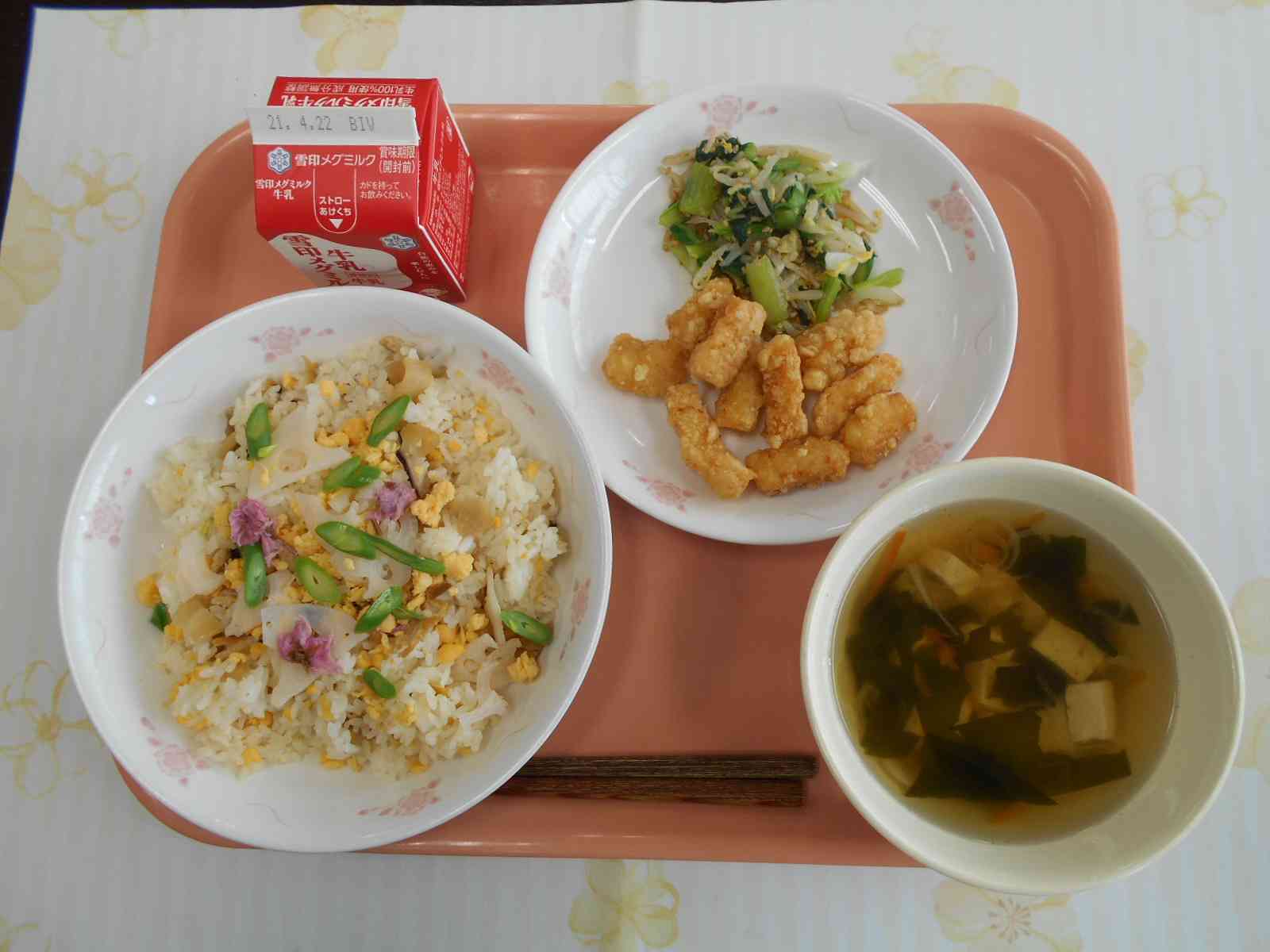 ○牛乳 〇花見ずし(桜の塩漬け) 〇いかのかりん揚げ 〇ごまかけお浸し 〇わかめと豆腐のすまし汁 ☆一口メモ☆ 春を感じられる花といえば桜ですね。ちらしずしには、桜の塩づけを飾って、春の季節を感じられるようにしました。桜の塩づけは、色がきれいで香りのよい八重桜を使って作ります。七分咲きの八重桜をつみとって、塩につけてから乾燥させて作ります。桜の塩づけにお湯をそそいで桜茶にしたり、ごはんに混ぜ込んでおにぎりにしたり、クッキーやケーキにするなど、さまざまな使い方があります。東陽中の周りの桜はもう散ってしまいましたが、春の季節を感じながらいただきましょう。【添付ファイル】