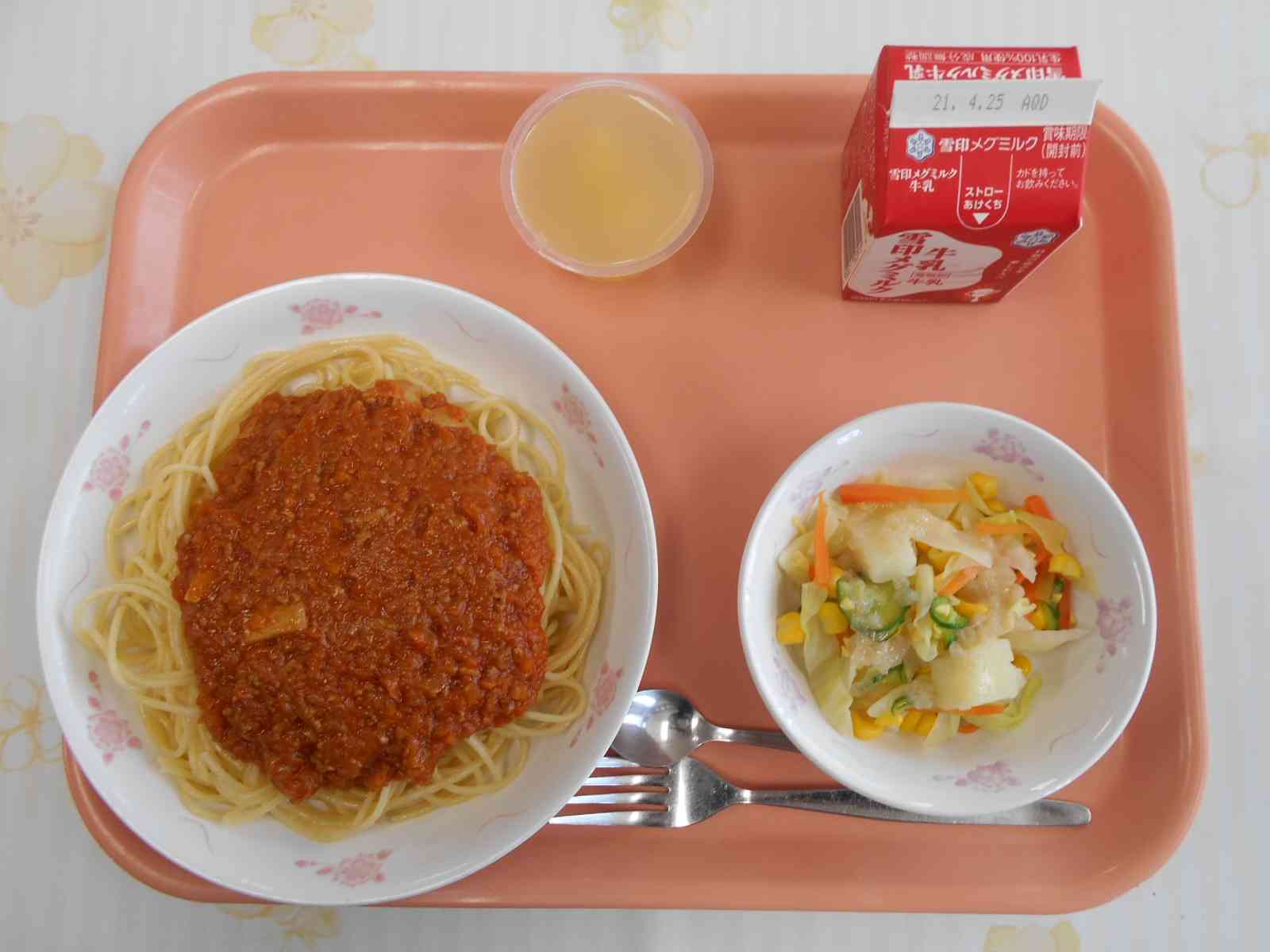 ○牛乳 〇スパゲッティミートソース 〇じゃが芋入りサラダ 〇アップルゼリー ☆一口メモ☆ 給食のミートソースには野菜がたっぷり使われています。一人分のミートソースを食べると、1日の野菜の目標量の3分の1をとることができます。野菜たっぷりで、うまみとコクがあるミートソースになるように、時間をかけて作っています。ポイントは、玉ねぎとトマトです。玉ねぎをじっくり炒めて、からみを飛ばして甘みを引き出します。さらに、トマトを強火で煮込んで、トマトの酸味をとばしてカドがないまろやかな味に仕上げました。【添付ファイル】