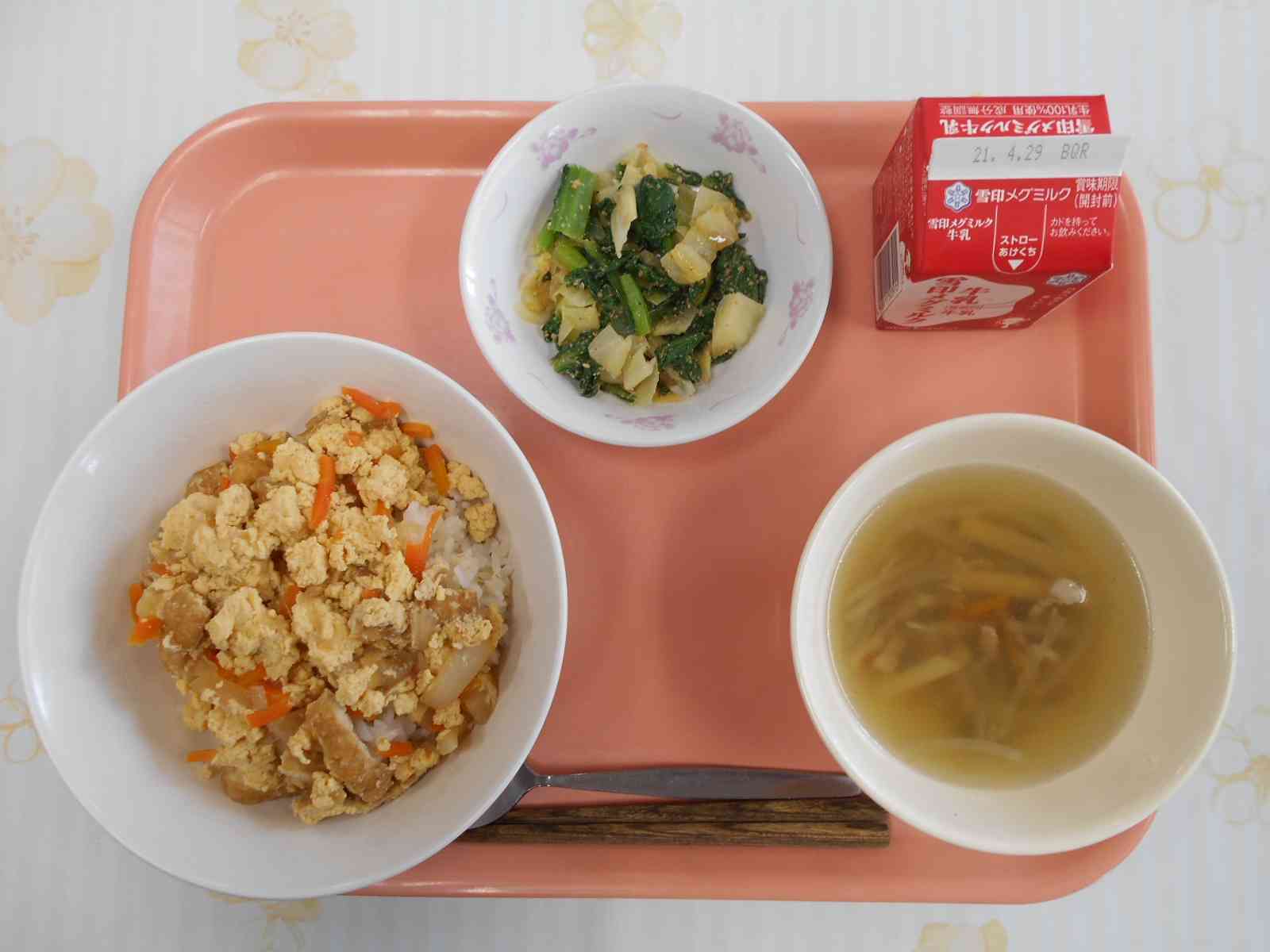 ○牛乳 〇きつね丼 〇ごま和え 〇沢煮椀風(さわにわんふう)すまし汁 ☆一口メモ☆ クイズです。きつね丼の具に入っている油揚げは何からできているでしょうか。 (1)豆腐 (2)小麦粉 (3)きつねの肉 ・・・答えは(1)豆腐です。油揚げは豆腐を油で揚げてつくります。 きつね丼といっても、動物のきつねは入っていません。油揚げを使う料理名にはきつねの名前がつくことがあります。お稲荷さんのきつねは、神様の使いとされていて、油揚げをお供えします。そのことから、きつねの好物といえば油揚げというイメージが定着したと言われています。【添付ファイル】