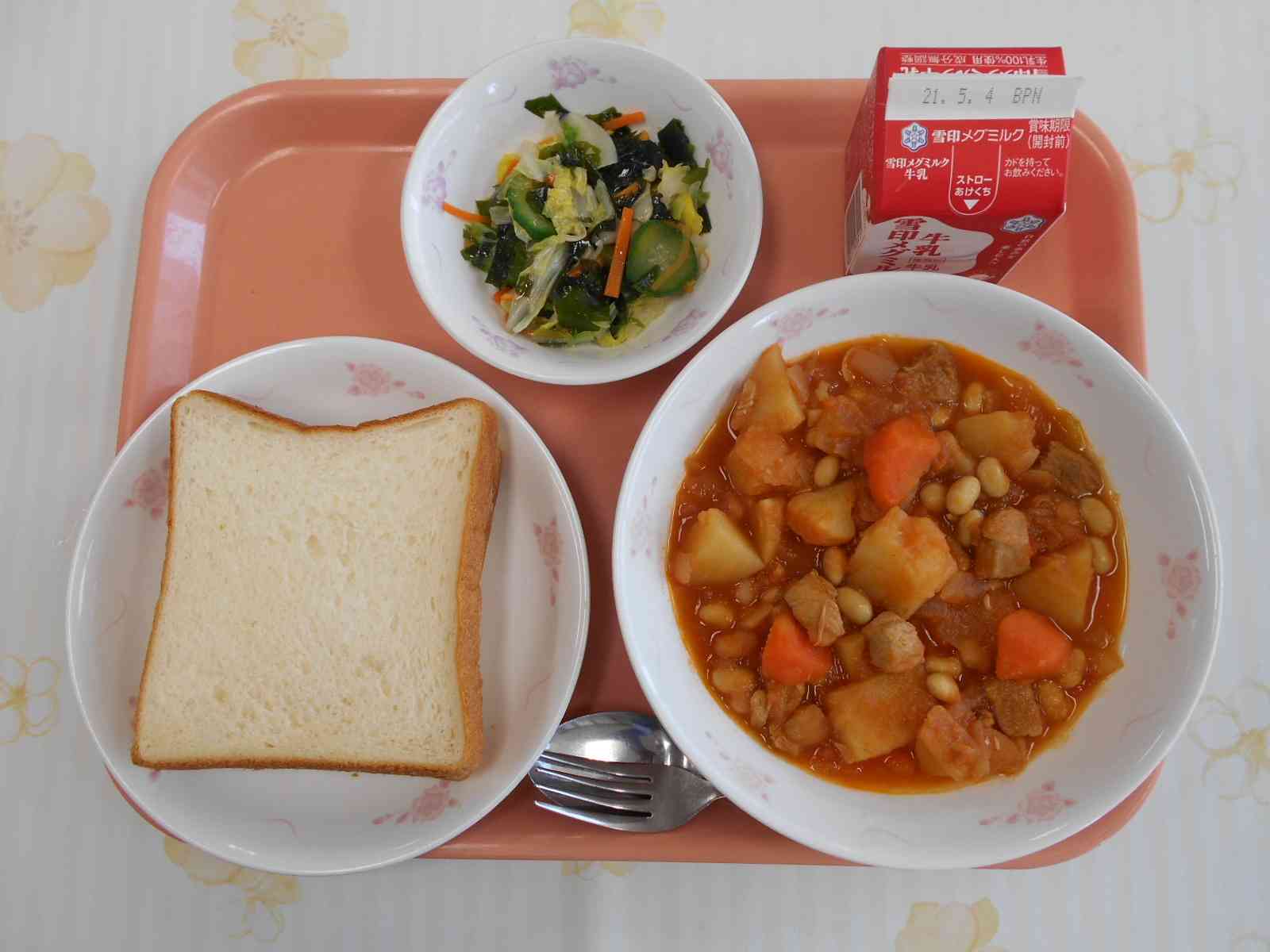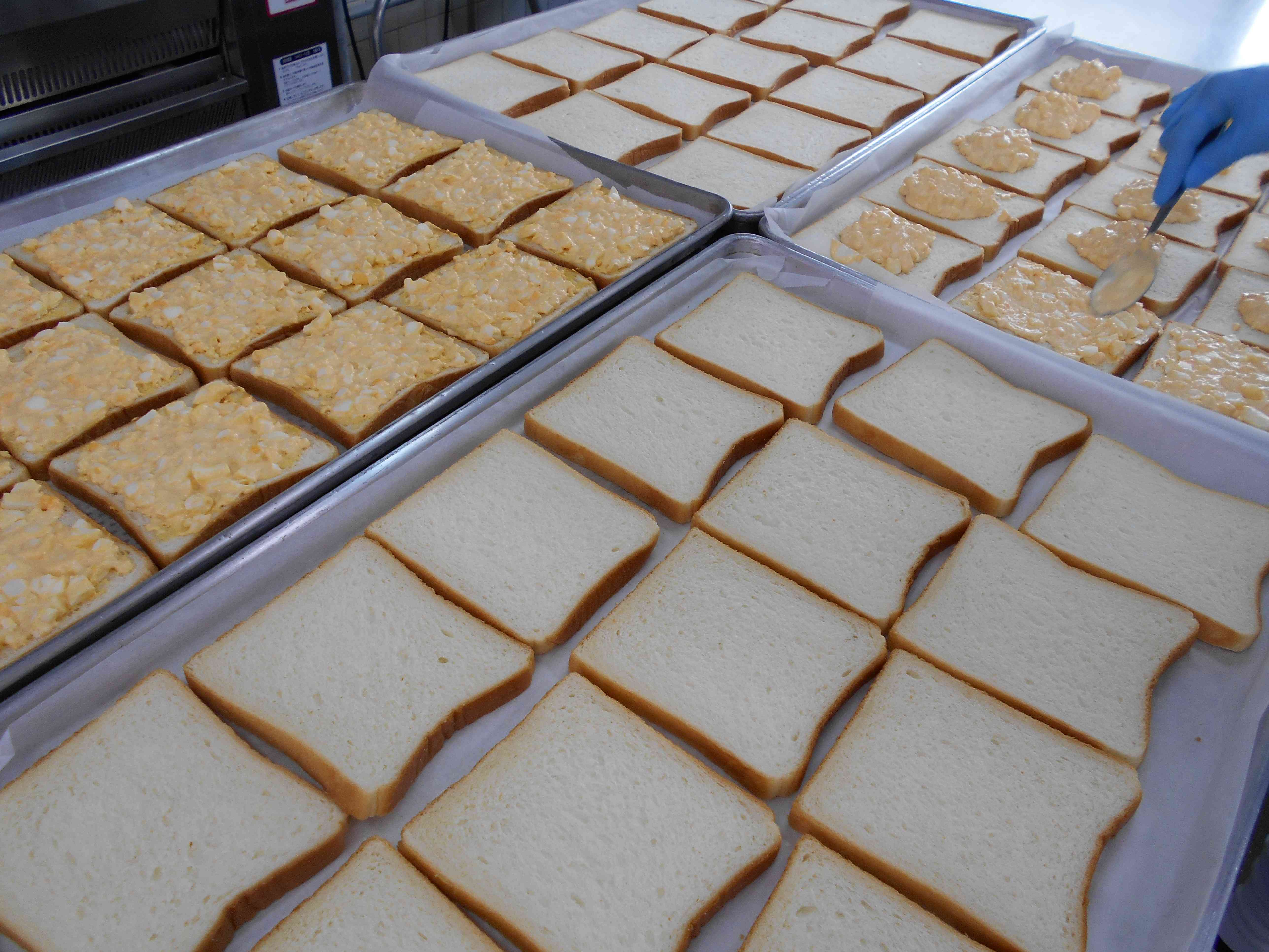 ○牛乳 〇卵サンドトースト 〇ポークビーンズ 〇わかめ入りサラダ ☆一口メモ☆ 手作りの卵サンドトーストです。給食ではなるべく手作りのものをみなさんに食べてもらいたいと思っているので、パンにはさむ卵の具も手作りです。今日は15キログラム、約250個の卵を使いました。まず、生の卵を割れないようにゆでて、ゆで卵を作ります。次に、1個ずつカラをむきます。むいた卵を刻んで食べやすい大きさに切ります。最後にマヨネーズなどの調味料とあえて、パンにはさむ具の完成です。さらに、パンに具をはさんで焼いてトースト作りました。 調理員さんが、ひとつひとつの調理工程を丁寧に取り組んで作ってくださっています。よく味わって食べてもらえるとうれしいです。 写真2枚目 食パンに卵の具をのせているところです。はじめのひと口から終わりのひと口まで、味わってもらえるように、たっぷりの具をパンの端までぬり広げました。手間と時間をかけたぶん、丁寧に手作りしたトーストが完成したと思います。【添付ファイル】