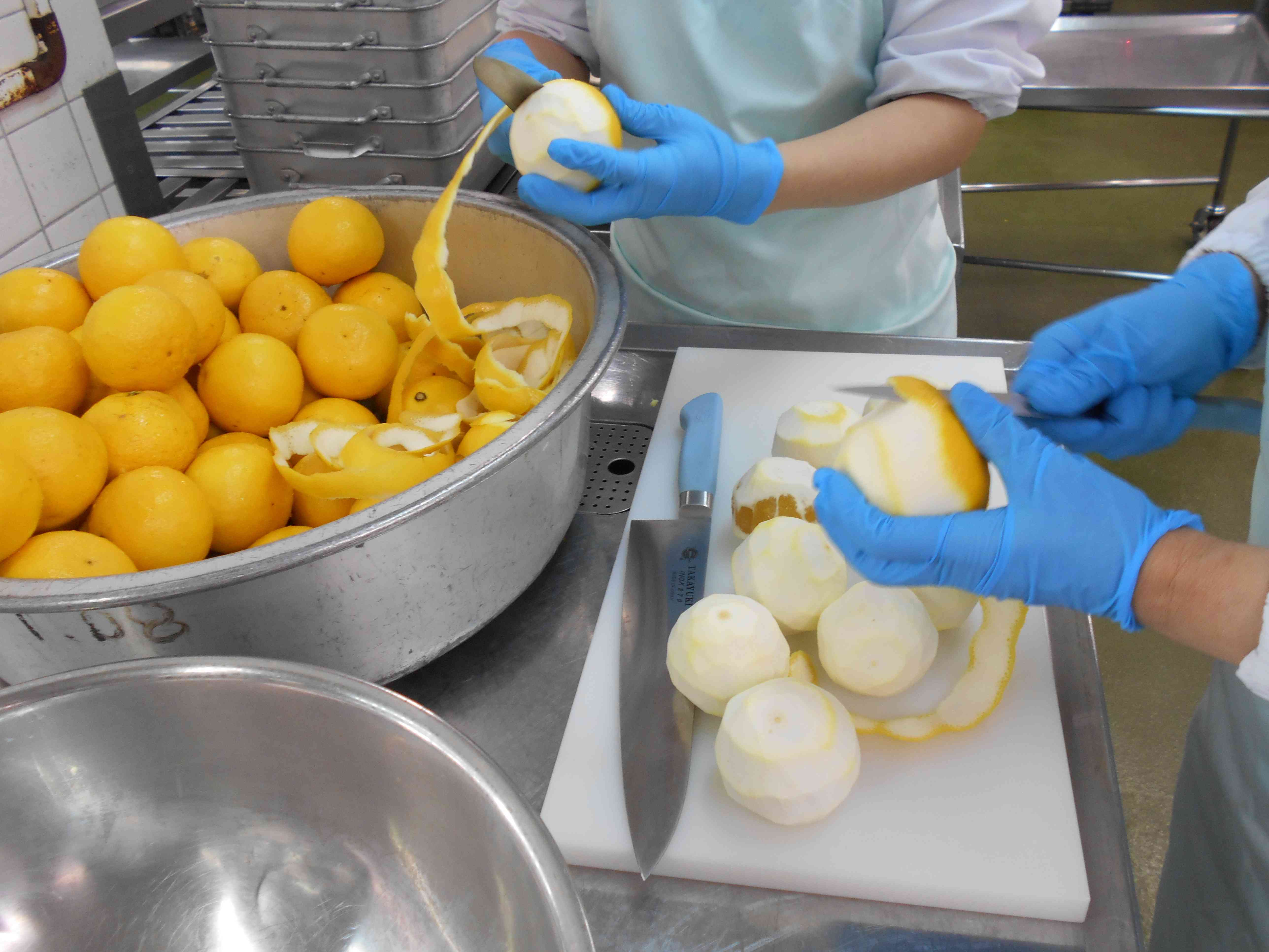 ○牛乳 〇カレーライス 〇揚げ大豆入りサラダ 〇日向夏(ひゅうがなつ) ☆一口メモ☆ 日向夏は春においしい果物です。一番外側の皮は、レモンのような黄色をしています。初めて食べる人は、驚くかもしれませんが、日向夏は果肉の周りの白いワタの部分も食べるかんきつ類で、そのワタの部分においしさの秘密があります。白いワタは苦味がなくほんのり甘みがあります。ジューシーな果肉とふわふわとした香りのよい白いワタを一緒に食べて、ひゅうがなつのおいしさをたんのうしてください。 写真2枚目 宮崎県産の日向夏です。小夏やニューサマーオレンジの名称で売られていることもあります。 日向夏の黄色い外皮をむくときは、包丁を使ってりんごの皮をむくときと同じようにくるくると回してむきます。 給食時間の放送では、白いワタも食べられることをお話しました。しかしながら、ワタも食べられることを初めて知った生徒もいるためか、果肉だけ食べてワタを残して食べる姿も見かけました。 日向夏は5月も旬で、給食に再度登場予定です。 次回はぜひ白いワタにもチャレンジしてみてほしいと思います。【添付ファイル】