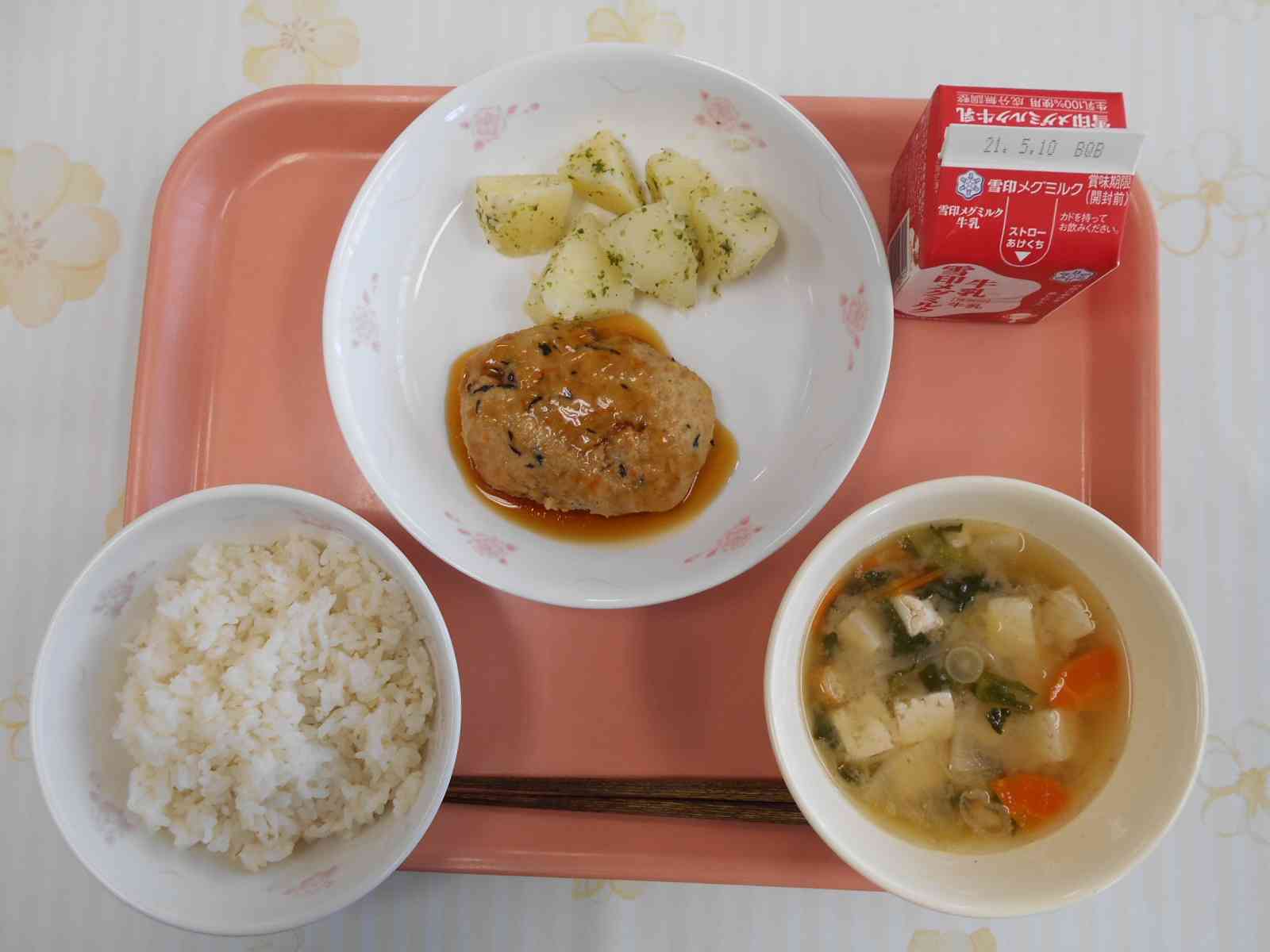 ○牛乳 〇麦ご飯 〇うの花ハンバーグ 〇粉ふき芋(のり塩) 〇ごま味噌汁 ☆一口メモ☆ 卯の花(うのはな)は、大豆からできる食材です。卯の花の別の言い方は何でしょうか。 (1)高野豆腐 (2)おから (3)豆乳 ・・・答えは、(2)おからです。「おから」、「卯の花」、「きらず」、言い方は違いますが、すべておからのことです。おからは、豆腐を作る途中でできるもので、食物繊維たっぷりの食材です。