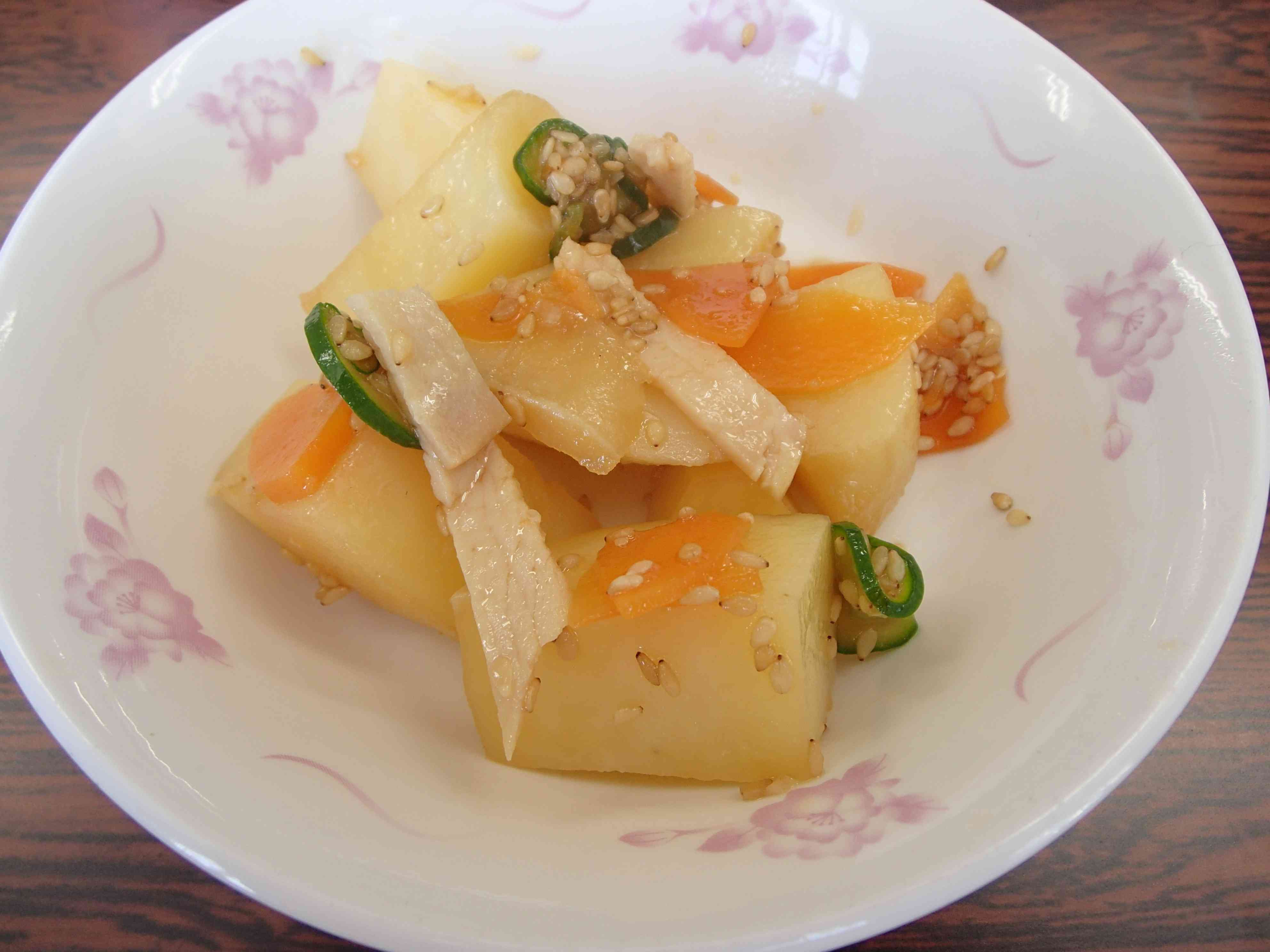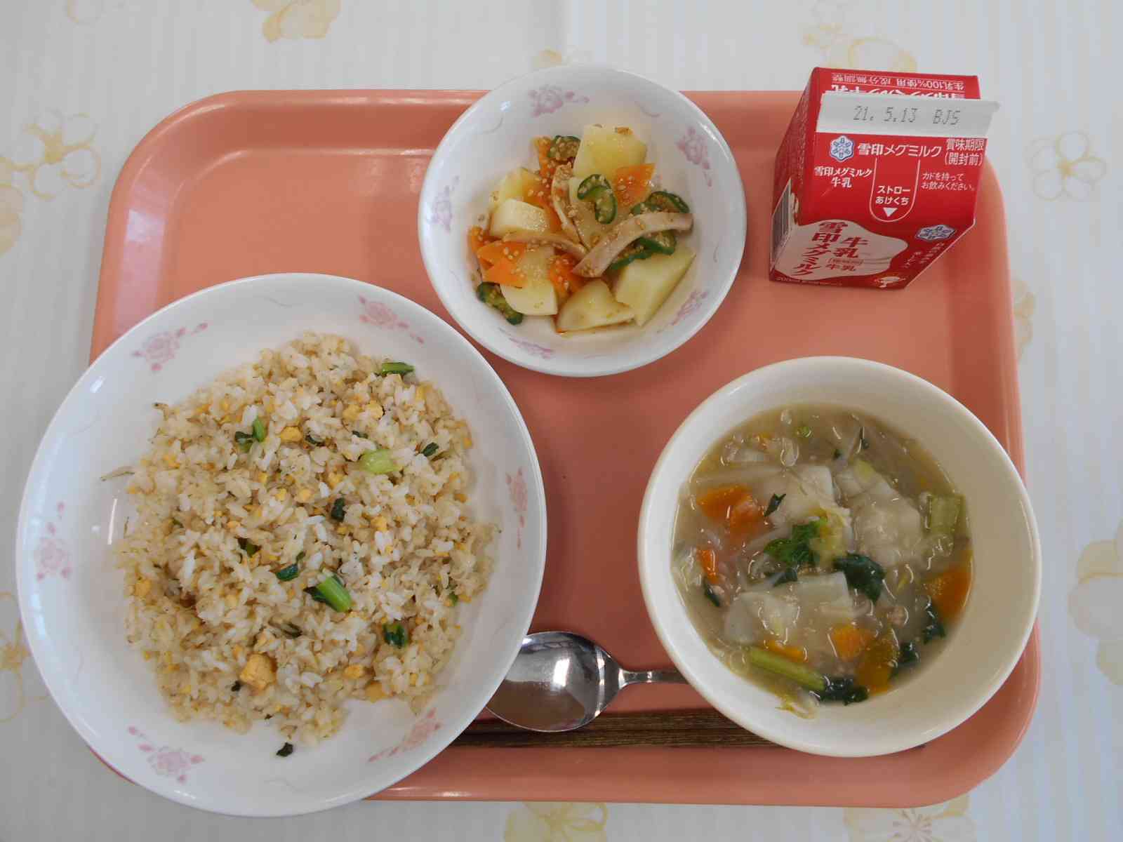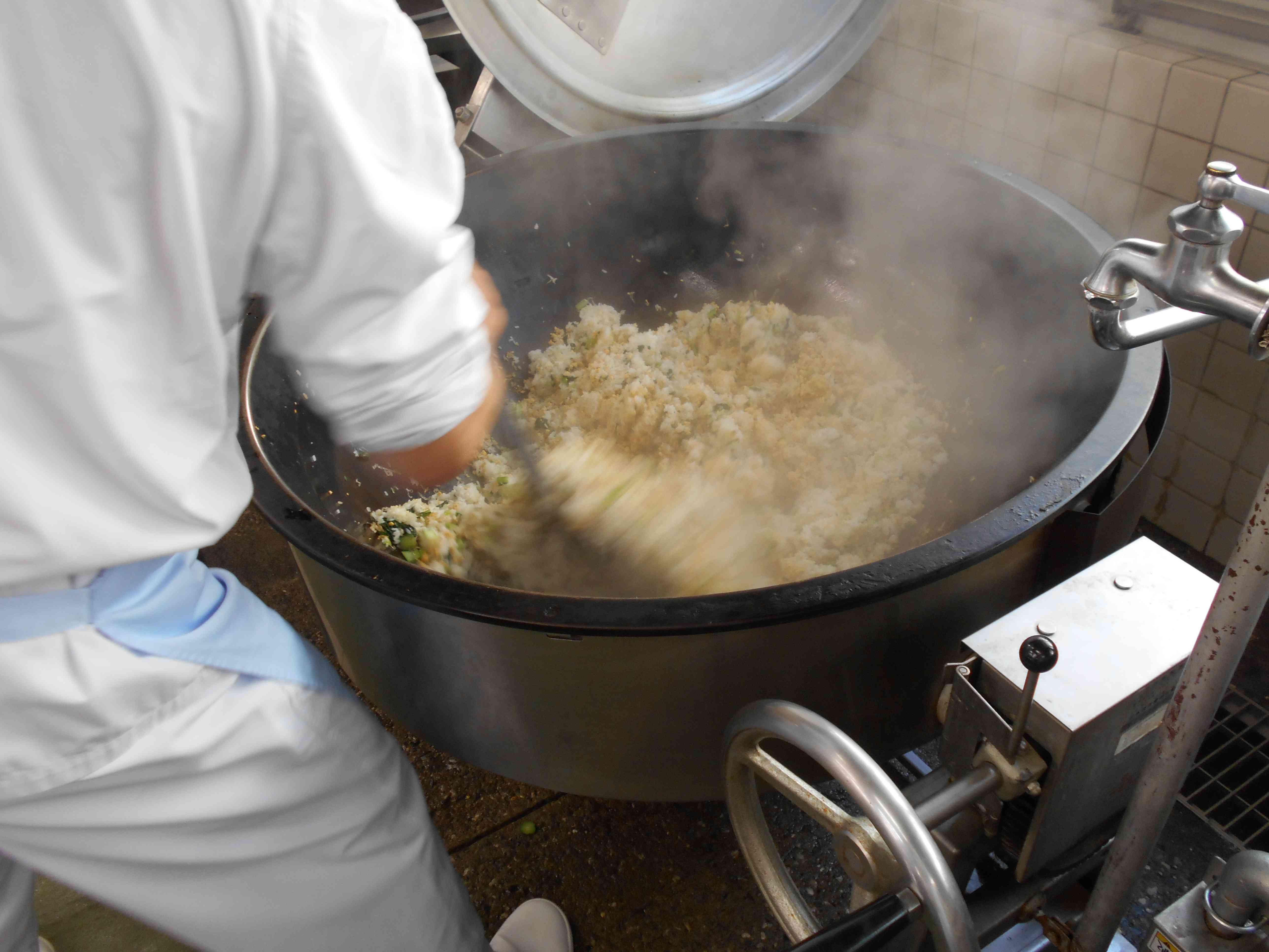 ○牛乳 〇じゃこチャーハン 〇じゃが芋中華サラダ 〇わんたんスープ ☆一口メモ☆ 東陽中の300人分のチャーハンの重さはおおよそ70kgあります。ごはんをしっかり炒められるように5回に分けて炒めました。一度にすべての量を炒めようとすると、重くてかき混ぜきれず、べたつきのあるチャーハンになってしまうためです。 大量調理の学校給食では、チャーハンを作ることがなかなか難しく、ご飯とチャーハンの具を別々に配ぜんしたり、たきこみごはん風の作り方をすることが調理施設によってはあります。炊いたお米を釜で炒めて、本格的な作り方ができるのは自校方式の給食室だからできることだと思います(学校と同じ敷地の中に、給食室があることを自校式と言います)。 写真2枚目 ロースハムは、無えんせきの添加物の少ないものをなるべく使うようにしています。 そのため、給食のハムは鮮やかなピンク色ではなくて、白っぽい色をしています。 写真3枚目 チャーハンを炒めているところです。 しっかり火を通して、かつ、焦げつかないように、力強く手早く炒めます。 白いご飯と、じゃこや卵などの具がよく混ざり合うように気をつけて作りました。【添付ファイル】