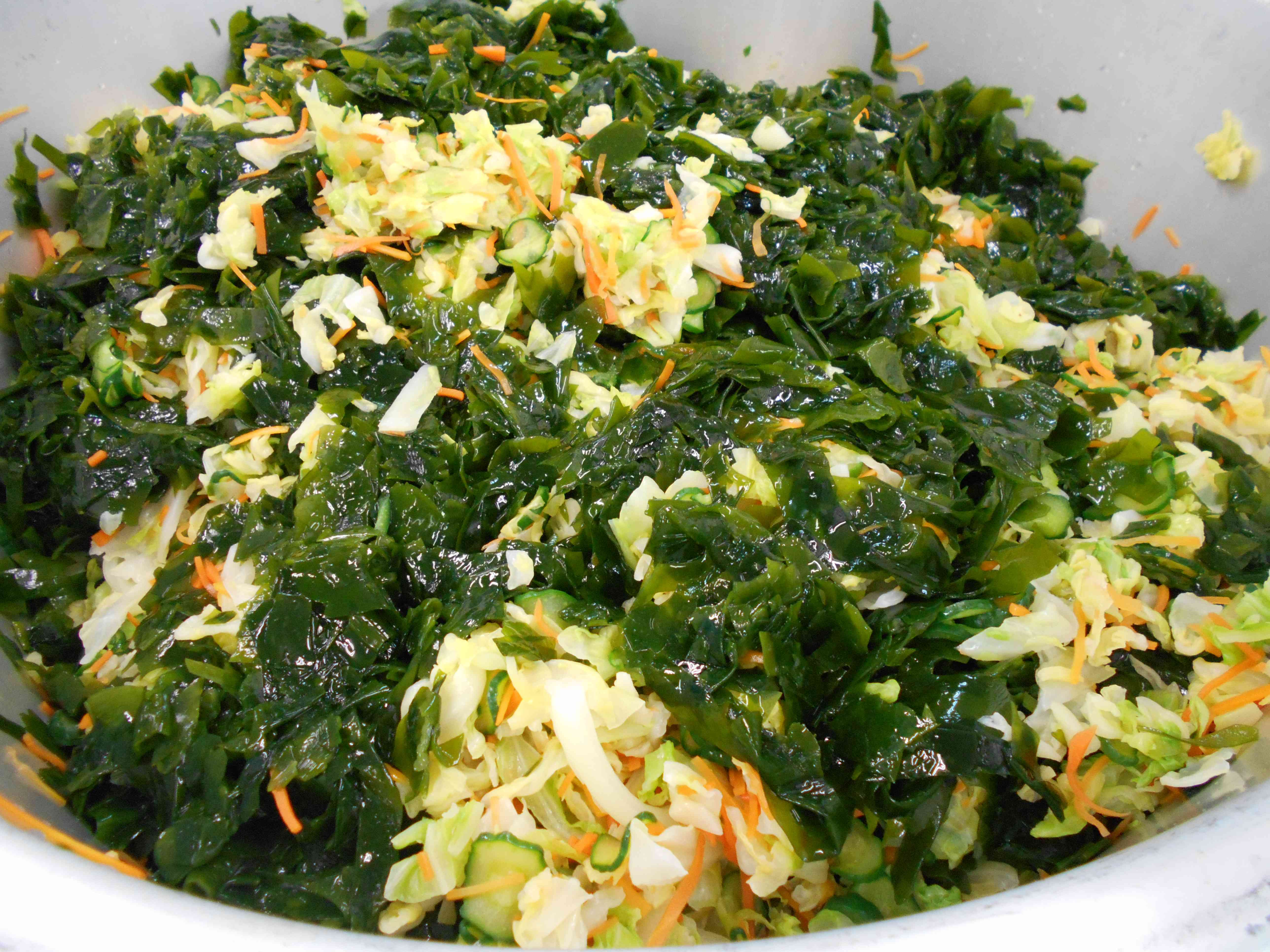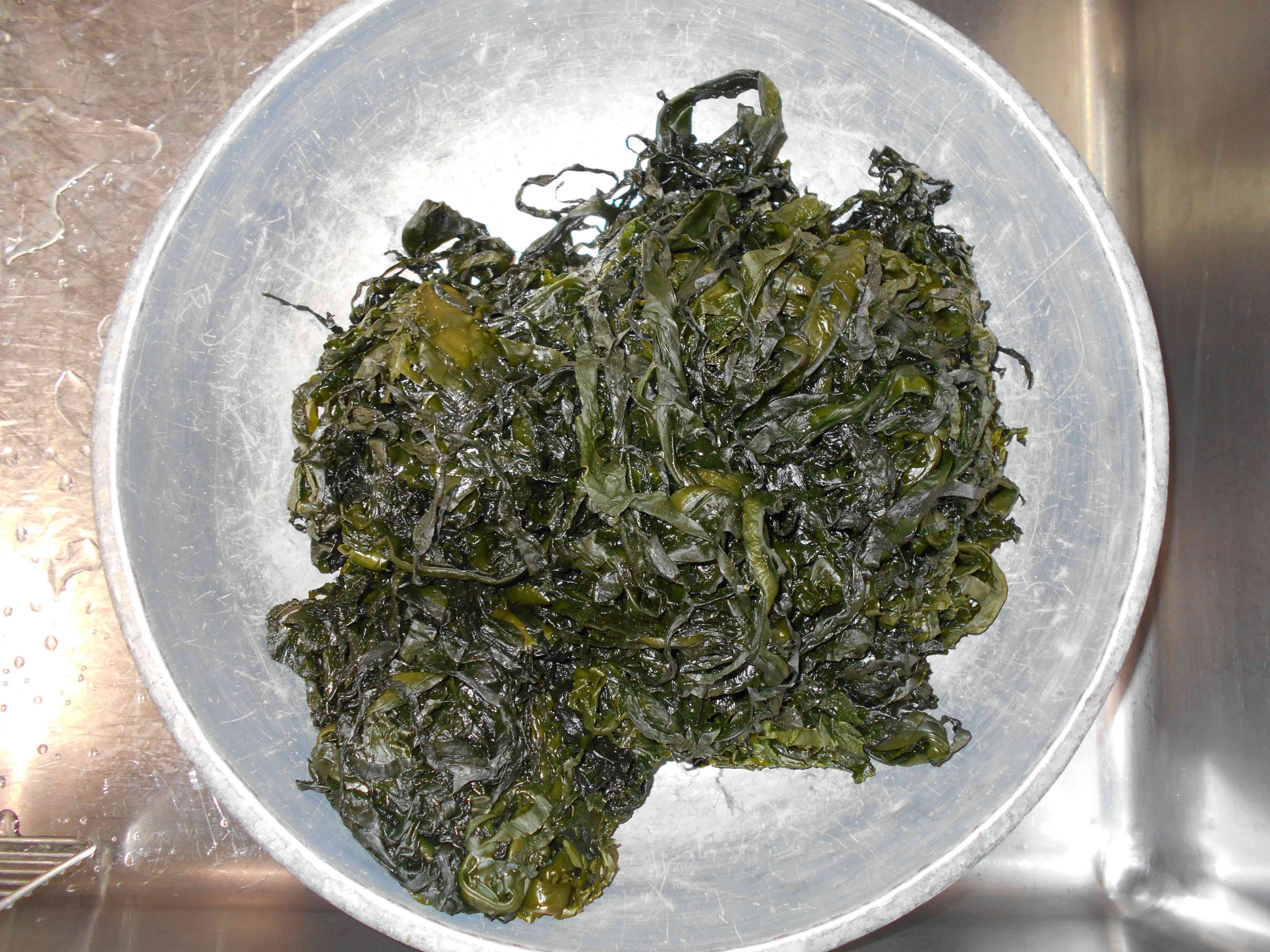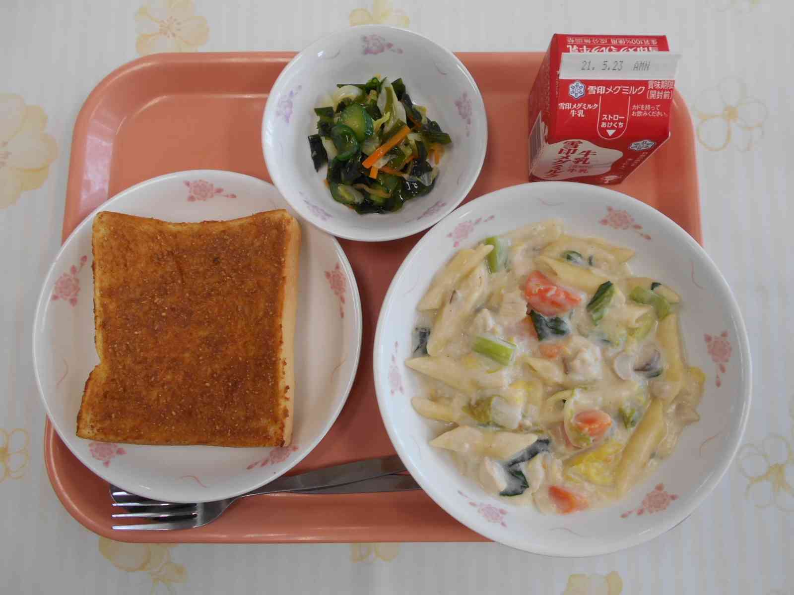 〇牛乳 〇ごまきな粉トースト 〇マカロニのクリーム煮 〇わかめ入りサラダ ☆一口メモ☆ 海そうは、ミネラルや食物せんいが豊富です。わかめ、くきわかめ、めかぶ、もずく、ひじき、のりなど、給食には、さまざまな海そうを使っています。それは、私たちの健康のために、体によい食材を取り入れるためです。今日のサラダに入っているわかめは、つるっとしたぬめりのある食感ですが、これは、アルギン酸やフコイダンという食物繊維によるものです。この食物繊維は、おなかや腸の中をすっきりさせる働きがあります。ほかのねばねばする海藻類にも食物繊維が豊富です。わかめにつるっとした食感があるおかげで、食べて体によい成分が入っていることが実感できますね。 写真2枚目 給食のわかめは、岩手県産の塩蔵わかめです。 日本で食べるわかめは、約2割が国産で8割が外国産と言われています。お店で売られてるわかめの多くが中国産か韓国産だと思います。 包丁で食べやすい大きさに切った後に、ゆでてサラダに入れます。 写真3枚目 サラダにゆでたわかめを入れたところです。【添付ファイル】