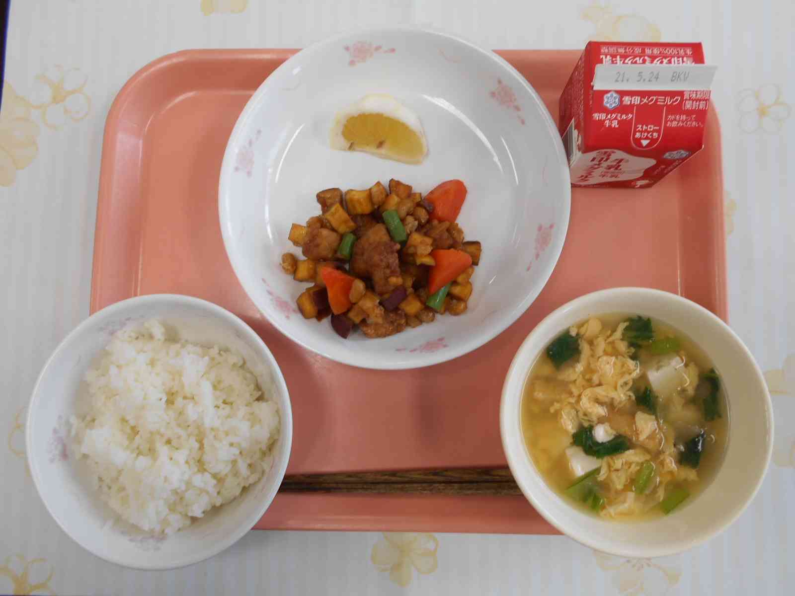 ○牛乳 〇ご飯 ○魚と野菜の五色あえ 〇卵と新玉ねぎの味噌汁 〇日向夏(ひゅうがなつ) ☆一口メモ☆ よい姿勢で食事しよう みなさんは、どんな姿勢で食事をとっていますか?よい姿勢で食事をするためのポイントは4つあります。 1、いすに深く座る 2、背筋をのばす 3、机とおなかの間は、にぎりこぶし1つ分あける 4、両足の裏は床につける 食事をするときによい姿勢で食べていると、食べ物を口に運んで飲み込みやすく、見た目が美しく、周りからの印象もよくなります。【添付ファイル】