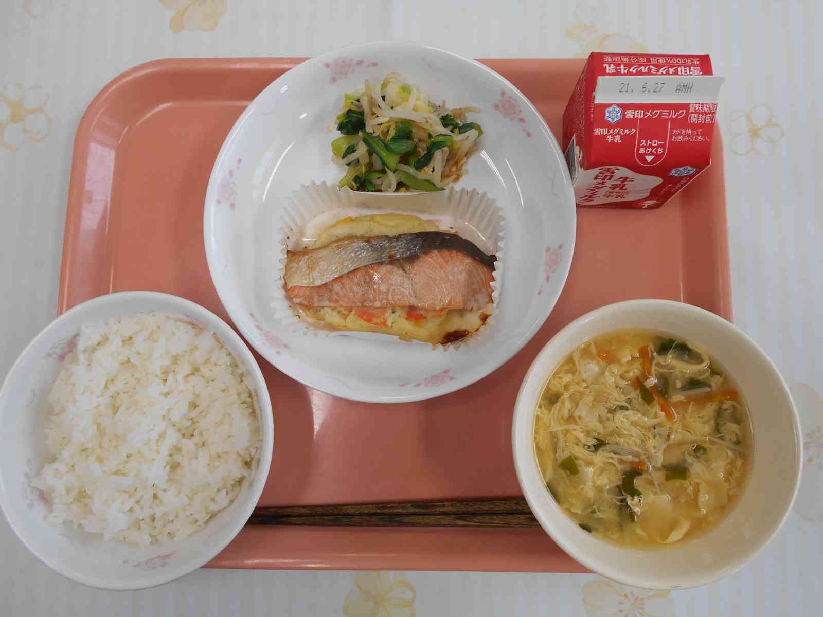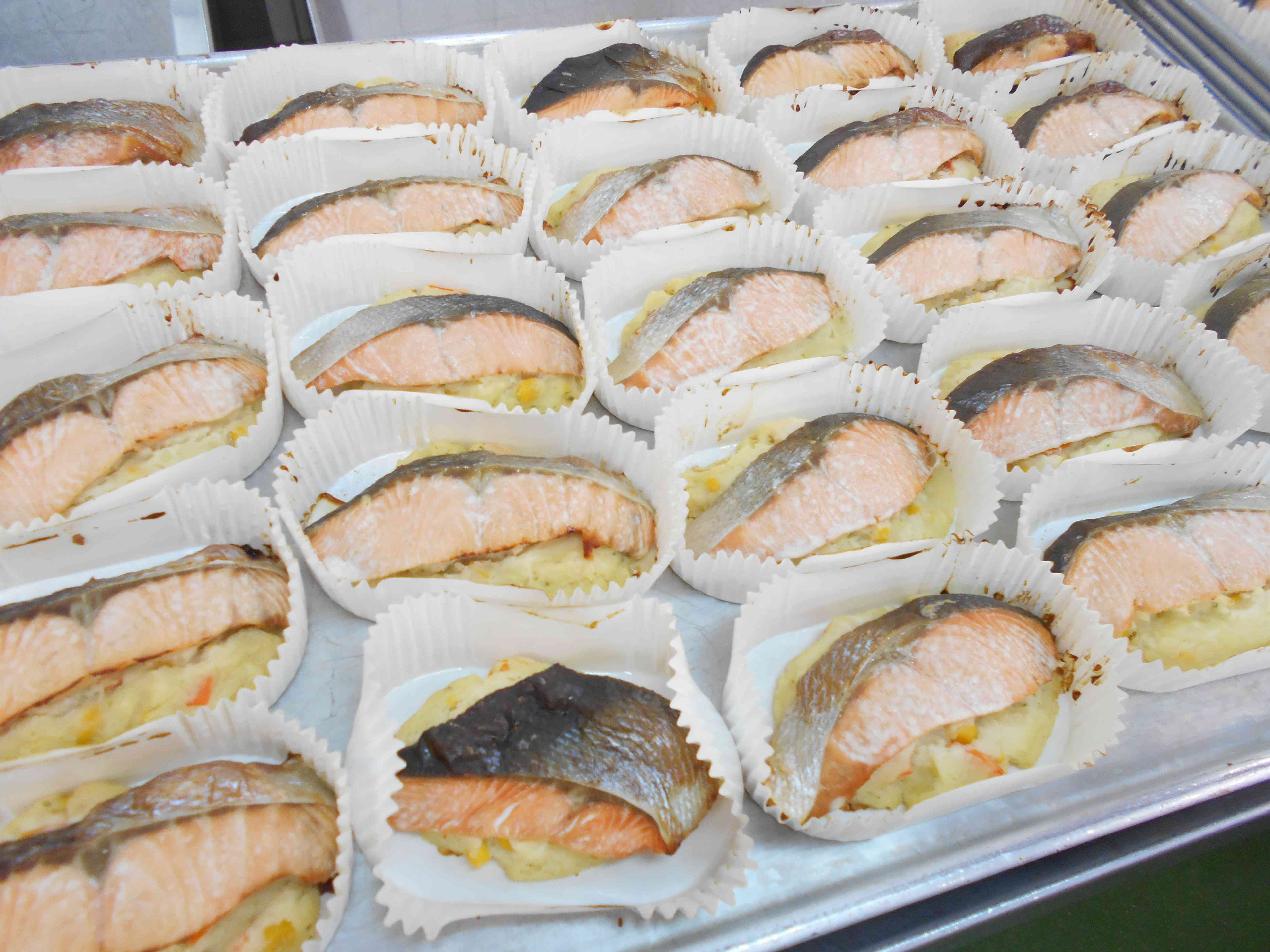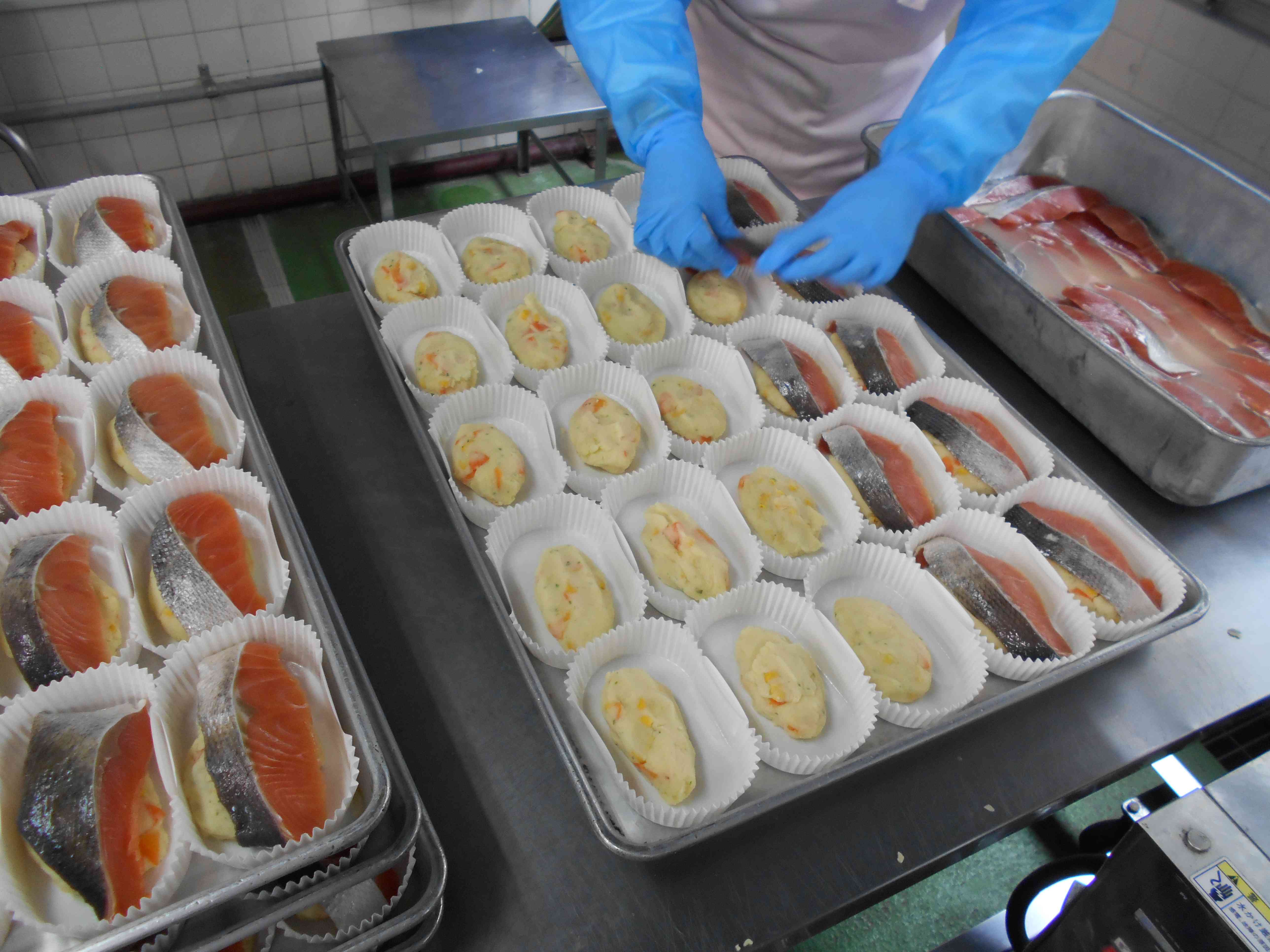 ○牛乳 ○ご飯 〇鮭(さけ)のポテトサラダ焼き 〇だし醤油(じょうゆ)のお浸し(おひたし) 〇卵とえのきたけの味噌汁 ☆一口メモ☆ サケのポテトサラダ焼きは、関西の料亭の板前さんに教わった料理です。和食を食べてほしいという思いで、給食のために考えてくださいました。ポテトサラダはマヨネーズを使わずに豆乳を使ったあっさりとした味で、サケと合う仕上がりになっています。 カップに入っている料理の献立の日は、給食室は大忙しです。ポテトサラダを作り、カップに入れ、その上にサケを乗せて、さらに焼くという、いくつもの調理工程を経て、みなさんに届けています。私たちのために、和食の料理を考えてくださった板前さん、それを作ってくださった調理員さんに感謝していただきましょう。 写真2枚目 カップに、手作りのポテトサラダ、サケを入れます。 調理工程が多いので、給食に間に合うように時間を逆算して作業を進めています。 この後焼いて完成です。 写真3枚目 焼き上がったところです。今日のさけは、国産の天然鮭で、淡いピンク色をしています。 脂ののり方が適度であっさりした味で、身はやや筋肉質でサケの風味が濃く感じられます。 (外国産の養殖鮭は、濃い赤色をしていて脂が多く、脂で身がやわらくなっています。)【添付ファイル】