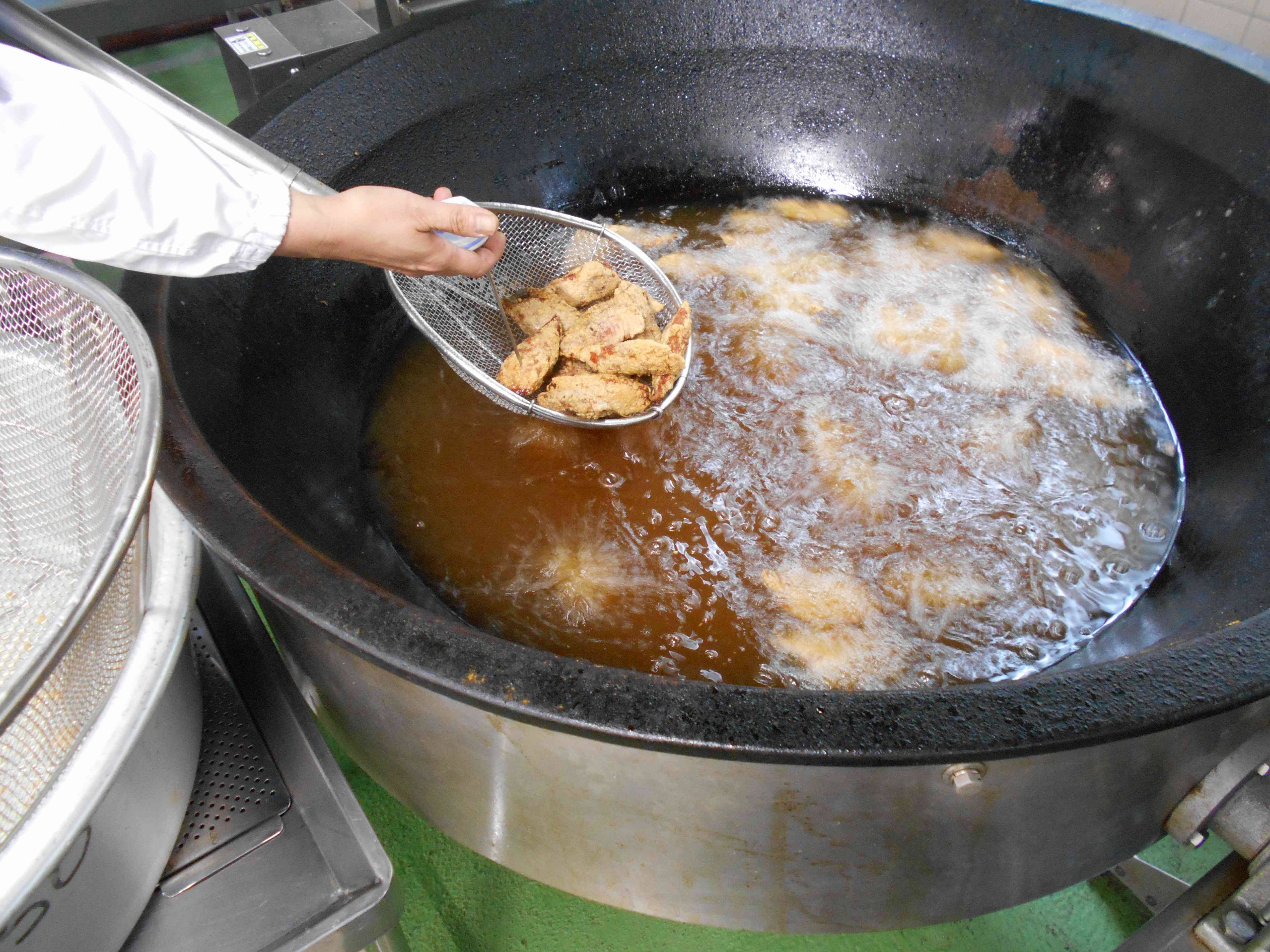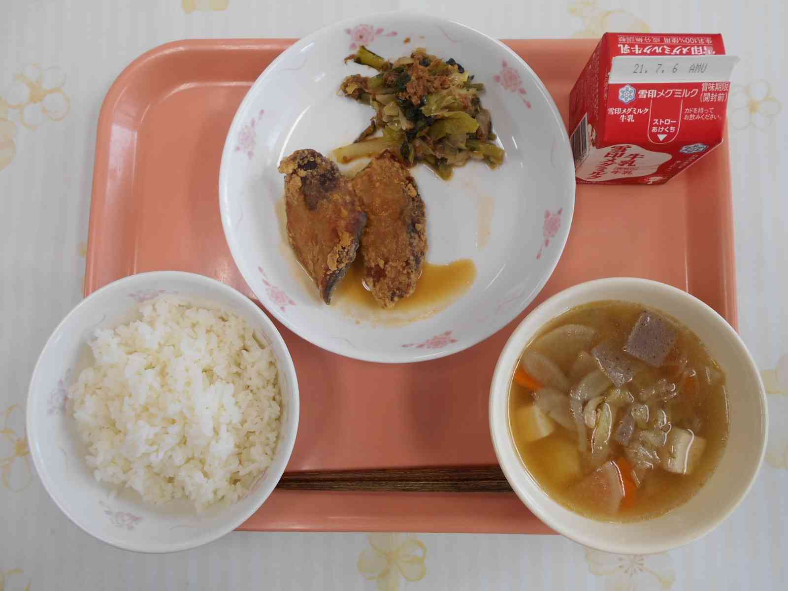 ○牛乳 ○ご飯 〇鰹(かつお)の味噌だれ 〇小松菜のおかか炒め 〇けんちん汁 ☆一口メモ☆ 給食でよく食べている小松菜は東京生まれの野菜です。小松菜の名前の由来について、こんな昔話があります。時をさかのぼること300年前、江戸時代のころのお話です。徳川の代々の将軍たちは、冬になると今の江戸川区にある小松川村にたびたび鷹(たか)狩りに訪れていました。八代将軍、徳川吉宗が、鷹狩りに来たときに、青菜の入ったすまし汁を食べました。その青菜がおいしかったので、青菜の名前を村人にたずねましたが、名前はありませんでした。そこで、徳川吉宗は、村の地名から、青菜を小松菜と呼ぶように言ったという逸話があります。 (五代将軍徳川綱吉が命名したという説もあります。) 写真2枚目 お魚屋さんが、立派なかつおの切り身を持って来てくれました。 写真3枚目 かつおの食べ方といえば、かつおのたたきを思い浮かべる人が多いのではないでしょうか。 かつおは油で揚げてもおいしくいただけます。 ご家庭で、かつおのたたきが余ってしまったときにも、揚げてアレンジするのもおすすめです。 油で揚げて、表面がカリッと色づいて、おいしそうな見た目になりました。 中心温度を測って、火が通っていることを確認したら揚げ終わりです。 給食時間までに料理の温度が下がってかたくなりやすいので、 揚げた後にみそダレをかけて、しっとりするようにしています。【添付ファイル】