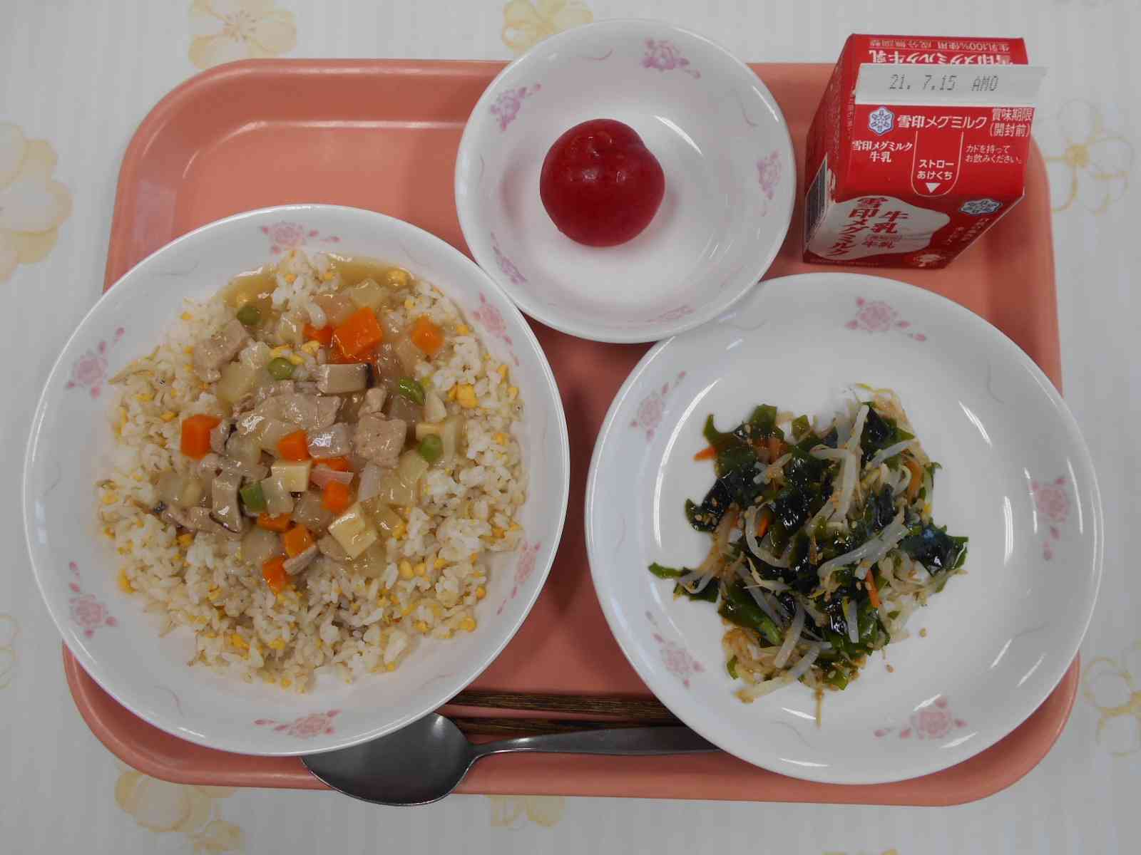 ○牛乳 ○あんかけじゃこ炒飯(チャーハン) 〇もやしとわかめのごま醤油(じょうゆ) 〇プラム ☆一口メモ☆ 今は、プラムの旬の時期です。プラムの皮はむく必要がなく、皮ごと食べられます。中心の大きな種に気をつけて食べてください。国産の果物は、私たちの食生活に季節の移り変わりを感じさせてくれます。旬の時期は短いので、おいしいプラムが食べられるのは今の時期だけです。春や真夏には季節ではないので、食べられません。今だからこそおいしい旬のプラムを食べて、季節感を楽しみましょう。【添付ファイル】