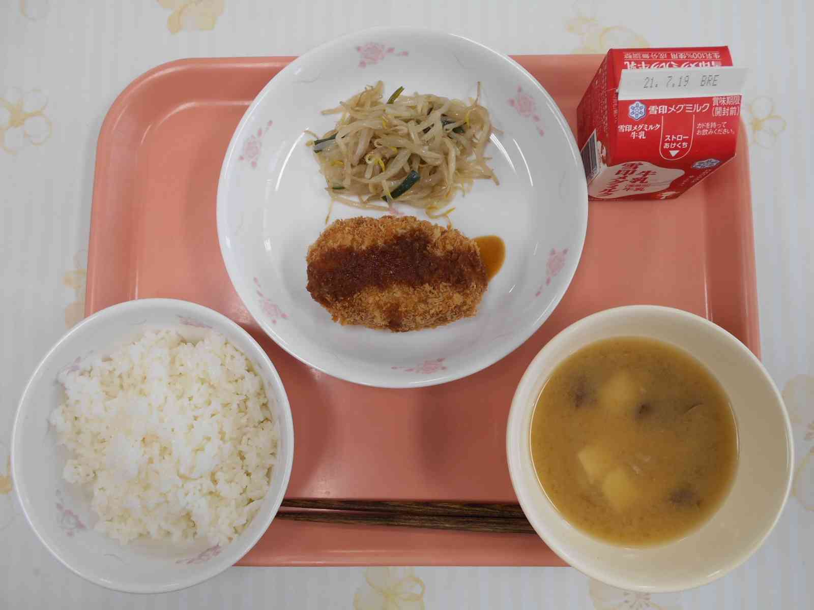 ○牛乳 ○ご飯 〇卵コロッケ 〇もやしのソテー 〇豆腐ときのこの味噌汁 ☆一口メモ☆ 暑い日が続くと、体がだるく感じたり、食欲がなくなったりと調子が悪くなってしまうことがありませんか。これは夏バテの症状です。夏バテを防ぐには、食事がとても大切です。食事のポイントは、栄養バランスがよいことです。ごはん、おかず、汁物などいろいろな料理を食べると、栄養バランスがよくなります。食べやすいそうめんだけ食べる、冷たくてあまい飲み物ばかり飲むような食生活だと、深刻な夏バテにつながります。 しっかり食べて、勉強やスポーツに全力で取り組める夏を送りたいものですね。そのためには、今日の給食から取り組みませんか。ごはん、おかず2種類、汁物がそろっていて、すべての料理を食べると栄養バランスがよくなります。残さず食べて、夏の体調を整えていきましょう。【添付ファイル】