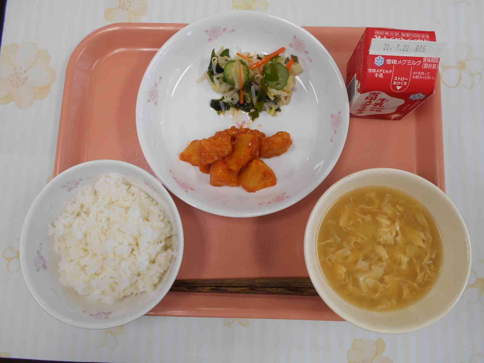 ○牛乳 ○ご飯 〇イカとじゃが芋のチリソース 〇わかめ入りサラダ 〇卵スープ ☆一口メモ☆ 今年の4月から牛乳パックの学校でのリサイクルが始まりました。飲み終わったパックを洗って、乾かし、平らに開くリサイクル活動を約4ヶ月間続けてきましたね。東陽中で、夏休み前までにリサイクルしたパックは、1万9千枚以上もの枚数になります。リサイクルして生まれ変わったトイレットペーパーの数を計算すると、600個以上です。もしも、牛乳パックを燃やすゴミにして捨てていたら地球温暖化につながる二酸化炭素がたくさん発生してしまいます。しかし、東陽中のリサイクル活動のおかげで16キログラムの二酸化炭素を排出しないで済みました。(パック1枚あたり8.6グラムの二酸化炭素削減と計算) 私たちの活動は、確実に地球環境を守ることにつながっています。【添付ファイル】