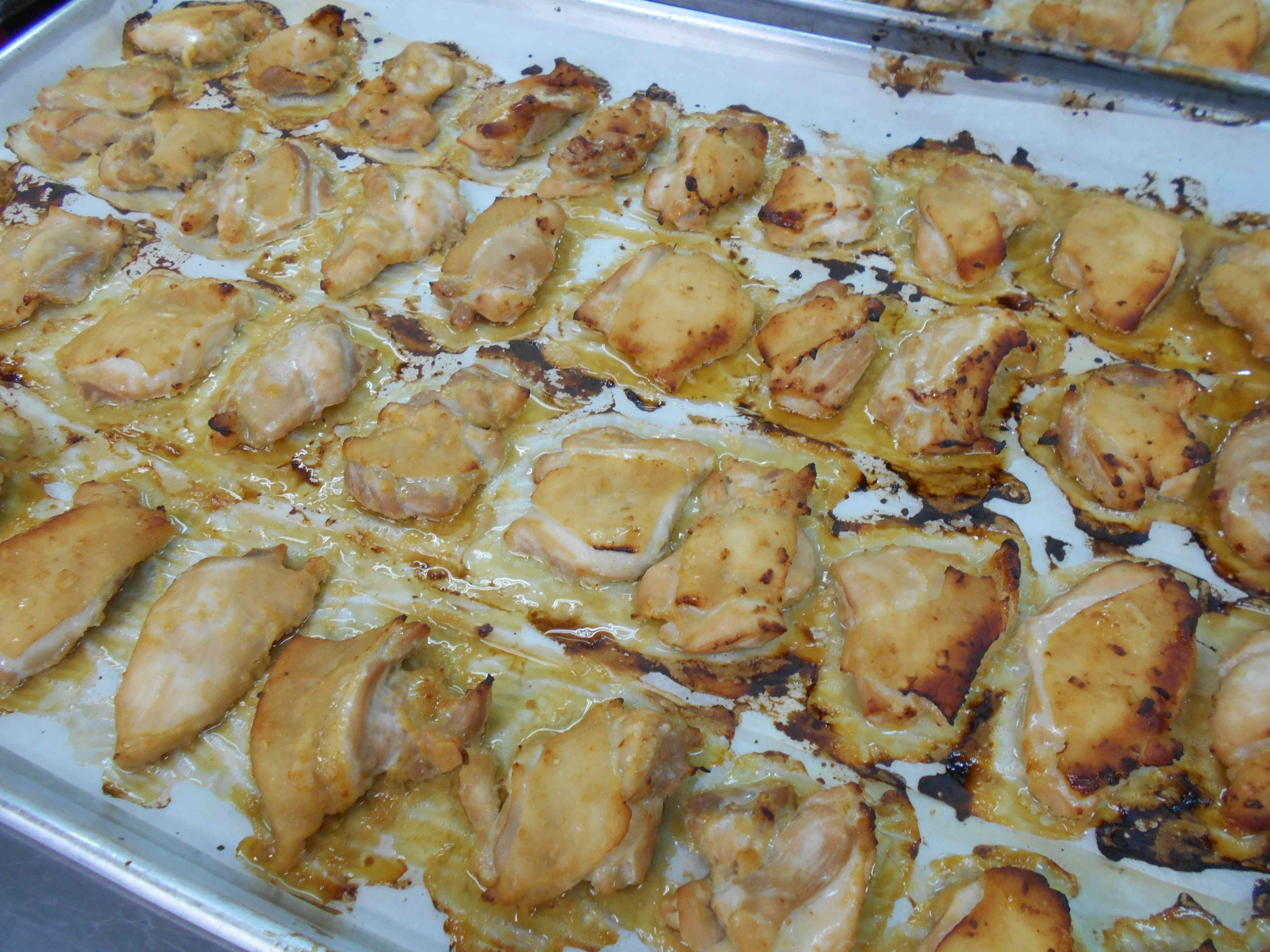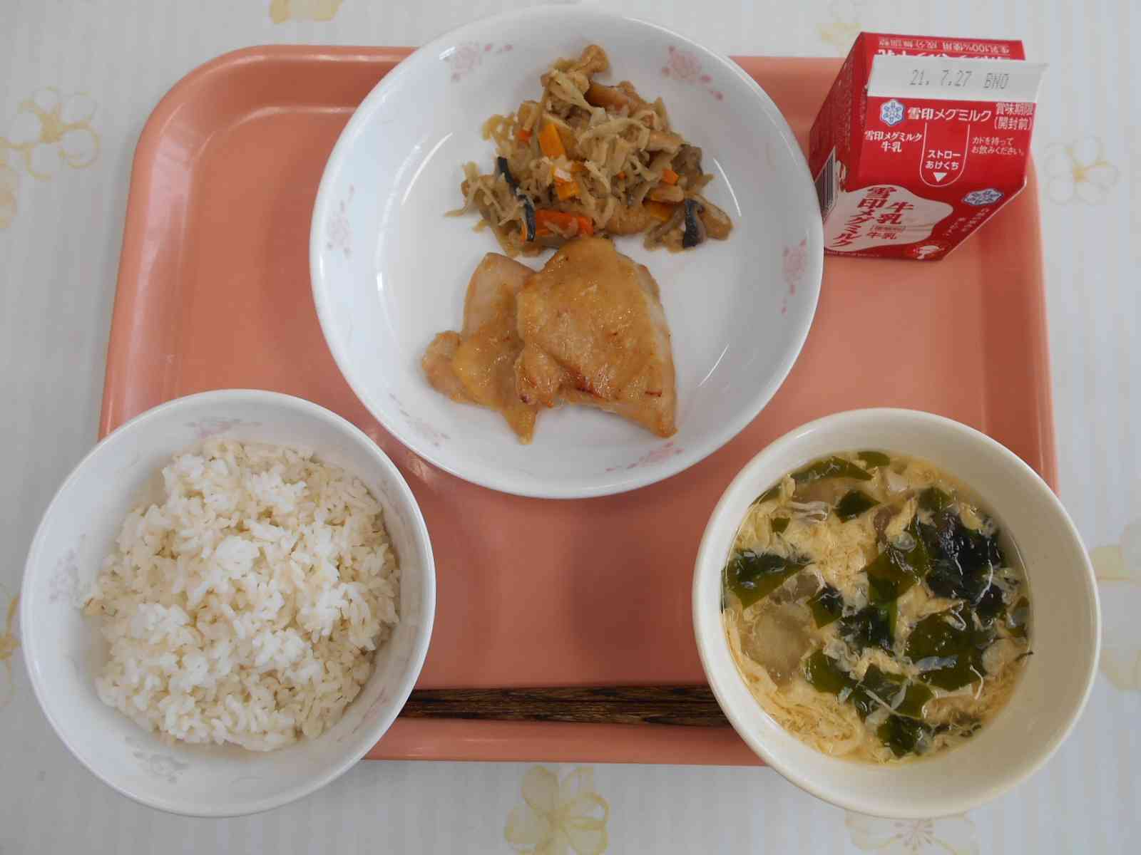 ○牛乳 ○麦ご飯 〇鶏肉のニンニク味噌焼き 〇切り干し大根の炒め煮 〇冬瓜(とうがん)のかきたま汁 ☆一口メモ☆ 冬瓜は、漢字で「冬のウリ」と書きますが、夏に収穫されます。切らずに涼しい場所に置いておけば、冬まで食べられると言われているので、この字があてられました。冬瓜には、カリウムという栄養素が多く含まれています。体の水分を外に出して、むくみを解消したり、体にこもった熱を出して、体温を下げるはたらきがあります。 写真2枚目 ニンニク入りのみそだれにつけ込んだ鶏肉を天板にのせて焼きました。 お肉は焼くと縮んで小さくなってしまいますが、なるべく大きな形になるように皮目を上にして1枚ずつ広げました。 写真3枚目 オーブンで焼くときは、食材や料理の仕上がりに合わせて、焼き時間、温度、蒸気量、風量を調整しています。 おいしいそうな焼き色がつくタイミングを見計らって、オーブンから取り出します。 食材の品質、気温によっても変わってくるので、同じ料理でも毎回見ながら調整しています。【添付ファイル】