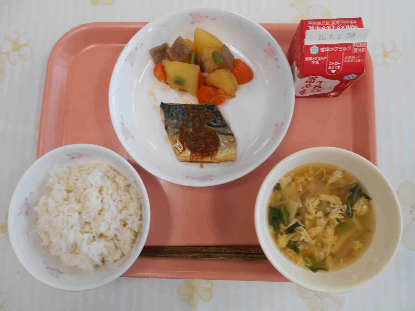 ○牛乳 ○麦ご飯 〇鯖(さば)のねぎソースがけ 〇野菜の炒め煮 〇卵と高野豆腐(こうやどうふ)の味噌汁 ☆一口メモ☆ 昨日の給食は、第1回オリンピックの開催国、ギリシャの味めぐりでした。そして、今日は、今年オリンピックが開催される日本の食事、和食です。今日のようなごはん、おかず2種類、汁物の組み合わせを一汁二菜(いちじゅうにさい)と言います。おかずが3種類になると、一汁三菜と言います。このような組み合わせの献立は、和食の特徴のひとつです。一汁二菜や一汁三菜の和食の献立は、栄養バランスが整っていて、健康にも良いです。【添付ファイル】