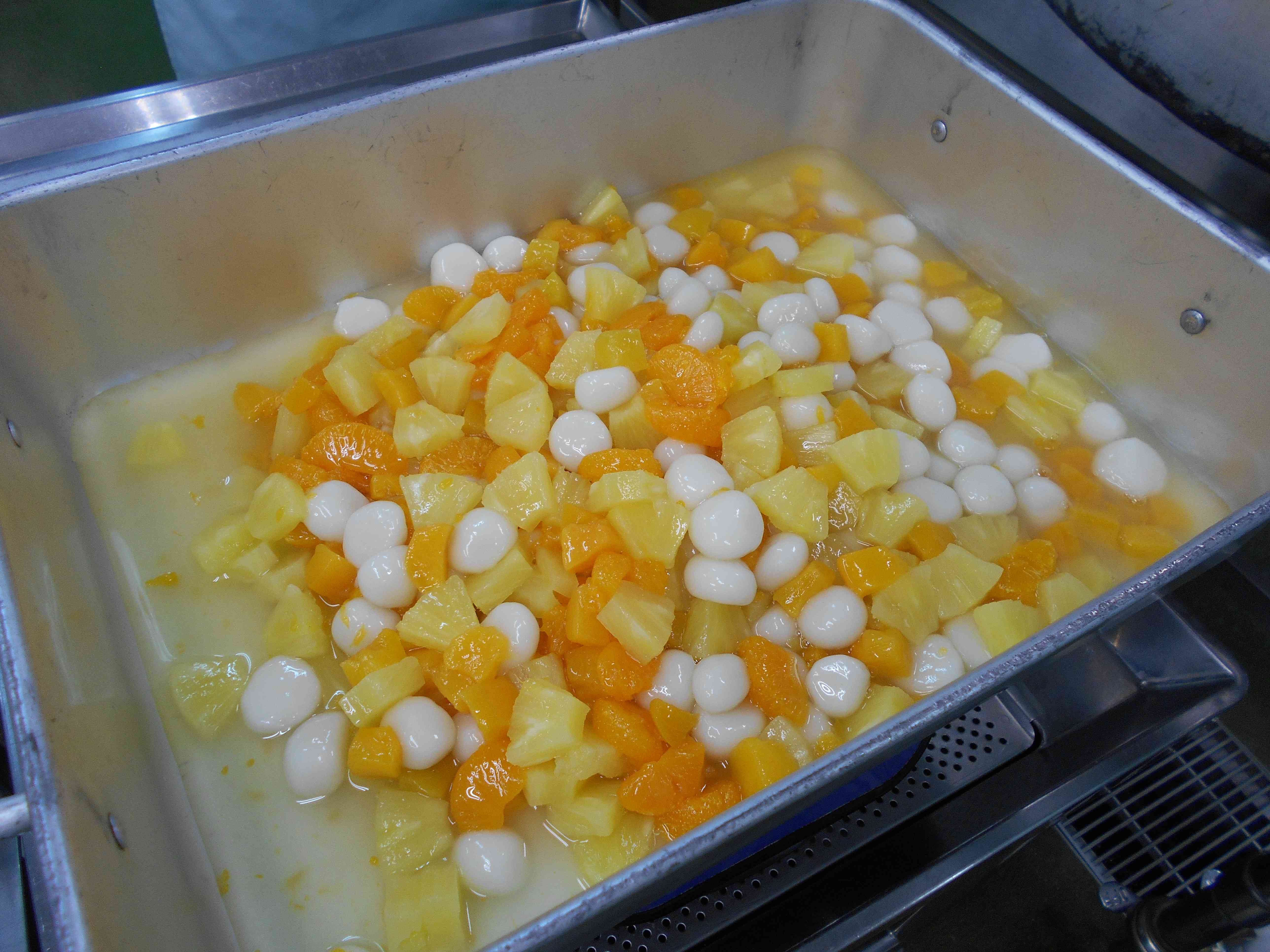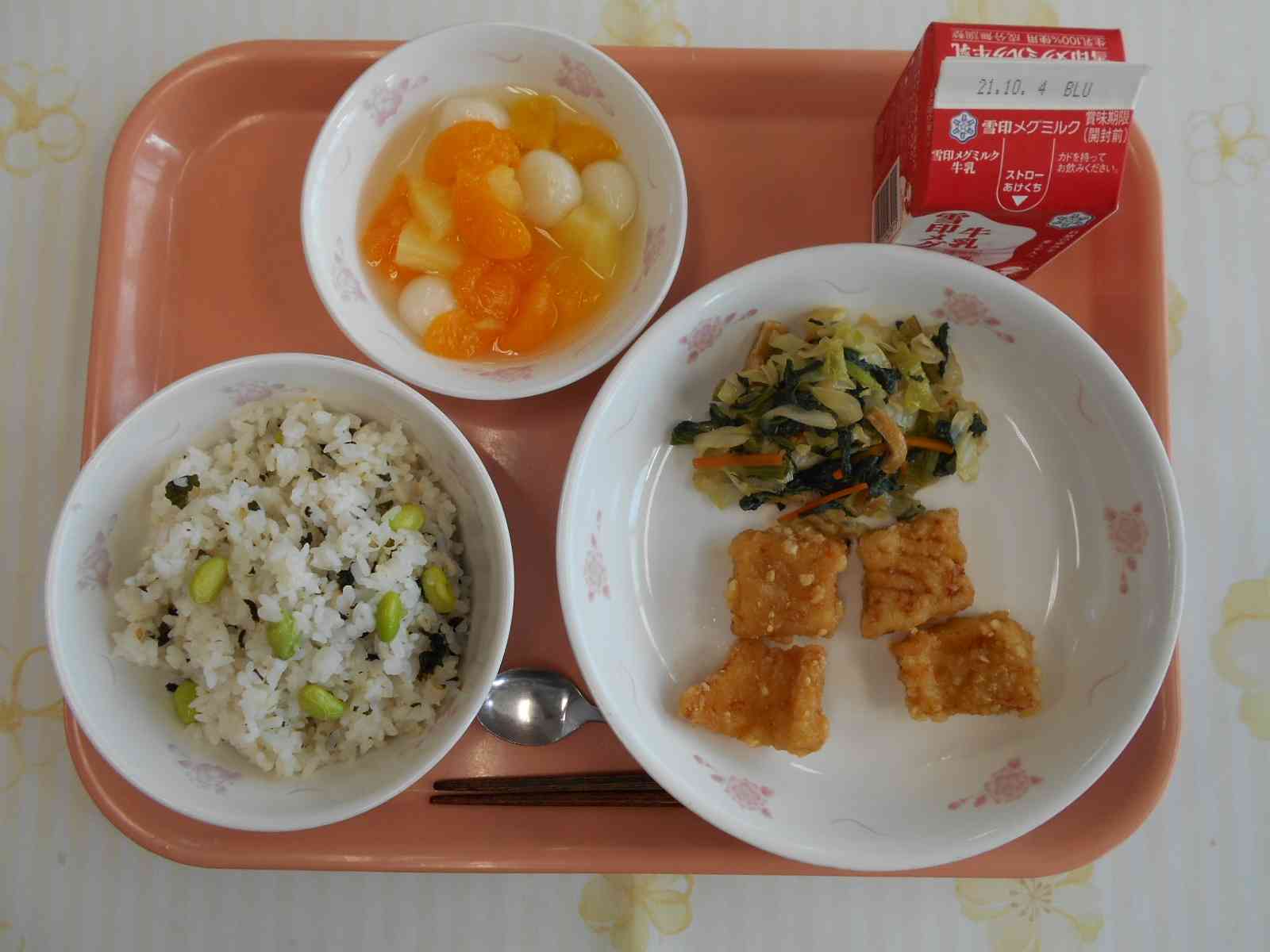 <十五夜の行事食> ○牛乳 ○枝豆ご飯 〇いかのかりん揚げ 〇青菜の炒め煮 〇白玉ポンチ ☆一口メモ☆ 十五夜は中秋の名月とも呼ばれています。月が見える場所に、月見団子や里芋、枝豆、栗などの秋の作物をお供えし、ススキを飾って、農作物の収穫の感謝や豊作を願う行事です。秋に収穫できる枝豆を炊き込んだ枝豆ごはん、満月のような白玉団子を入れた白玉ポンチは、行事食です。 写真2枚目 白玉粉で作ったもちもちの白玉団子をフルーツに混ぜました。 調理員さんがひとつひとつ手で丸めた手作りです。デザートスプーンですくいやすいように、なるべく小さめのサイズにしてくれました。全校生徒分で、おそらく1000個以上の白玉団子を丸めていると思います。おかげで行事に合う白玉ポンチをいただけました。人気のデザートなので、食べ残しもとても少なかったようです。【添付ファイル】