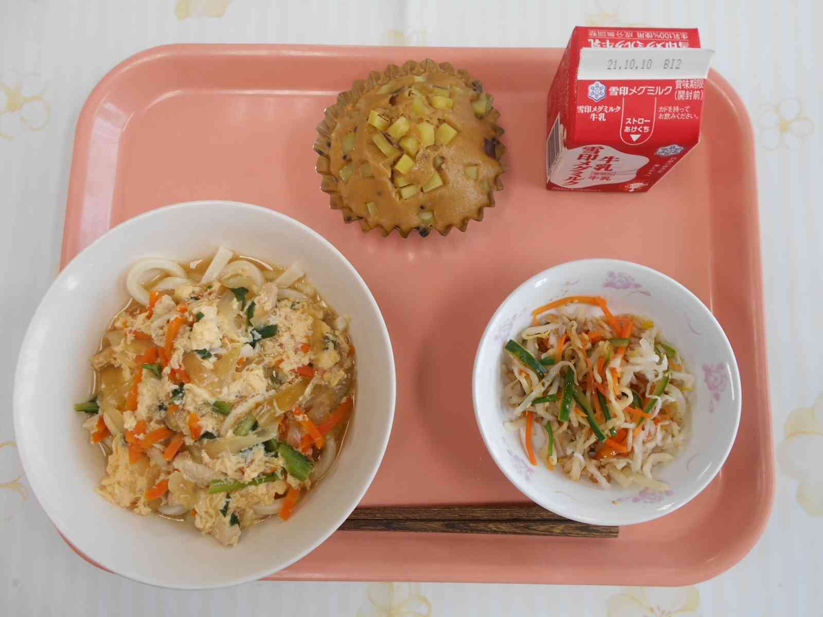 ○牛乳 ○卵とじうどん 〇はりはり漬け 〇黒糖さつま芋蒸しパン ☆一口メモ☆ 〈減塩についてくわしくなれる献立週間〉 今週1週間は、健康のために必要な減塩について詳しくなれる献立が登場します。みんなで減塩について詳しくなろう。 日本で暮らす人の10人に7人は塩分をとりすぎています。塩分のとりすぎは、大人になってからの病気につながるので、若いうちから塩分をとりすぎない食生活が大切です。 ~食べ方の工夫~ うどんやラーメンのスープには、めんをおいしく食べるために塩分が多く入っています。外食のラーメンは、スープまで飲みきるとほぼ1日分の塩分をとってしまうものもあります。今日のうどんのおつゆは、外食と比べると塩分控えめですが、それでも健康のために望ましい塩分量を超えてしまっています。おつゆやスープのあるうどんやラーメンを食べるときは、飲み干さないと減塩することができます。 ひとつ注意ですが、スープを飲まないときでも、今日のうどんには野菜や鶏肉、卵などの栄養のある食材が入っているので、汁の中の具については食べきるように心がけてくださいね。 写真2枚目 黒砂糖を入れた蒸しパンの生地をカップにいれて、季節のさつまいもをトッピングしました。 黒砂糖は鉄分などのミネラルが多いので、白砂糖だけで作った蒸しパンと比べると、今日の蒸しパンは栄養もとれます。 黒砂糖のかたまりが残らないようになめらか溶かしたこと、食べやすいようにさつまいもを小さめの角切りにしたことが、今日の蒸しパンのこだわりポイントです。 写真3枚目 蒸し上がったところの写真です。 ふっくらふくらみました。蒸しパンやカップケーキなどの火を通してからふくらむ料理のときは、ふくらみ始めるまでどきどきしてしまいます。 何度か作っているレシピですが、しっかりふくらんでほっとしました。【添付ファイル】
