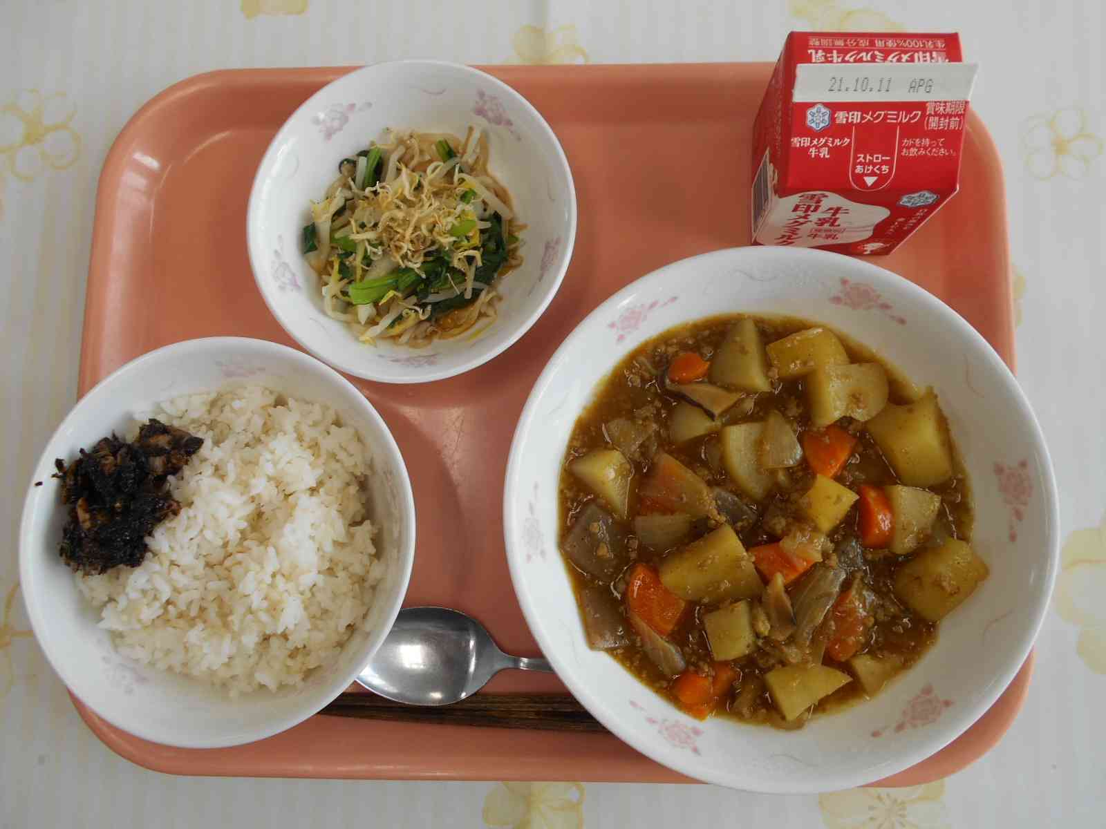 ○牛乳 ○麦ご飯 〇のりとあさりのつくだ煮 〇じゃが芋のカレーそぼろ煮 〇じゃこ入りお浸し ☆一口メモ☆ 〈減塩についてくわしくなれる献立週間〉 ~作り方の工夫~ スパイス類やしょうがやにんにくなどの香味野菜を料理に取り入れると、味つけにメリハリがついて少ない塩分でおいしい料理が作れます 今日は、いつもの肉じゃがをお醤油控えめで作ったところに、カレー粉をプラスして、スパイシーで香りよく作りました。ほかにも、以下のようにスパイスや香味野菜はいろいろな料理の減塩に使えます。 •チャーハンにコショウを多めに入れて味をひきしめる •薄味に仕上げたみそ汁に七味唐辛子で辛味を加える •唐揚げなどの揚げ物にガラムマサラで風味をアップさせる •中華風のスープなどにはラー油やにんにくを使って辛みと香りを楽しむ【添付ファイル】