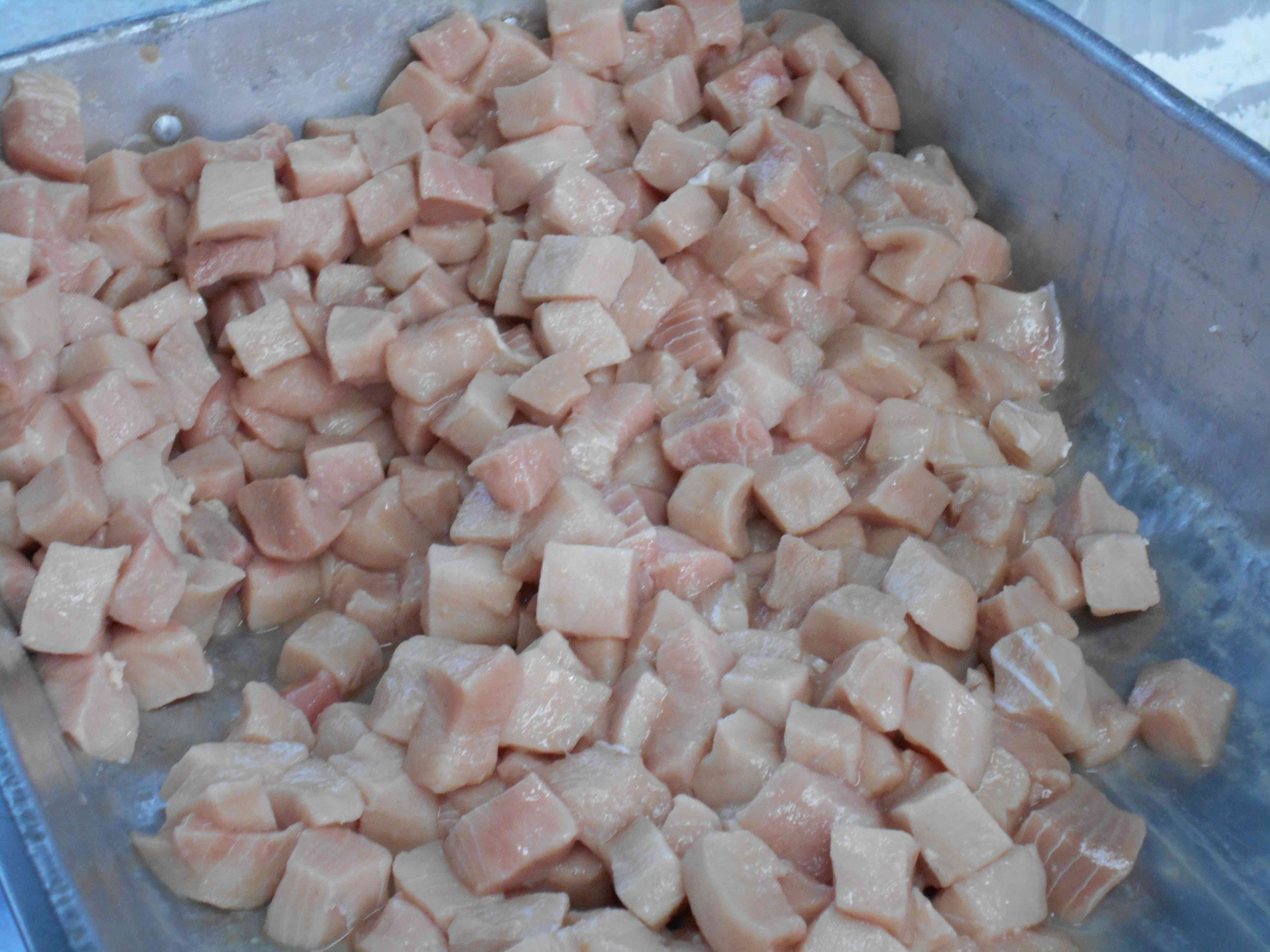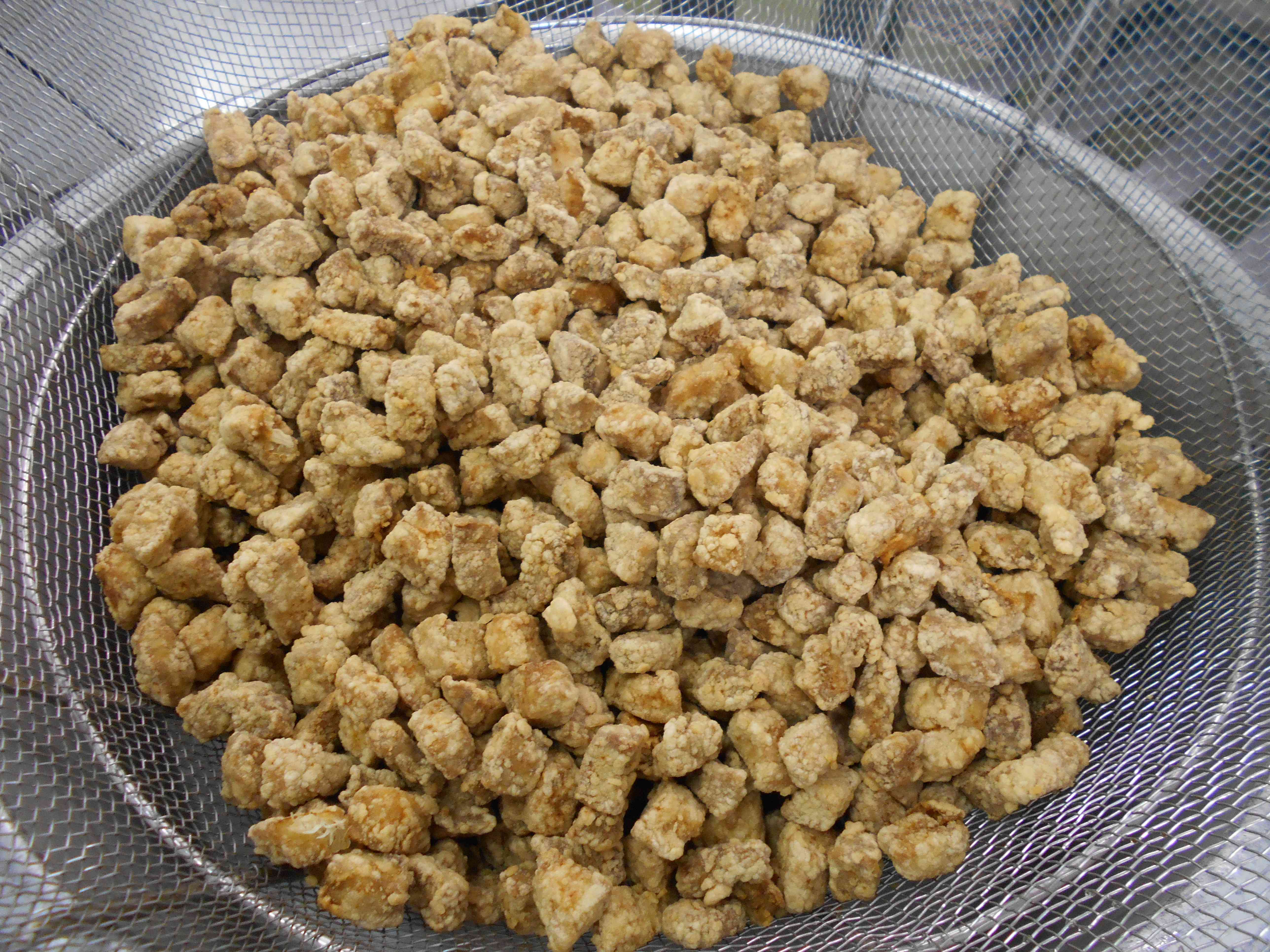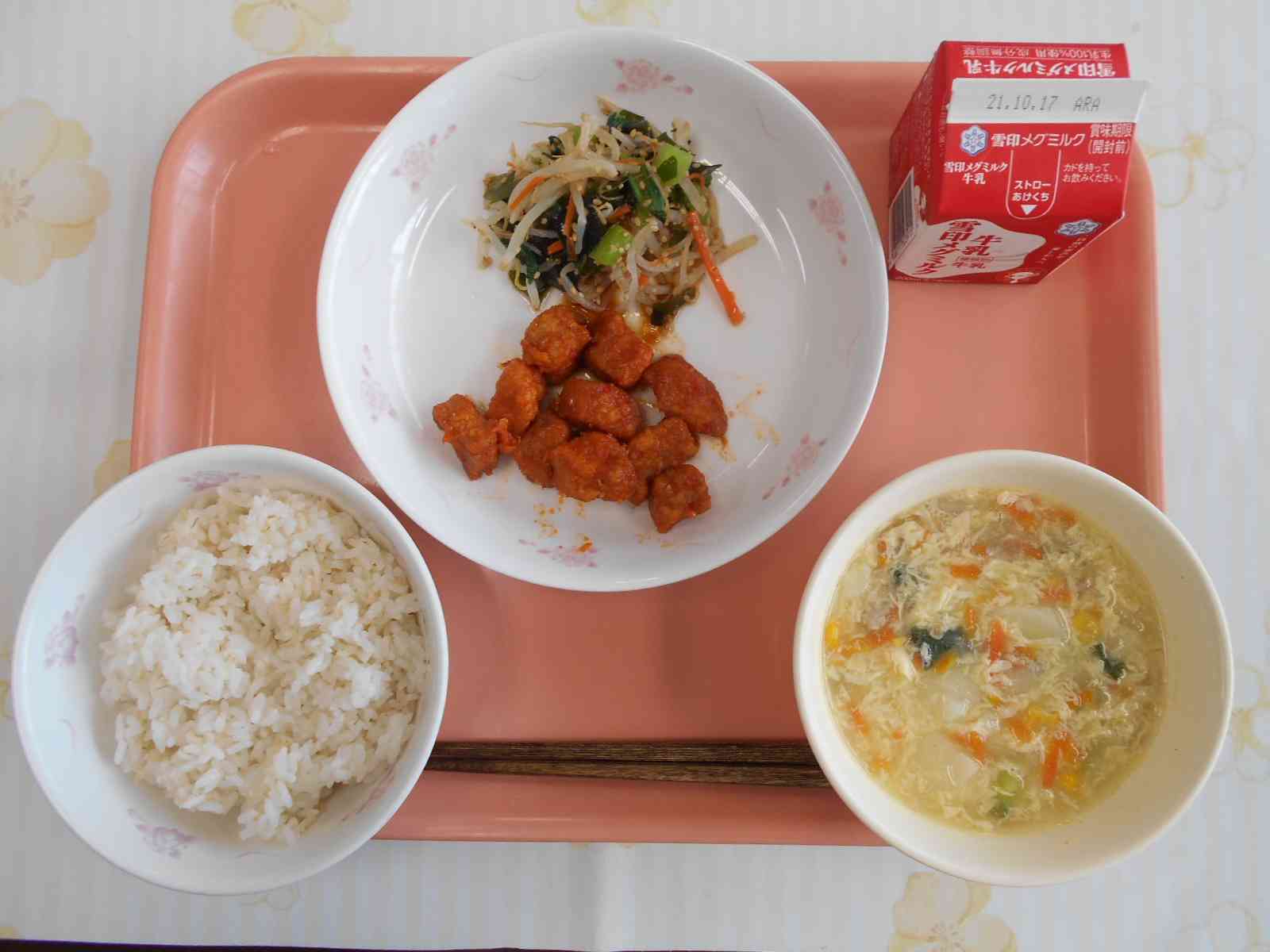 ○牛乳 ○麦ご飯 〇魚のチリソ-ス 〇もやしとわかめのごま醤油(じょうゆ) 〇中華風卵入りコーンスープ ☆一口メモ☆ 日本には、ワニを刺身で食べる地域があります。ワニの刺身と聞いたら、驚く人も多いかもしれません。ただし、ワニと言っても皆さんがイメージする、は虫類のワニとは違います。ワニの刺身のワニは、魚のサメのことです。広島県の一部の地域では、サメをワニと呼んでいます。今日の魚は、サメです。サメを初めて食べる人もいるかもしれませんね。サメは、身が柔らかくて脂っこくなく、鶏肉にも似ている食感です。サメは鮮度が落ちると、とても強いにおいを放つようになりますが、産地から低い温度で輸送をして、新鮮なサメを魚屋さんが持ってきてくれているので、クセがないものをいただくことができます。 写真2枚目 今日のお魚はサメでした。火を通す前のサメはうすいピンク色をしています。 写真3枚目 油で色よくカリッと揚げました。これをチリソースとからめて完成です。 給食のチリソースは、ケチャップをベースにニンニク、しょうが、長ネギの香味野菜、 トウバンジャン、砂糖、酒、パプリカパウダー、チリパウダーの調味料・スパイスを加えて風味良く作っています。【添付ファイル】