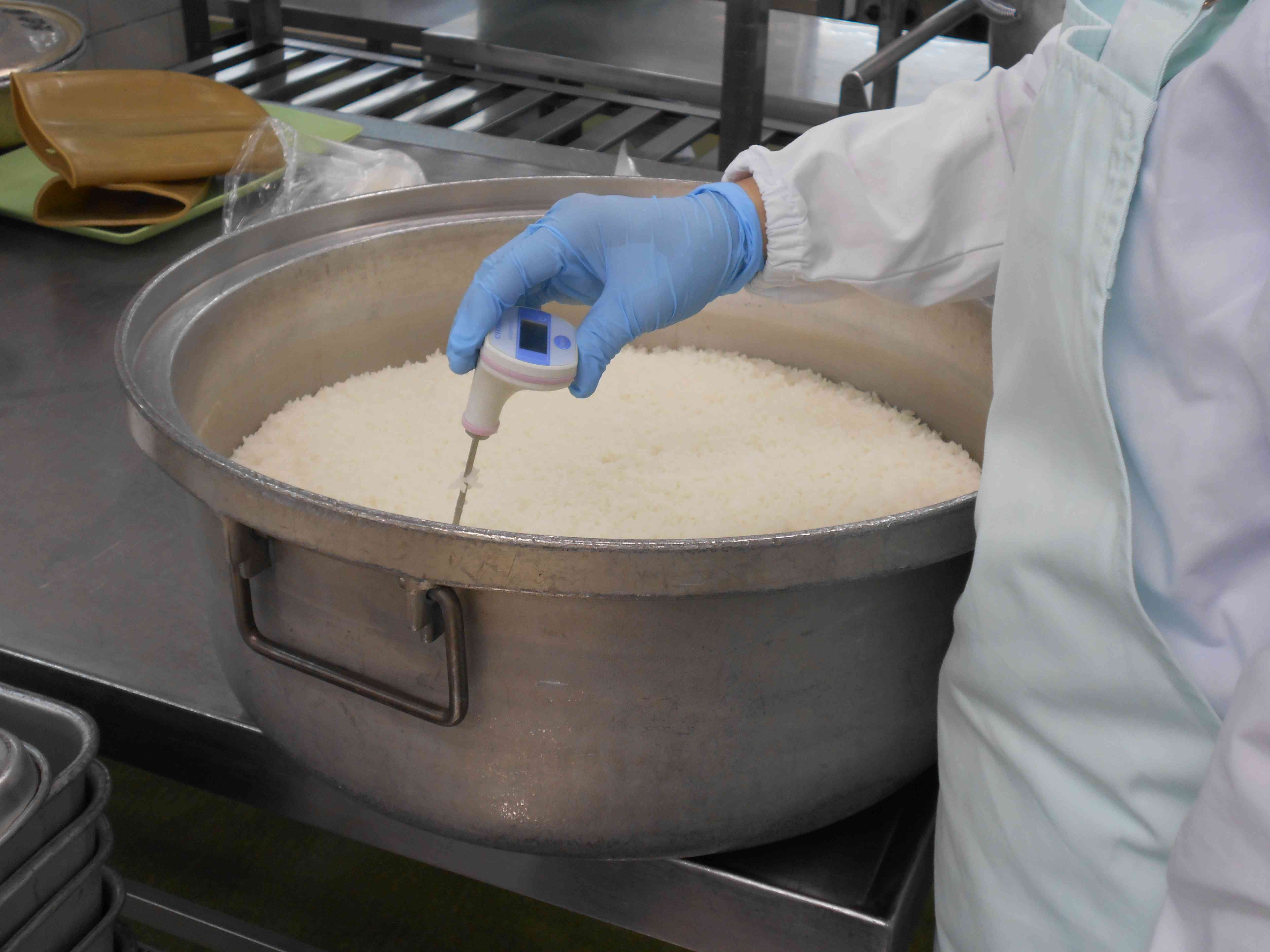 ○牛乳 ○ご飯 新米あきたこまち 〇鮭(さけ)の照り焼き 〇ひじきと大豆の炒め煮 〇ごま味噌汁 ☆一口メモ☆ 新米の時期は9月から11月ごろ。お米の品種によって稲刈りの始まる時期が違うので、新米が始まる時期も違います。給食でいつも食べているお米「あきだわら」は新米が遅めの品種です。「あきだわら」よりも新米の時期が早い「あきたこまち」で、今日は新米を楽しみましょう。 写真2、3枚目 ごはんが炊き上がったら、温度計で測って記録します。(衛生管理のためです) その後、たきムラを均一にするために、上下をふんわり返してからクラスのバットに配缶していきます。 東陽中でいつも食べているお米の新潟県産「あきだわら」は、12月納品分から新米になる予定です。 新米がお店に並び始めるなか、12月まで待ちきれないという思いで、いつもと違う品種の茨城県産「あきたこまち」で新米をいただきました。 炊飯するときのお水の量は、新米に合わせて少なめに調整して炊きました。 ごはんの残りが最近のなかでは少なかったように思います。 新米を十分に味わって食べてくれた人が多かったのかもしれません。【添付ファイル】
