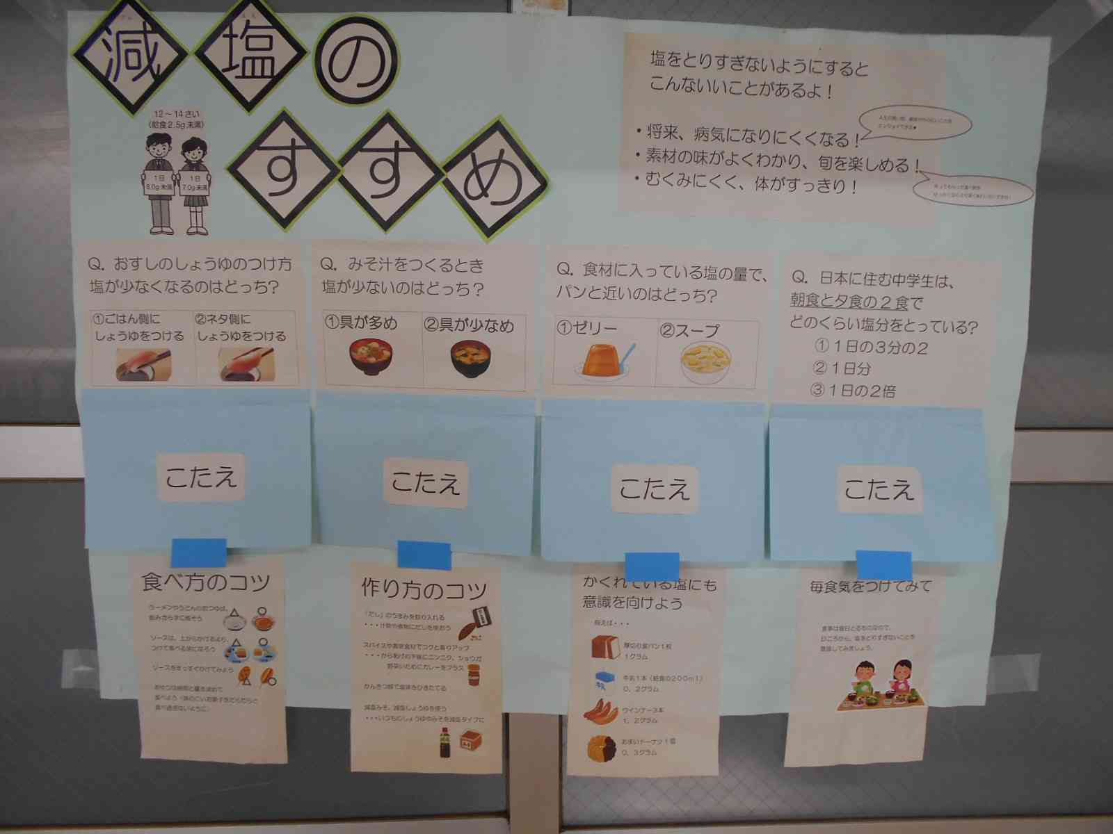 10月13日(水) 9月末に「健康のことを考えた減塩についてくわしくなれる献立週間」を実施し、減塩についての食べ方や調理の工夫を紹介しました。 このことをまとめた掲示が1階給食室前に掲示してあります。減塩についてのクイズもあります。ぜひご覧ください。