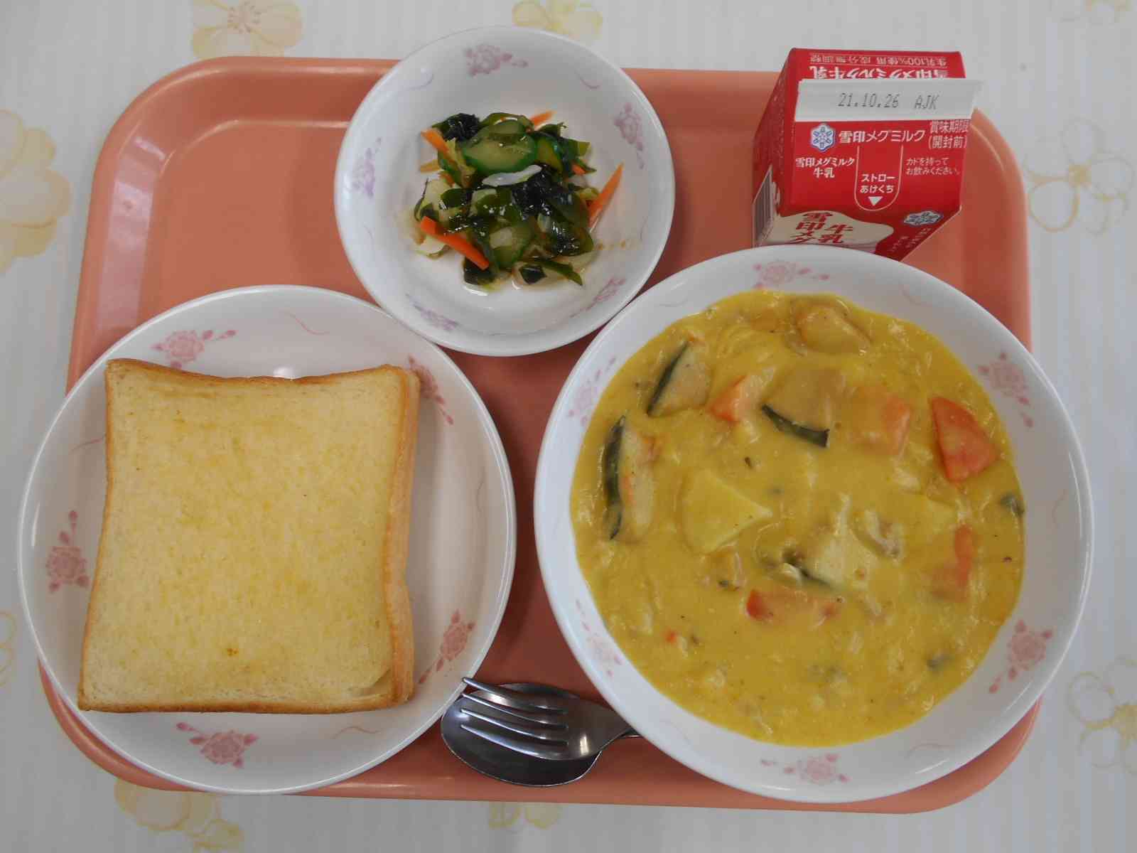 ○牛乳 ○レモンシュガートースト 〇かぼちゃの豆乳シチュー(米粉) 〇わかめ入りサラダ ☆一口メモ☆ クイズです。日本のレモンの旬はいつでしょうか。 (1)春から夏 (2)秋から冬 (3)1年中 ・・・答えは(2)秋から冬です。 スーパーなどの店頭に、一年を通して並んでいるレモン。 さわやかなイメージから、レモンの旬は夏と思っていた人はいませんか。国産レモンの旬って実は秋から冬なんです。 秋からグリーンレモンと呼ばれるレモンが、そして真冬には皆さんがよく見かける黄色が鮮やかなイエローレモンが出回ります。【添付ファイル】