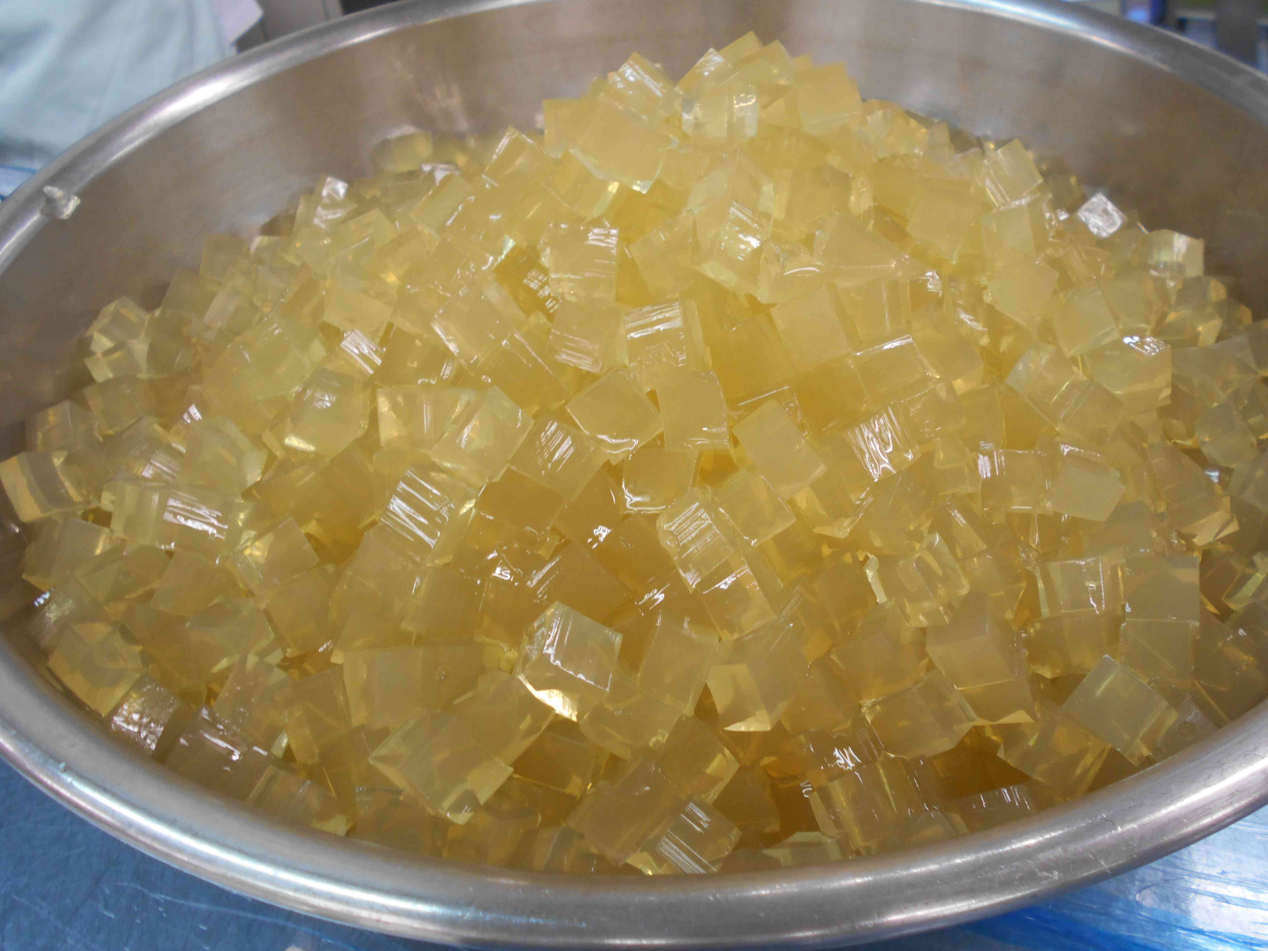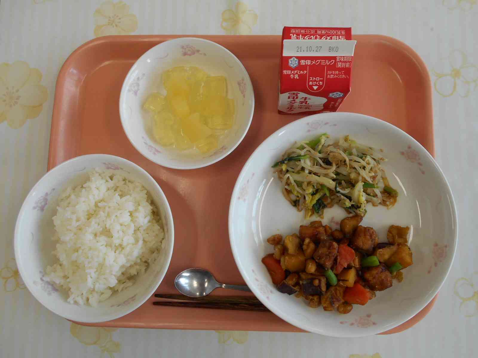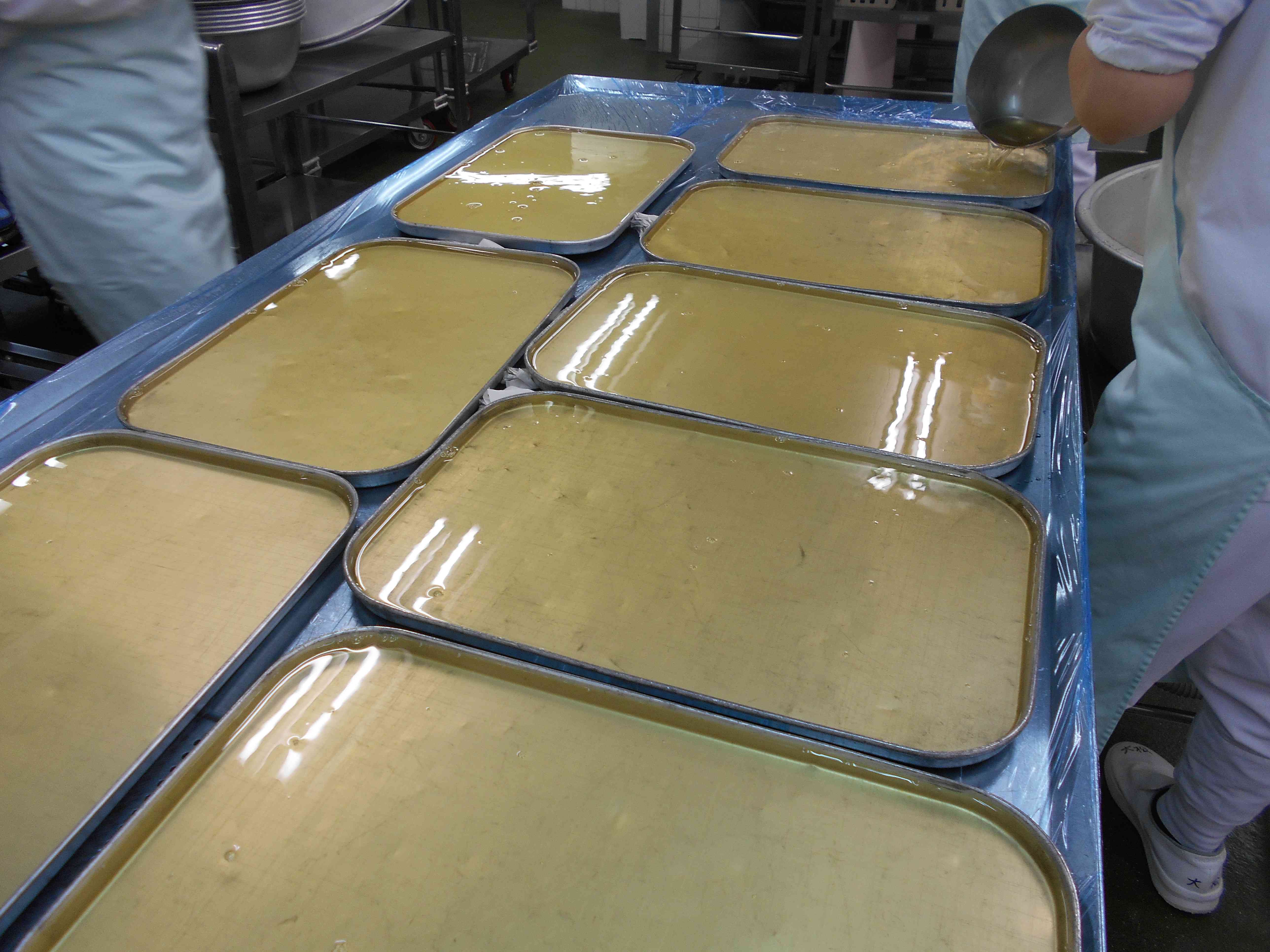 ○牛乳 ○ご飯 〇魚と野菜の五色和え 〇ごまかけお浸し 〇ころころりんごゼリー(果肉入り) ☆一口メモ☆ みなさんは、どんなとき秋の訪れを感じますか。夏服から冬服に衣替えをしたとき、夕方肌寒くなったとき、木々の葉が色づいてきたとき。いろんな感じ方があることでしょう。秋の訪れを感じることのひとつに、食べ物があります。今日は、秋になったら収穫が始まるりんごを給食に取り入れました。日本は四季がはっきりしているので、季節に合った食べ物を食べることが大切にされてきました。秋が旬のりんごを使ったゼリーは、春や夏に食べるときよりも特別に感じられませんか。 写真2枚目 りんごゼリーは、粉寒天でりんごジュースを固めています。 バットのふたがちょうどいい厚みなので、ふたを裏返してゼリーを固める容器として活用しています。 写真3枚目 ゼリーが固まったら、食べやすい大きさの四角形にカットします。 調理員さんが、角切りの大きさがそろうように丁寧に包丁で切ってくれました。 反射した光がきらきらして、宝石のようにきれいな見ばえになりました。 切ったゼリーをりんごの缶詰と混ぜ合わせて完成です。【添付ファイル】
