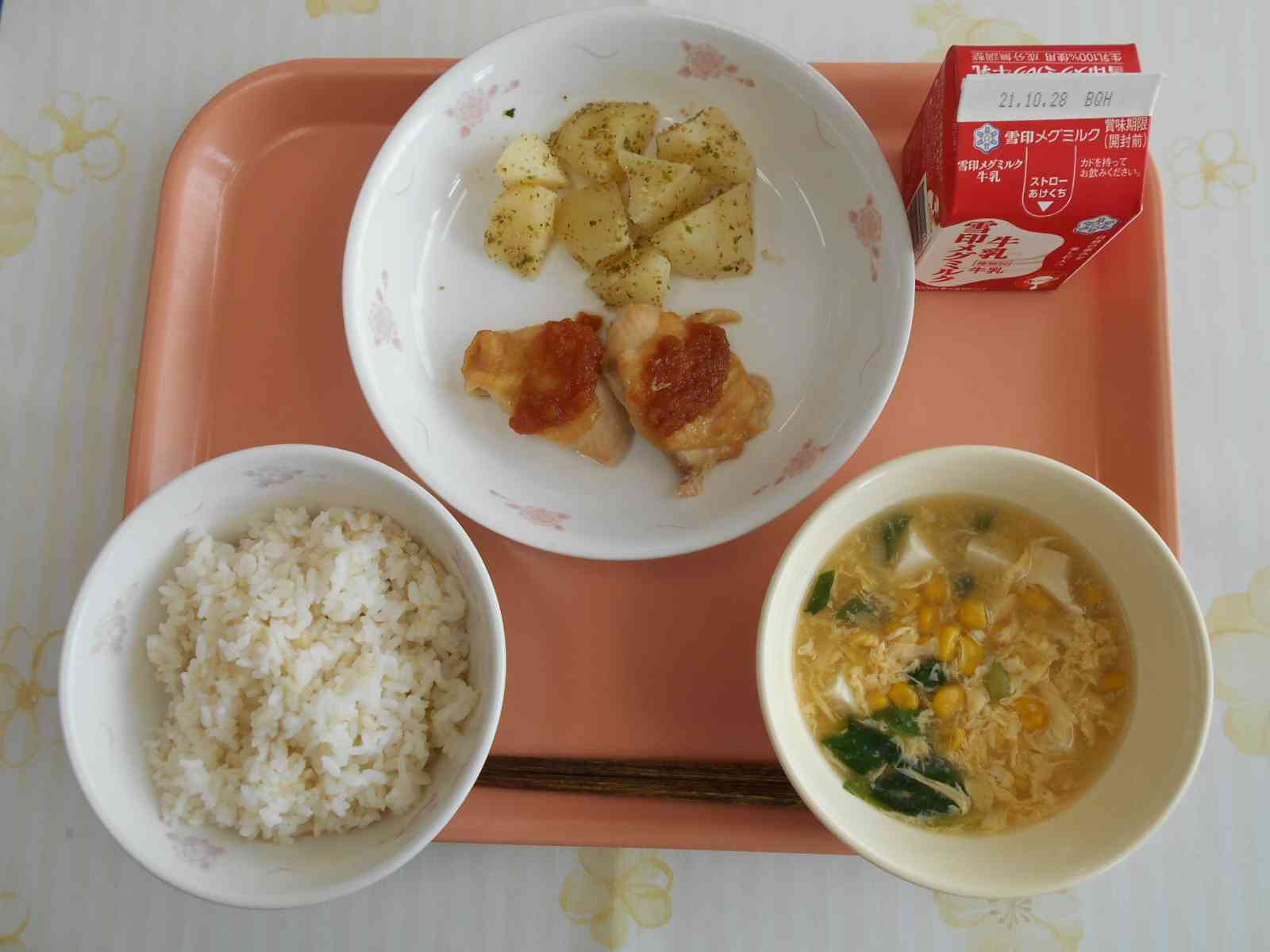 ○牛乳 ○麦ご飯 〇鶏肉のバ-ベキュ-ソ-ス 〇じゃが芋の香味和え 〇青菜とコーンの卵スープ ☆一口メモ☆ 10月16日は、「世界食料デー」。国連が定めた「世界の食料問題を考える日」です。 今日の食材から、世界のことを考えてみましょう。 今日のおかずの鶏肉の鶏を育てるためには、トウモロコシなどのエサをたくさん必要とします。鶏を育てて肉を食べるより、トウモロコシとして食べるほうが世界中のより多くの人たちに食べ物が行き渡るかもしれません。日本で売っているゴマのほとんどは、輸入しているものです。ゴマを育てるときには水が必要です。水が豊かではない国もあります。外国でゴマを育てるときに、私たちたちは水が豊かではない国から水を間接的に輸入してるとも考えられます。 私たちの食生活は、世界中のつながりによって成り立っています。今日食べている食材も無関係ではないのです。世界各地で起こっている食料問題について考えてみませんか。【添付ファイル】