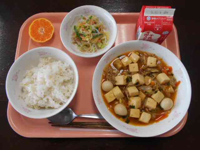 〇牛乳 〇押麦入りご飯 〇豆腐チゲ 〇バンサンスー 〇花みかん ☆一口メモ☆ お豆腐は大豆から作られています。大豆は「畑の肉」と言われてきました。これは、大豆はお肉のようにたんぱく質がとれる食材であるという意味です。 お豆腐もお肉も、どちらもたんぱく質がとれる食材です。お豆腐は大豆からできているので、植物性のたんぱく質です。お肉だけから、たんぱく質をとろうとすると、お肉には油も多いので、血液がドロドロになりやすくなります。お肉だけでなく、大豆や豆製品からもたんぱく質をとるとバランスがよくなってより健康になれます。【添付ファイル】