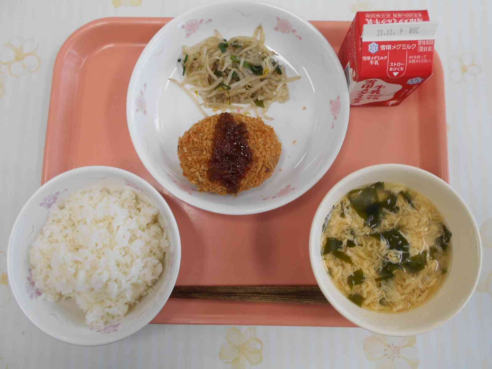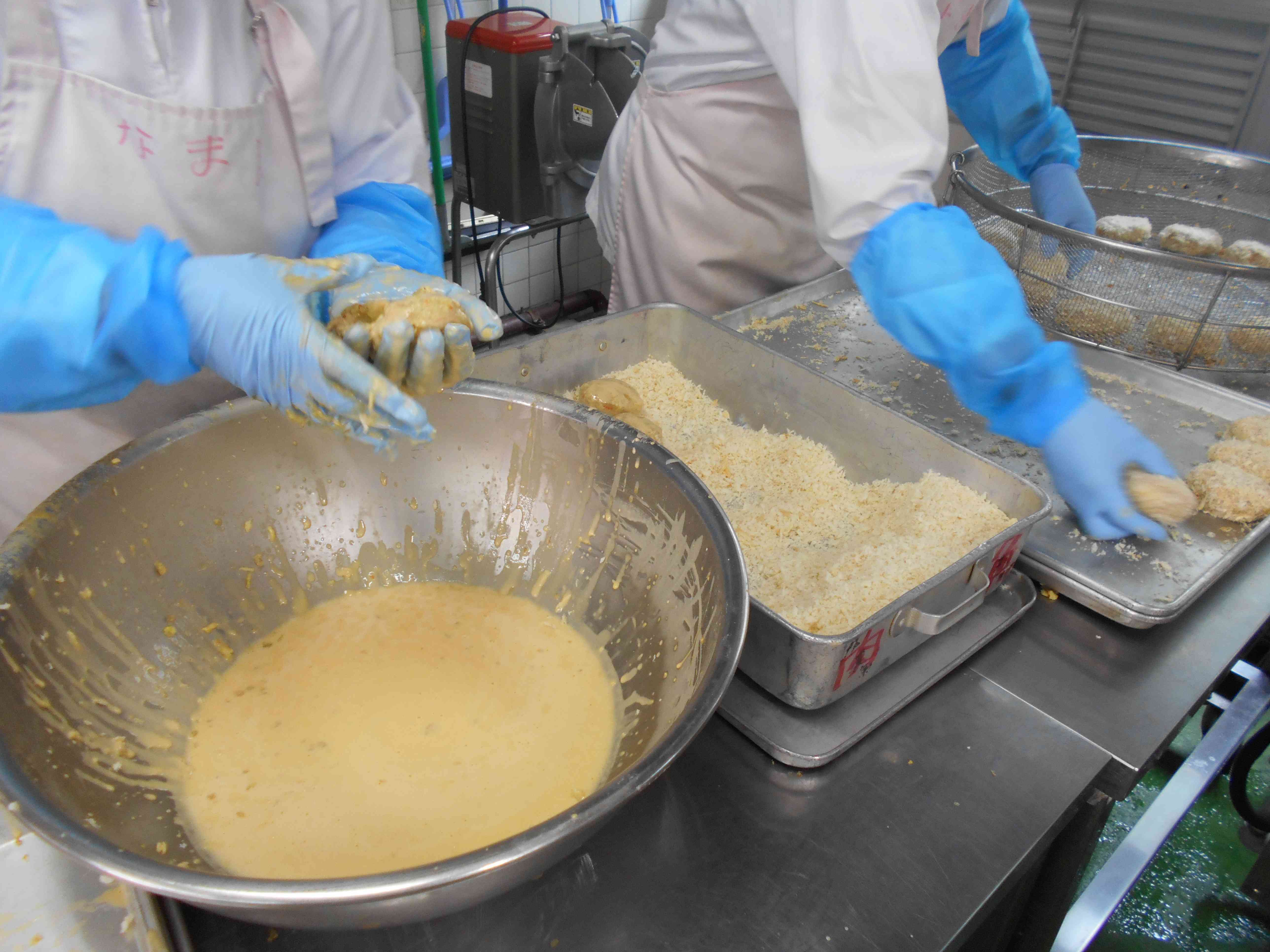 ○牛乳 ○ご飯 〇ごまコロッケ 〇もやしのソテー 〇卵とわかめの味噌汁 ☆一口メモ☆ みそ汁を作るときは、削り節(けずりぶし)とコンブからおだしをひいています。また、削り節は、異なる種類の削り節を混ぜています。かつおの削り節とそうだがつおの削り節をブレンドして、給食のようにたくさんの量を調理するときでも、おいしく食べられるように工夫をしています。かつおの削り節は、香りがいい特徴があり、そうだがつおの削り節は、味とうまみが強い特徴があります。ブレンドすることで、良い所どりのおだしになっています。 写真2枚目 給食のコロッケは手作りです。約300個ものコロッケを丸めてくれています。 じゃがいもを洗って、蒸して、つぶして、具を炒めて、混ぜて、丸めて、揚げて・・・ コロッケ作りには本当にたくさんの工程があります。 コロッケ作りと並行して、他の調理員さんが手分けして他の料理の調理を進めています。 いつも給食時間に間に合わせて作ってくれる調理員さんに感謝です! 写真3枚目 小判型に丸めたコロッケが崩れないように、ザルに入れて優しく油で揚げています。【添付ファイル】