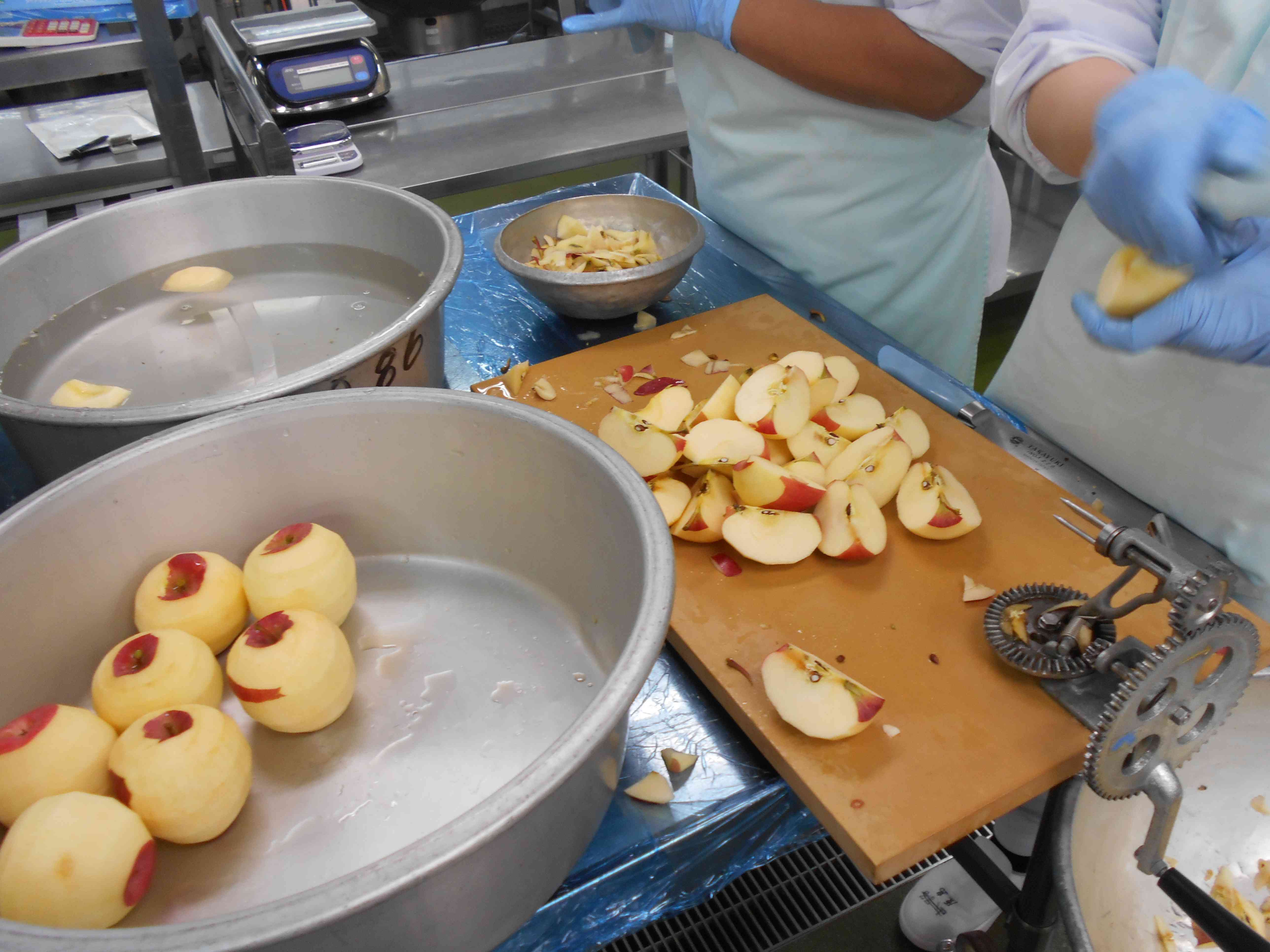 ○牛乳 ○ターメリックライス 〇チリコンカン 〇海藻(かいそう)入りサラダ 〇りんご ☆一口メモ☆ チリコンカンはお豆たっぷりのアメリカの料理です。もともとは、メキシコ北部からアメリカ南部で生まれたメキシコでもよく食べられる料理でもあります。オレガノ、こしょう、クミン、チリパウダーといった複数のスパイス、ハーブを使って、香りよく仕上げました。 写真2枚目 りんごの皮は、りんご皮むき器(写真右端)という機械を使ってむきました。 中心の芯や皮のむき残しは、包丁を使って1個ずつ取り除きます。 今日のりんごは70個以上用意しました。 果物は火を使う調理はしませんが、調理員さんの丁寧な作業を経て教室に届けています。【添付ファイル】
