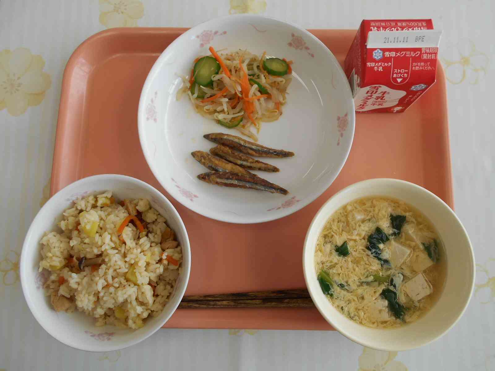 ○牛乳 ○秋の香りご飯 〇きびなごのから揚げ 〇ごま酢和え 〇かきたま汁 ☆一口メモ☆ 秋の味覚、きのこ、さつまいもを炊き込んだご飯です。きのこは、スーパーには1年中並んでいますが、本来の旬は秋です。きのこには、骨を強くするのを手助けしてくれるビタミンDが豊富です。骨にはカルシウムがつまっていますが、ビタミンDがそのカルシウムの吸収を良くするはたらきをしてくれます。