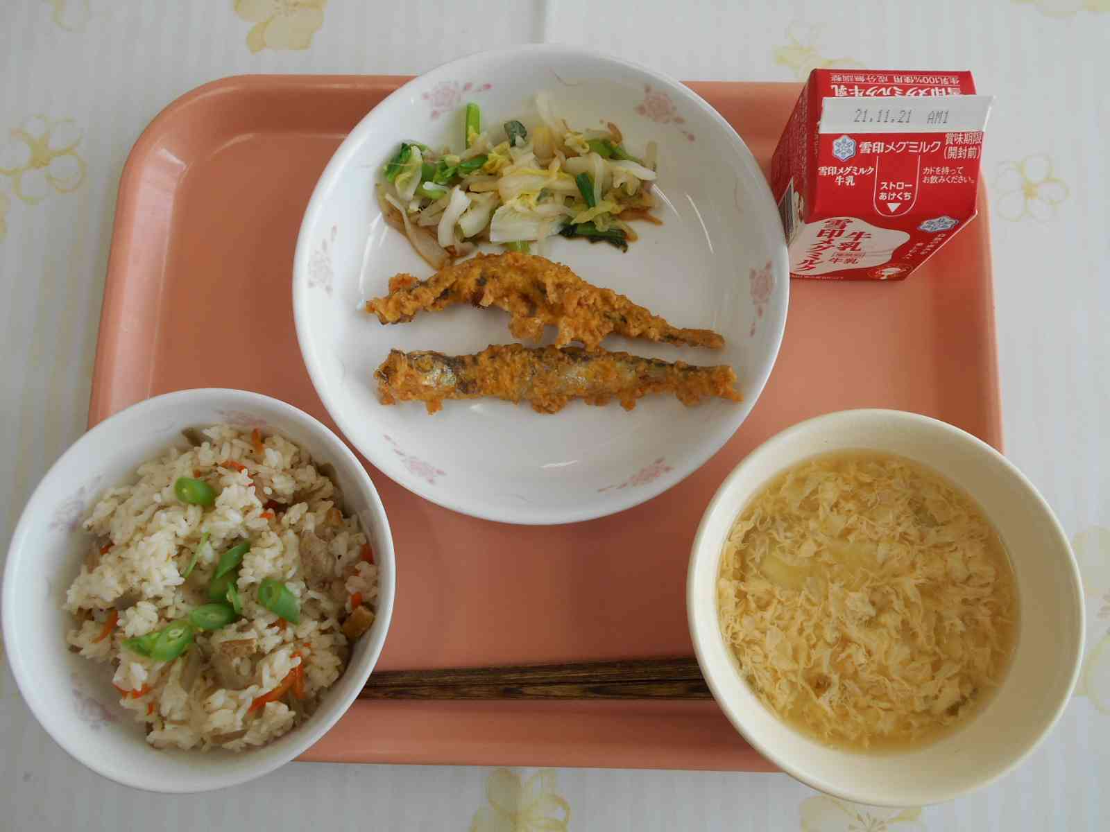 ○牛乳 ○豚肉とごぼうの炊き込みご飯 〇ししゃものもみじ揚げ 〇だし醤油(じょうゆ)のお浸し 〇めかたま汁 ☆一口メモ☆ もみじ揚げとは、衣に赤色など、もみじの葉のように色をつけて揚げてつくる、秋にぴったりの料理です。今日の給食では、すりおろしたにんじんを衣に混ぜて色をつけています。 春・夏・秋・冬の四季がある日本では料理に季節感を出して、季節の移ろいを楽しめます。今日の給食では、もみじをイメージした彩りを目で感じ取ることができます。他にも、旬の食材を積極的に取り入れたり、料理を盛り付ける器の素材や色、絵柄を季節ごとに変えたり、様々な季節の楽しみ方があります。【添付ファイル】