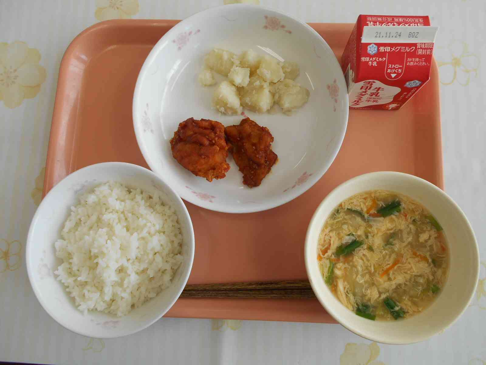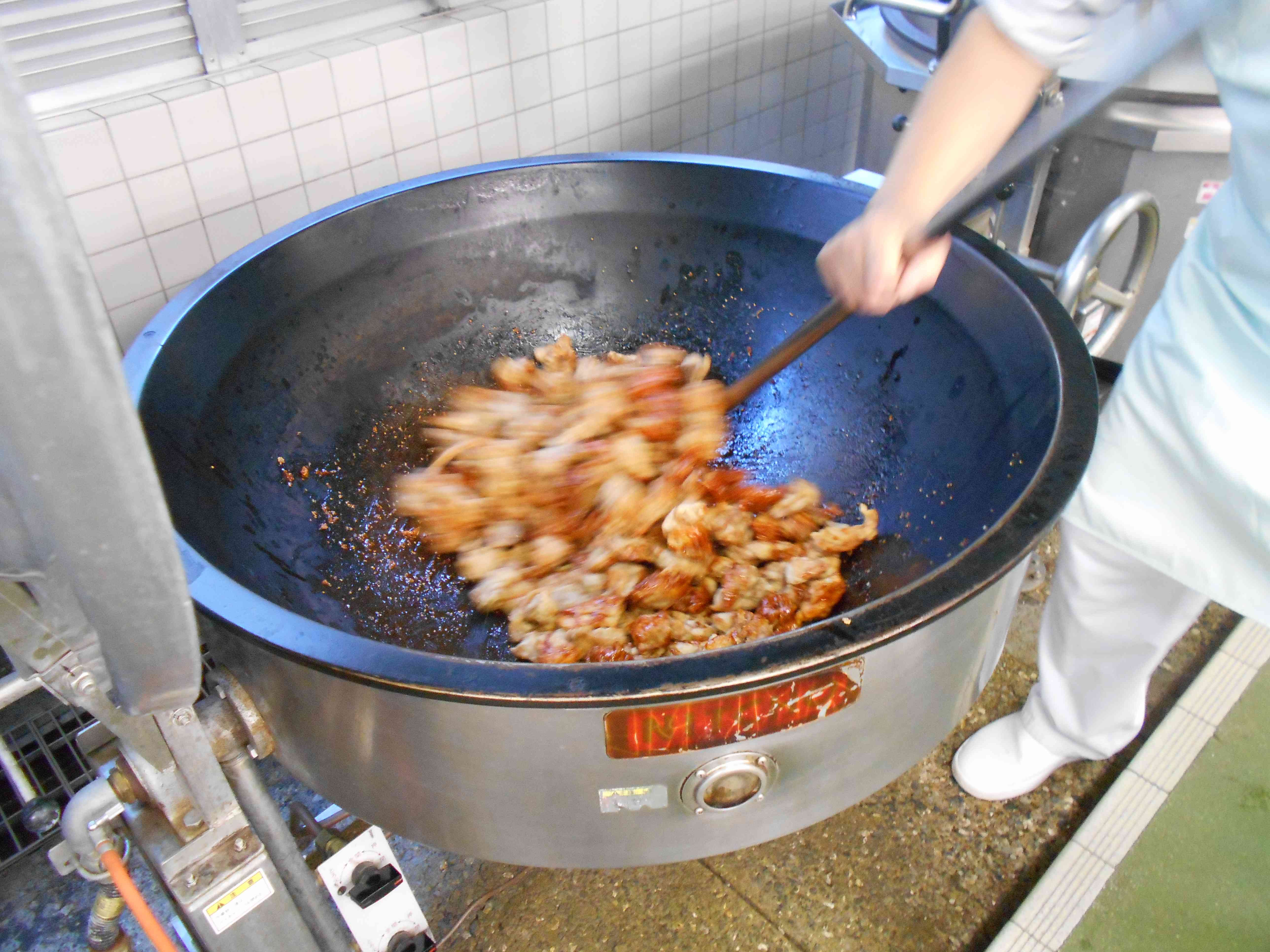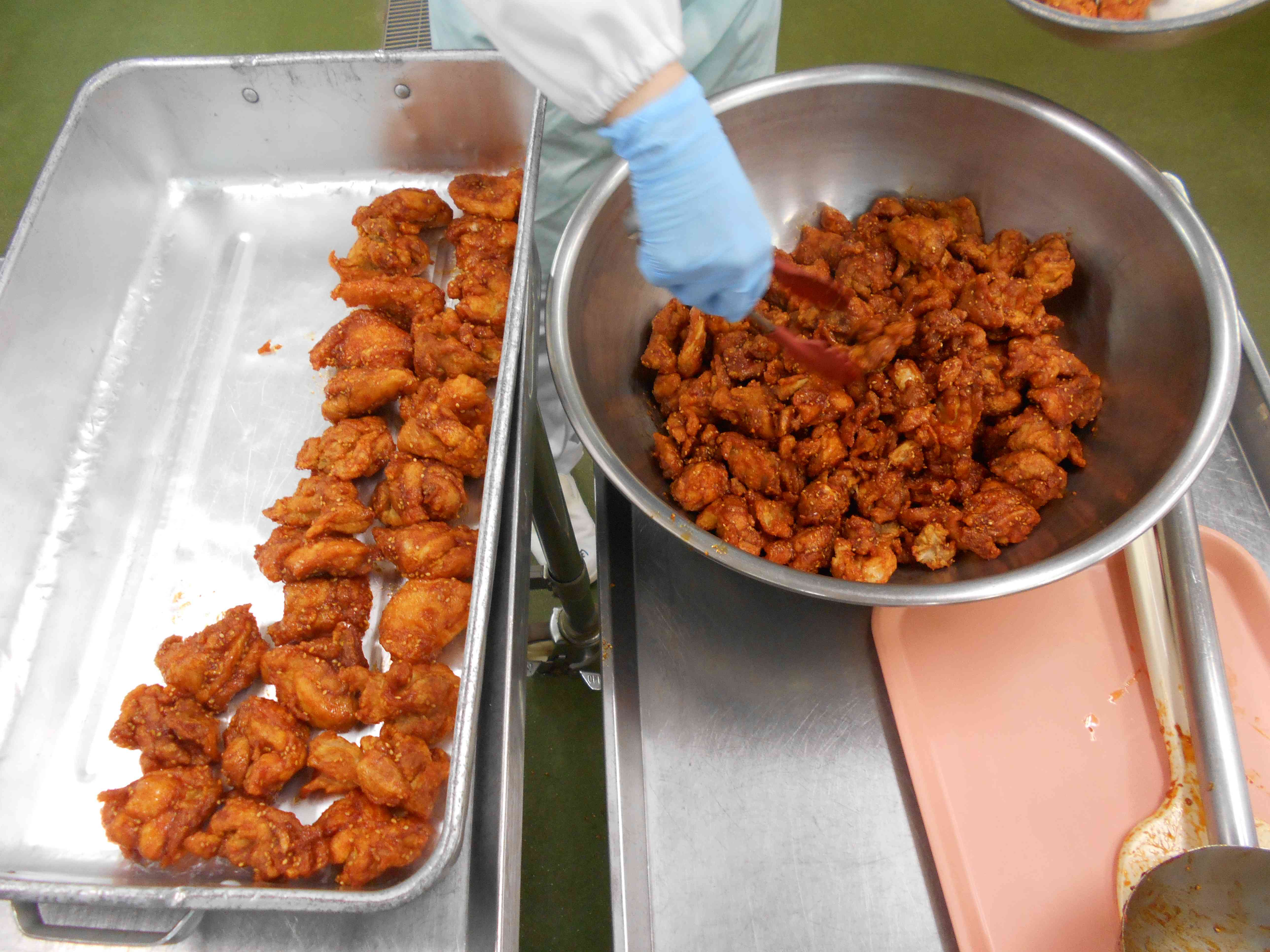 ○牛乳 ○ご飯 〇ヤムニョムチキン(韓国風フライドチキン) 〇粉ふき芋 〇にらたまスープ ☆一口メモ☆ ヤムニョムチキンは、韓国のフライドチキンです。「ヤムニョム」と呼ばれる甘辛いソースをフライドチキンにからめたもので、韓国では大根の漬物と炭酸飲料と一緒に食べられることが多いそうです。ヤムニョムソースは、コチュジャンをベースに、ニンニクや砂糖を混ぜたソースでごはんが進みます。給食では辛さ控えめに作りました。 写真2枚目 ヤムニョムチキンは、鶏肉を油で揚げた後にタレにからめました。 一度に全員分のからあげにタレをからめると肉が崩れてしまうので、何回かに分けて少量ずつからめています。 写真3枚目 食欲をそそる色に仕上がりました。 ごはんに合う味つけで、ごはんもチキンもとてもよく食べてくれていました。【添付ファイル】