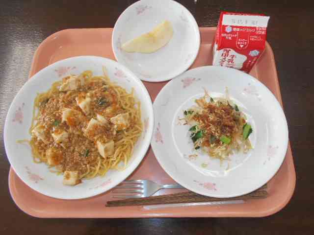 〇牛乳 〇マーボー麺 〇じゃこと大根のサラダ 〇ラ・フランス ☆一口メモ☆ 今日の果物は、ラフランスという洋なしで、11月が旬です。9月が旬の和なしとは全く違う食感です。和なしは、しゃきしゃきした食感がおいしいなしですが、ラフランスはやわらかくなるほどあまくておいしくなります。初めて食べた人は、この食感に驚くこともあるようですが、ラフランスはやわらかいのは食べ頃になった証拠です。ひょうたんのようないびつな形をしていますが、調理員さんが丁寧に皮をむいてくれました。【添付ファイル】