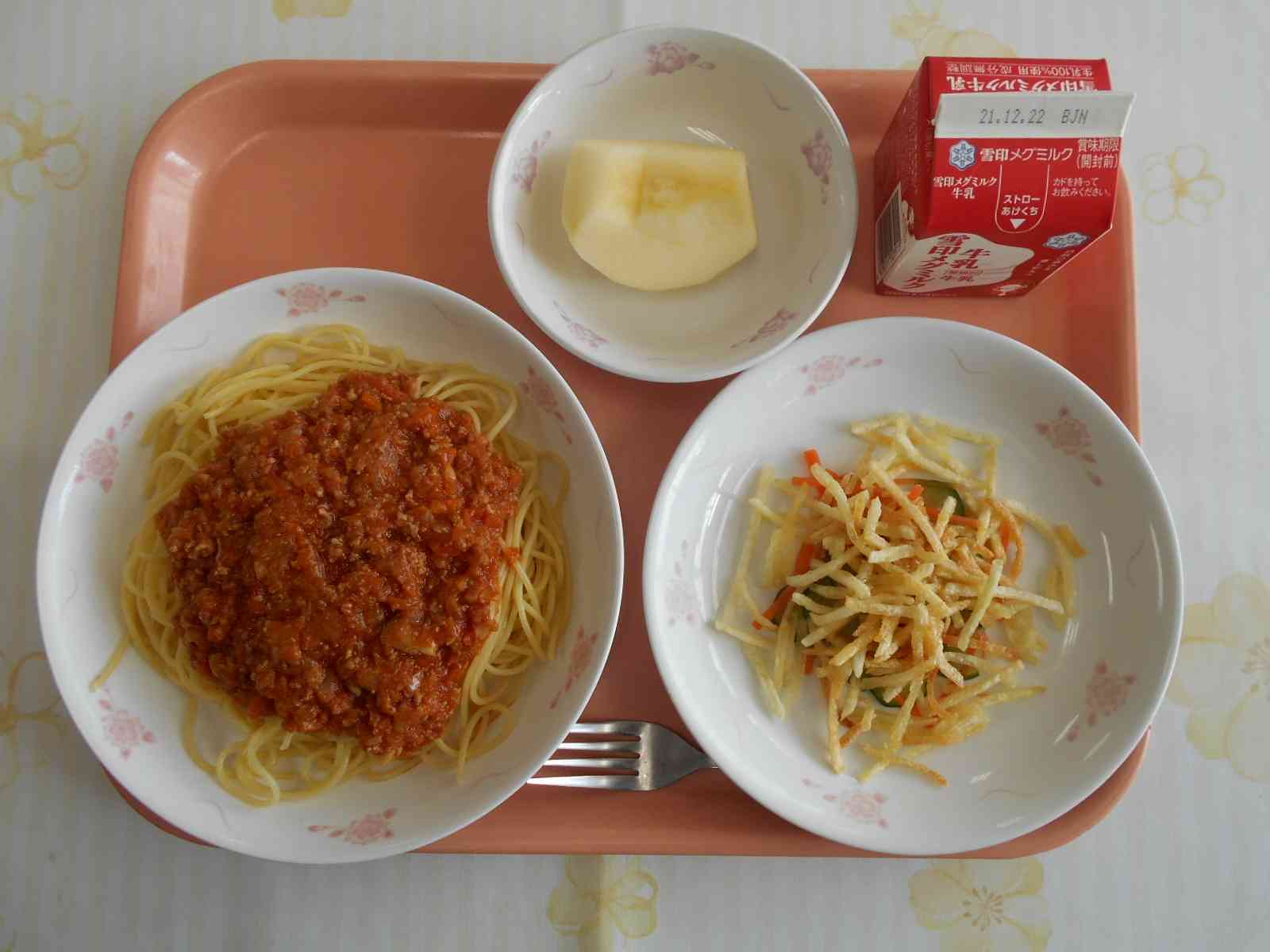 ○牛乳 ○スパゲッティミートソース 〇じゃが芋のハニーサラダ 〇りんご(シナノゴールドの予定です ☆一口メモ☆ 今日のりんごはシナノゴールドです。黄色い皮で、酸味と甘みのバランスが絶妙で、かおりがよいことが特徴です。 りんごは、青森県や長野県などのすずしい地域でよく育ちます。しかし、温暖化の影響が出始めているそうです。平均気温が上がることで、皮があざやかな色になりにくくなったり、果肉がやわらかくなったり、病気や虫の被害が出ています。いっぽうで、酸味が減って昔よりあまくなったという研究データもあります。地球温暖化が、果物にも影響を及ぼしていることが分かりますね。【添付ファイル】