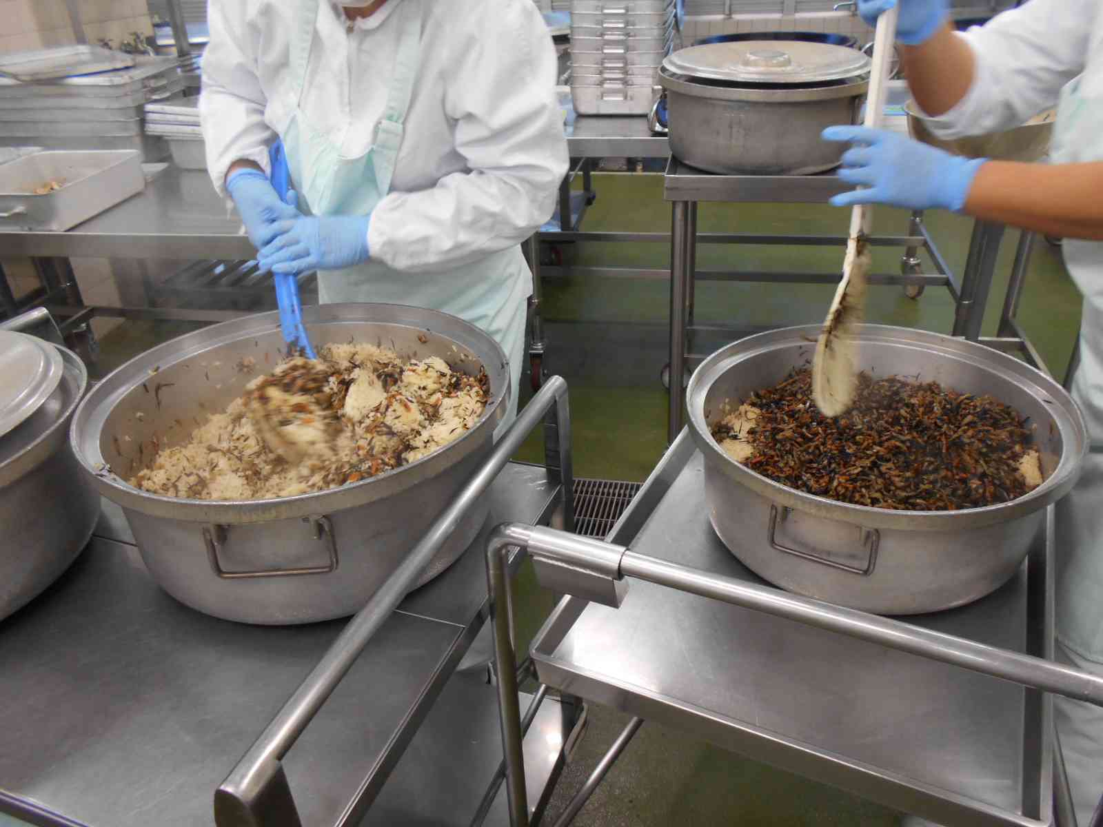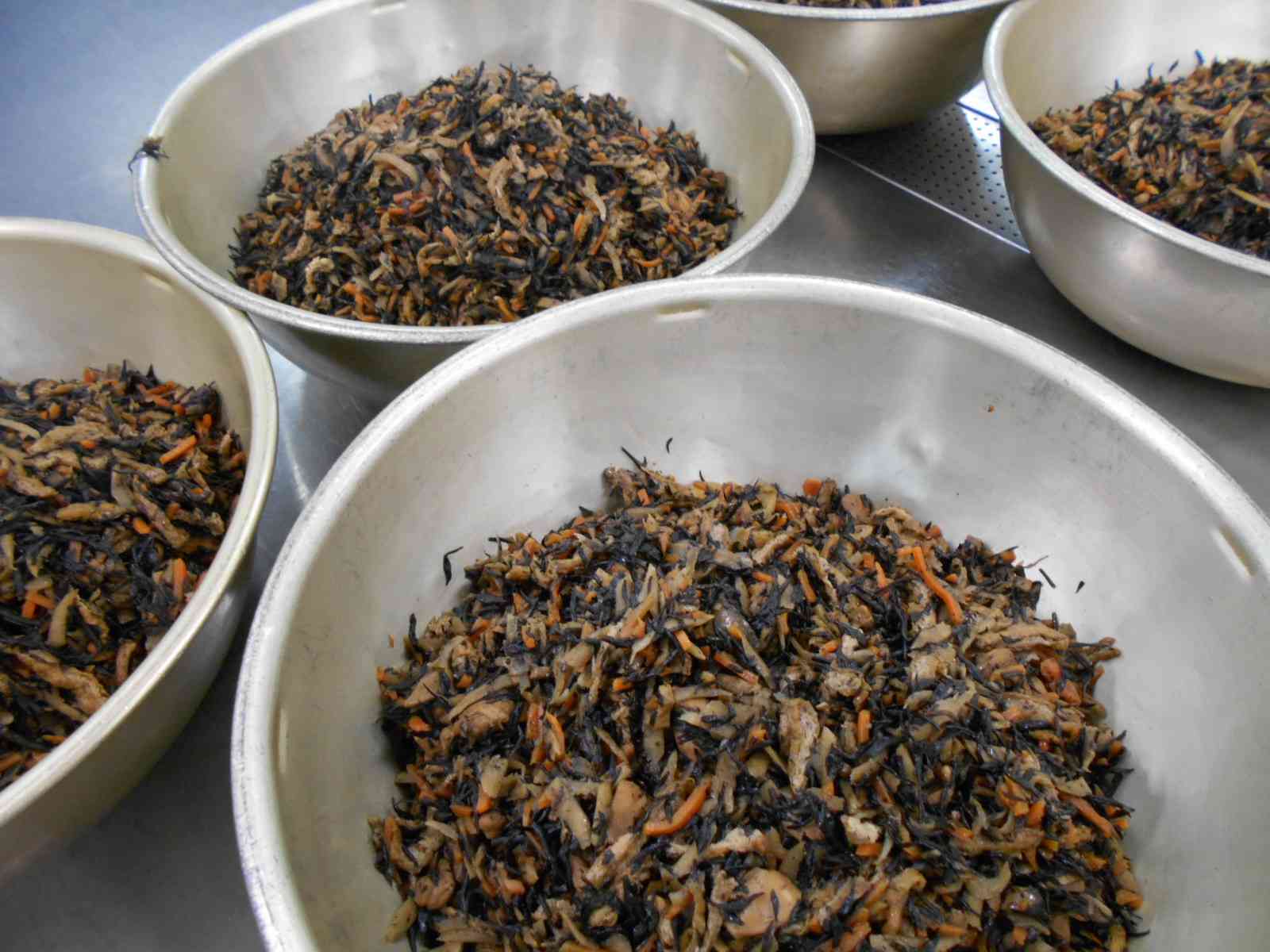 ○牛乳 ○五目ひじきご飯 〇ししゃものごま焼き 〇もやし和え 〇かきたま汁 ☆一口メモ☆ 五目ごはんは、お米と具材を合わせて炊いた、日本を代表するお米料理のひとつです。ごはんにしみこんだ食材の香りやうまみを味わえます。ここでクイズです。関西地方では、五目ごはんを別の料理名で呼んでいます。それは次のうちどれでしょうか。 (1)ばくだんごはん (2)かやくごはん (3)はなびごはん ・・・答えは(2)かやくごはんです。関西地方では、五目ご飯のことをかやくごはんと呼びます。かやくは漢字で書くと「加薬」です。「火薬」ではありません。 写真2枚目 給食の炊きこみご飯の作り方は、具材を先に煮ておいて、煮汁は炊飯時に一緒に炊きこみ、 具材は炊き上がったご飯に後から混ぜ込む方法です。 具材はしっかり味がしみて、お米の部分は控えめな塩加減になるので、味にメリハリのある炊き込みごはんになります。 すべて均一の味よりも、味に濃淡がある方が、少ない調味料でおいしく食べられるとも言われています。 写真は、炊飯釜の数に合わせて具材を5つのボウルに分けたところです。 ひじきや油揚げに味がしみて、そのまま食べてもおいしい状態です。 写真3枚目 具材の煮汁で炊いたごはんと、具材をよく混ぜて完成です。【添付ファイル】