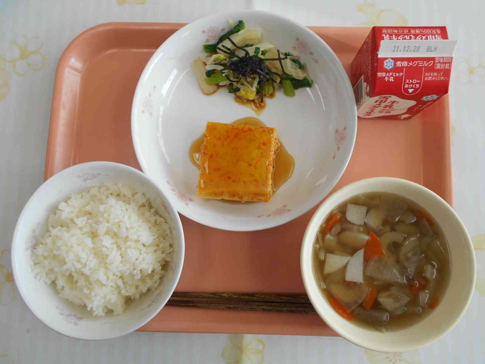 ○牛乳 ○ご飯 〇擬製(ぎせい)豆腐 〇磯香和え(いそかあえ) 〇のっぺい汁 ☆一口メモ☆ 擬製豆腐は細かくした豆腐を他の食材と混ぜてから、再び豆腐の形に整えて焼いたものです。崩した豆腐を元の形に戻すことから“擬製豆腐”の名がつきました。もともとは、動物性の食べ物を使わない精進料理がもとになった料理です。給食では、肉や卵を使っているので、ひとつの料理で、肉・豆腐・卵・野菜がしっかり食べられる栄養満点な仕上がりになっています。【添付ファイル】