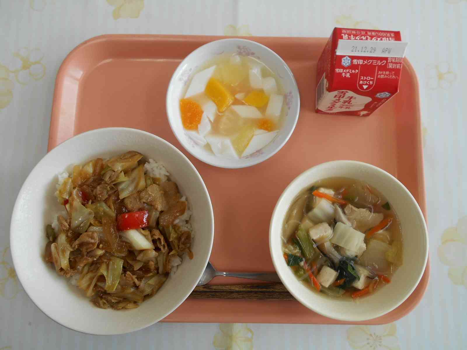 <中華人民共和国の味めぐり> ○牛乳 ○回鍋肉(ホイコーロー)丼 〇春雨(はるさめ)スープ 〇杏仁(あんにん)豆腐 ☆一口メモ☆ 中華人民共和国の味めぐり ホイコーローは、中国の四川の料理です。 スープの春雨は、中国生まれの食材です。 杏仁豆腐は中国生まれのデザートです。 ここでクイズです。杏仁豆腐の杏仁とは、とある植物の種のことです。その植物はなんでしょうか。 (1)ヒマワリ (2)アンズ (3)ブドウ ・・・答えは(2)アンズの種のことです。アンズの種を粉末にしたものと、牛乳、砂糖を混ぜて固めた物が杏仁豆腐です。【添付ファイル】