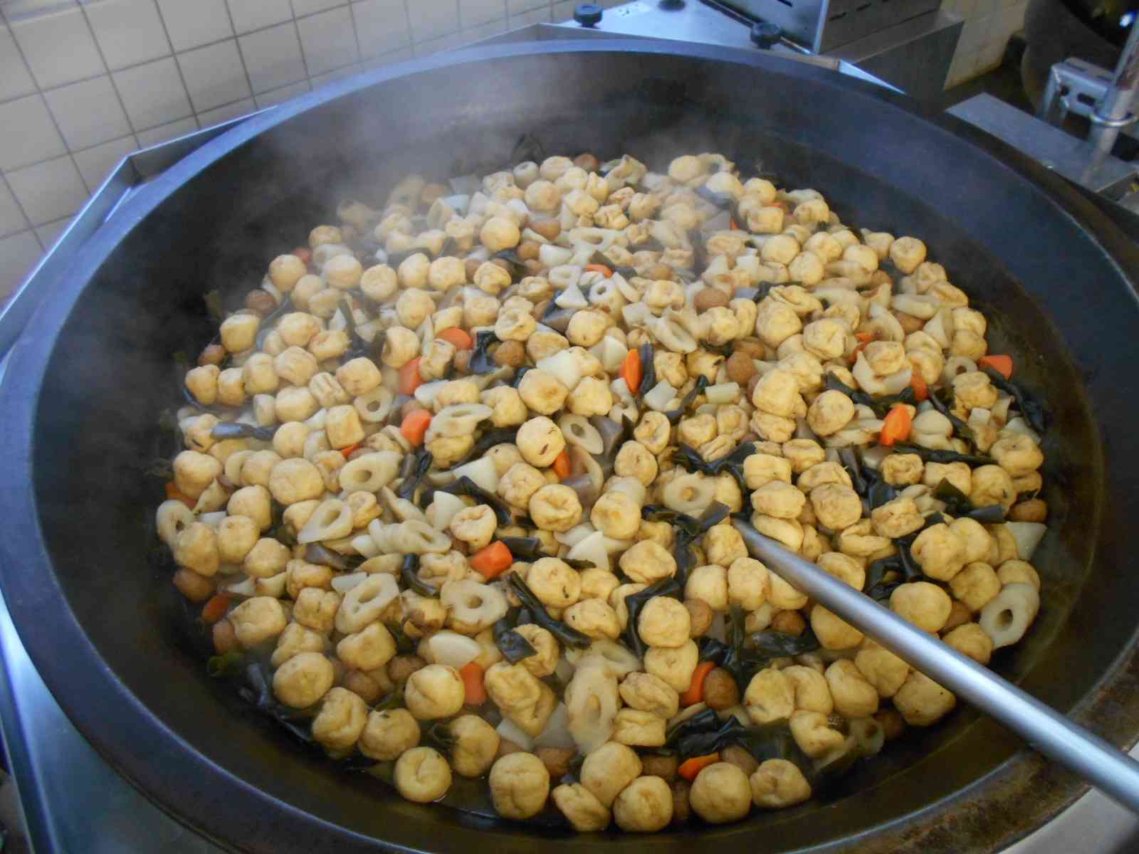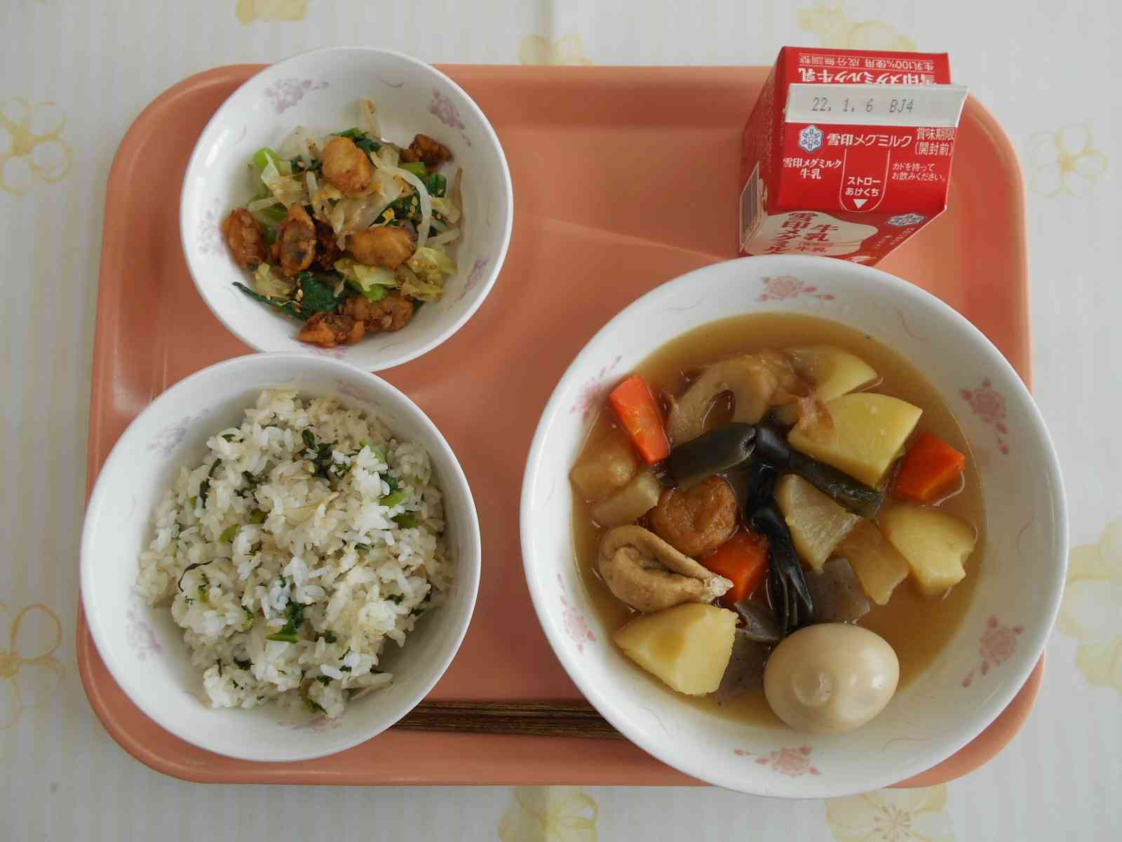 ○牛乳 ○大根葉の菜飯(なめし) 〇おでん(煮卵つき) 〇あさりのカリッとサラダ ☆一口メモ☆ 今日の給食のテーマは、大根使い切りです。菜めしには大根の葉っぱ、おでんには大根の茎と根を使っています。 大根の葉は、濃い緑色の部分で、すぐ部位が分かると思います。では、茎と根はどこでしょうか。白くて太い部分の上の方が茎で、その茎の下の方が根です。根をさらに細かく分類すると、私たちが食べている太い部分が主根です。 主根から細いひげのようなものが生えていますが、それが側根です。 写真2枚目 大根の茎と根(いわゆる「大根」と言われている部分)が入ったおでんです。 大根の他に、じゃがいも、にんじん、こんにゃく、結び昆布、竹輪、がんもどき、揚げボールの具が入っています。 写真3枚目 大根の葉っぱは、ごま油でちりめんじゃこと一緒に炒めてごはんに混ぜ込みました。 栄養士からのお願いです。 明日から冬休みです。給食のない日は、給食がある日と比べてカルシウムの摂取量が少なくなる人が多いそうです。 中学生の時期は、骨を強くするための大切な時期です。 お休みの期間も、カルシウムたっぷりの牛乳やヨーグルト・チーズなどの乳製品をとってください。不足しないようにしてもらえると、将来の骨の健康について安心できます。 乳成分がとれない人も、他の食品からカルシウムをとるように心がけてくださいね。【添付ファイル】