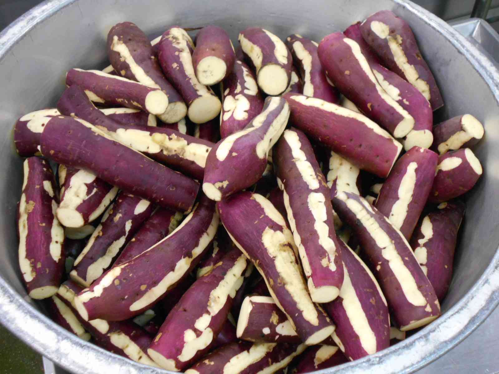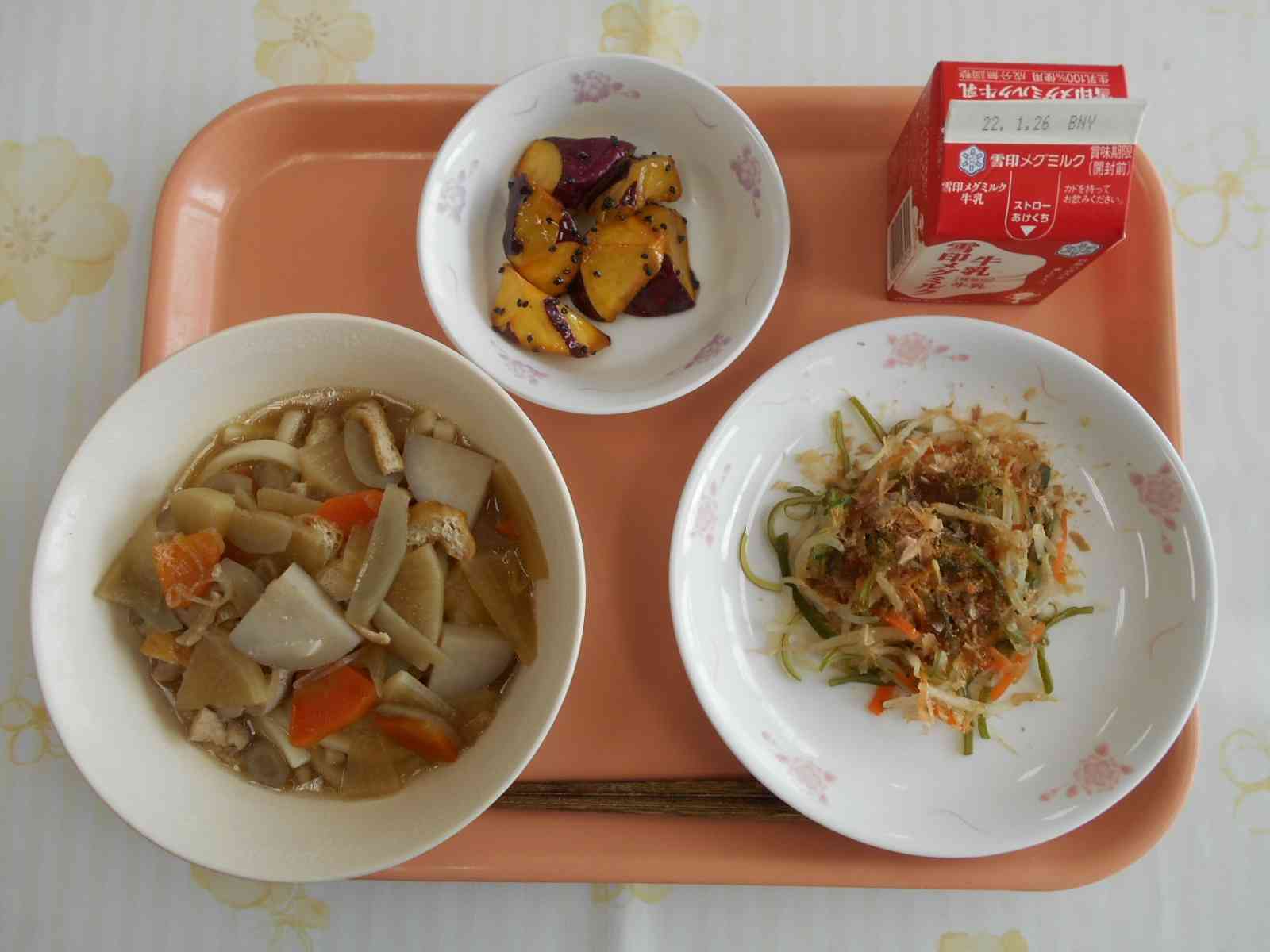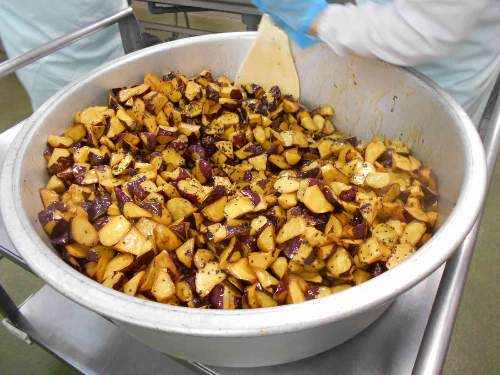 ○牛乳 ○けんちんうどん 〇茎わかめのおかかサラダ 〇大学芋 ☆一口メモ☆ 学芋は、素朴なさつまいもにあまい蜜がからんでおいしい料理ですね。「大学芋」の名前の由来は、今から100年前、大正時代に当時の「大学生が好んで食べていた」という説からきていると考えられています。大学いもを作るときのコツは、さつまいもを低温の油でじっくり揚げることです。揚げ油の温度が高いと、さつまいもの中が生なのに外側が焦げてしまったり、あまくない上にパサパサの食感になってしまいます。大学芋はシンプルな料理に見えて、なかなか奥が深い料理です。 写真2枚目 大学芋用のさつまいもは25キログラムで、100本以上使いました。 皮の傷ついている部分は、取り除いてから大きめにカットします。 大きめに切ると油で揚げるときに、中心までゆっくり熱が伝わるので、あまくなりやすいです。 写真3枚目 低温でじっくり揚げたさつまいもに、あまい蜜と黒ごまをからめて完成です。 蜜がからんださつまいもがつやつやしているのが、写真から伝わるでしょうか。 蜜には砂糖と水あめ、しょうゆ、お酢も入っています。お酢は少量なので、味では分かりませんが時間が経っても蜜がかたくならないようにしてくれます。【添付ファイル】